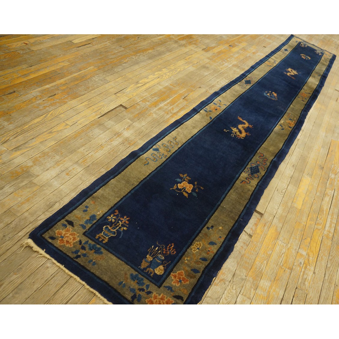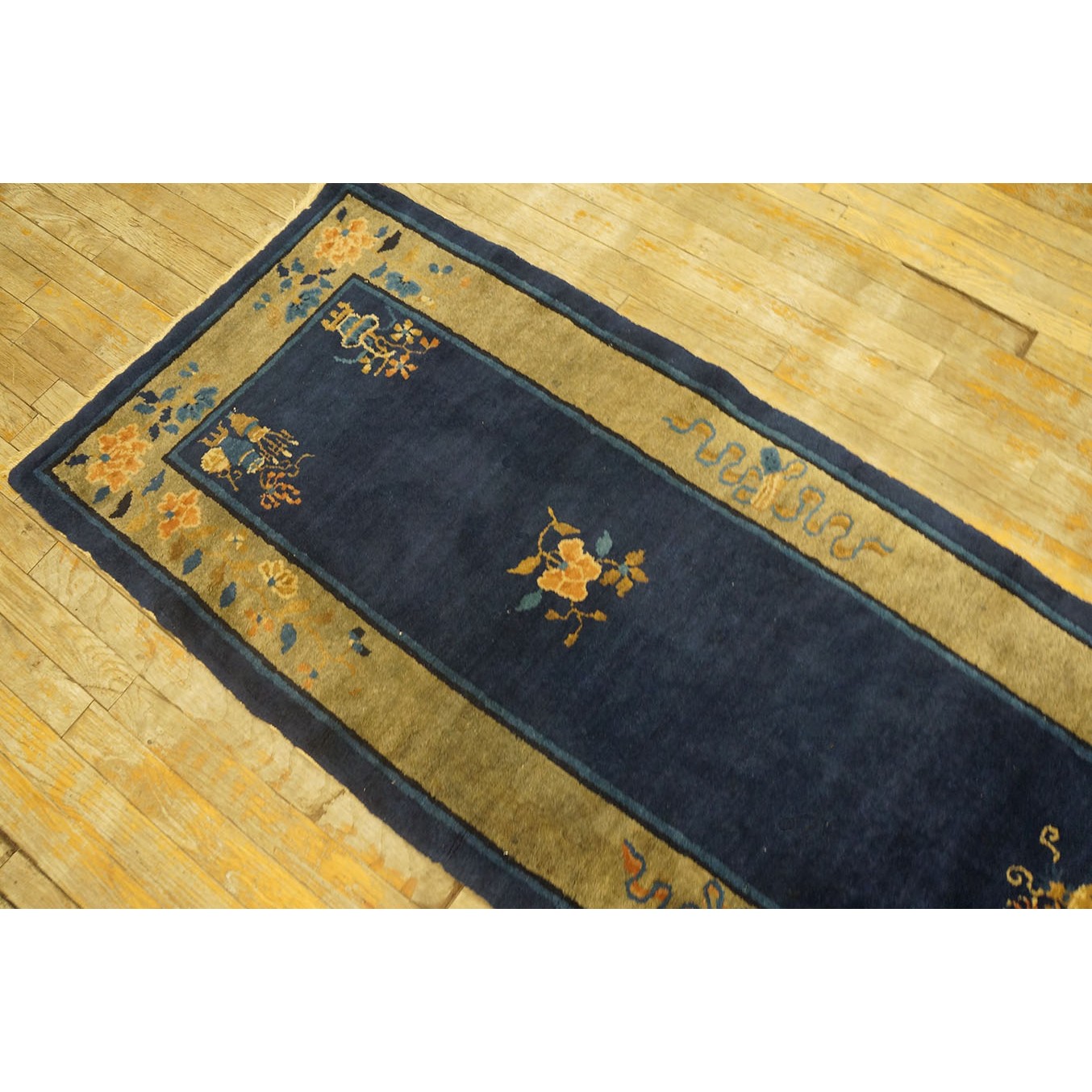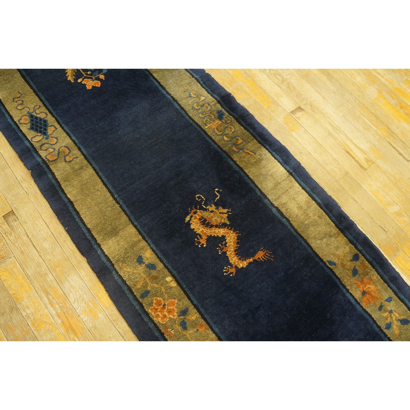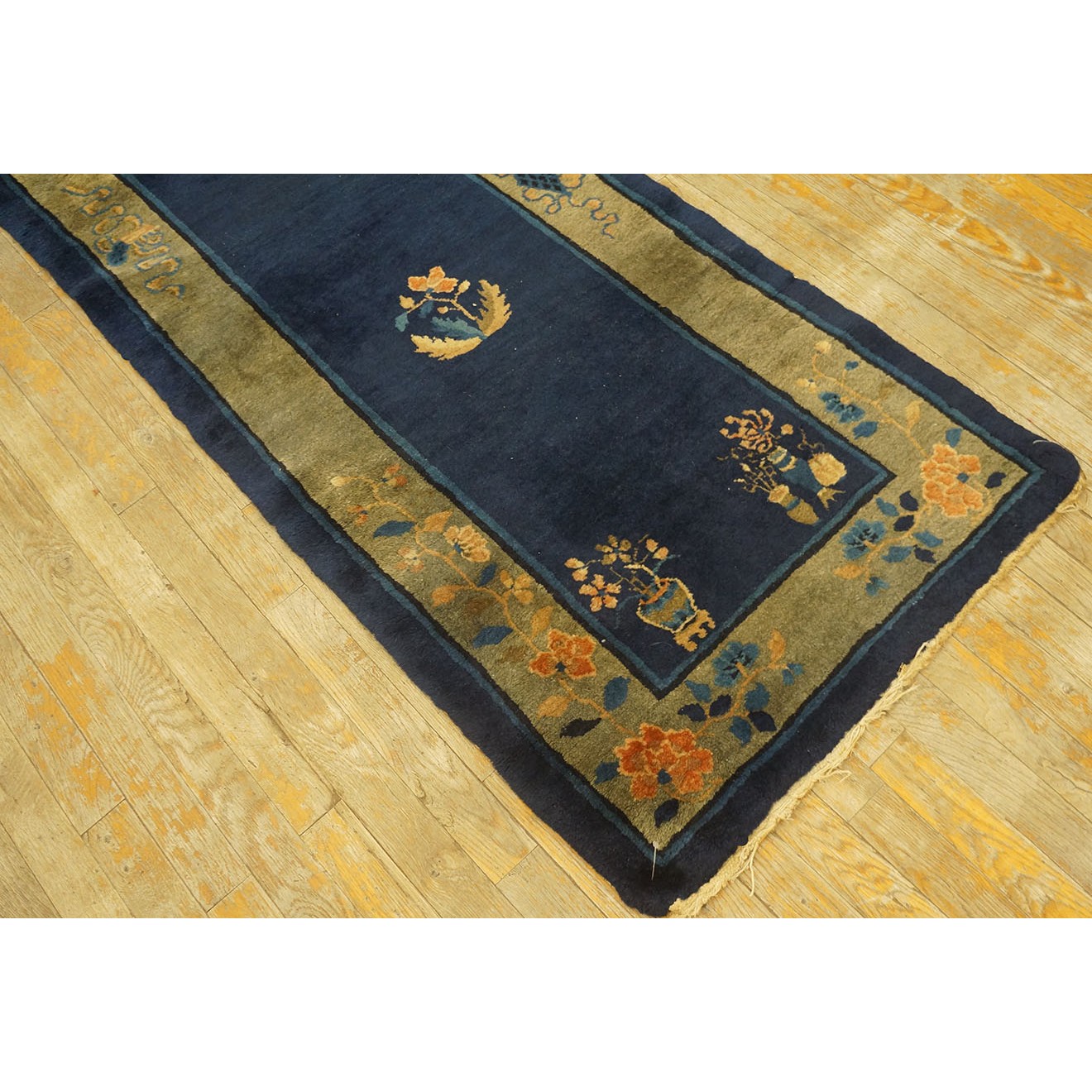 DescriptionChineseCarpets made in China proper. See entries Ningshia, Peking, Art Deco. Chinese - PekingThe commercial Peking carpet is a later 19th century development, begun by importing weaves from Ningshia (see entry) to create and export industry aimed at Western markets. The foundation is cotton and the pile is a good quality carpet wool which takes dyes particularly well. The neat medium weave is in Persian (asymmetric) knots. Designs are strictly Chinese and the whole motif repertoire of Chinese art is employed. Blue and white is the most popular color combination and red is particularly rare. Sizes tend to 9 x 12 and larger, and few small pieces appear. For a short time in the early 1920s Persian designs were woven to capitalize on the death of new Iranian goods. The industry decimated by the Communist Revolution relocated to the Pearl River area. There is a good supply of antique carpets at reasonable prices. | |