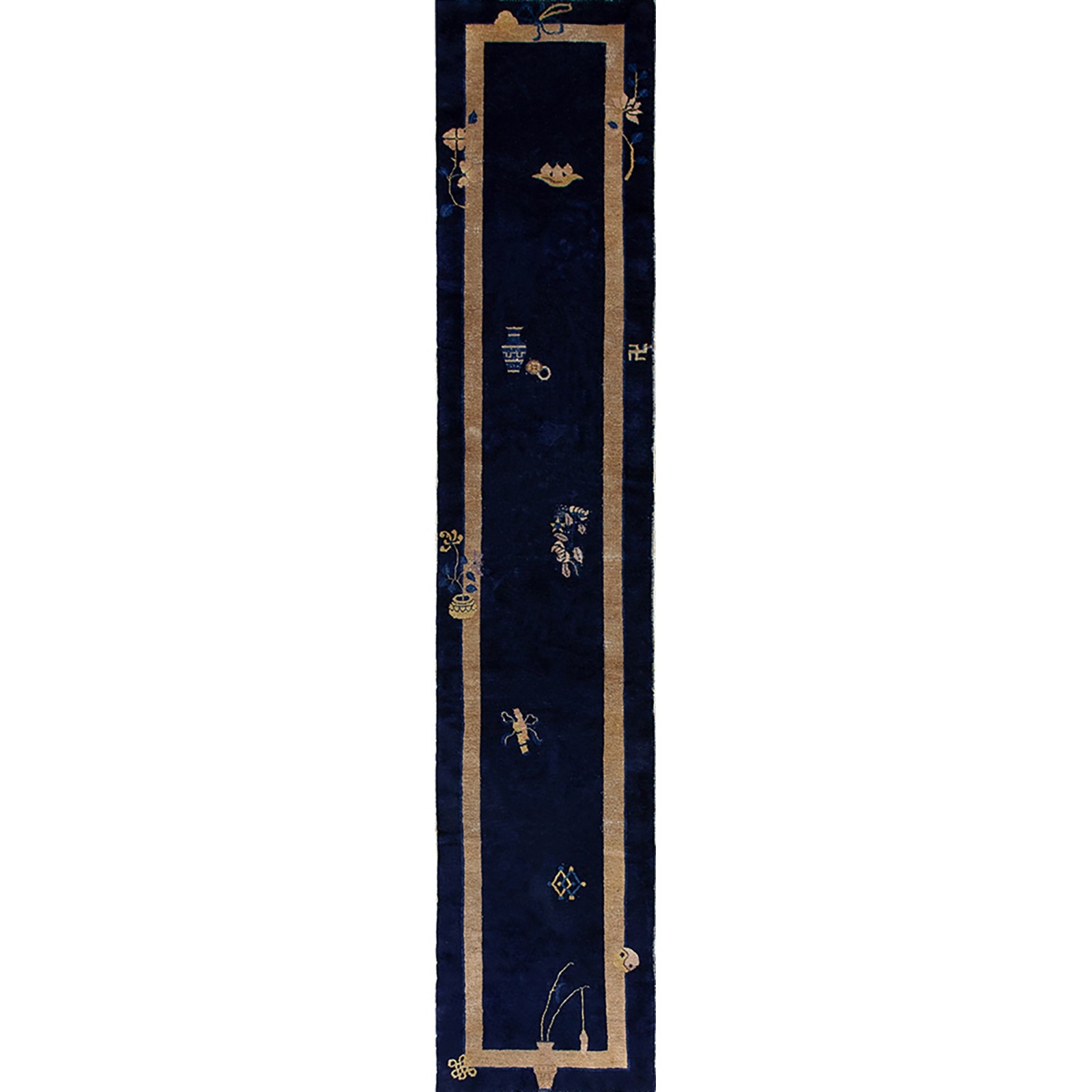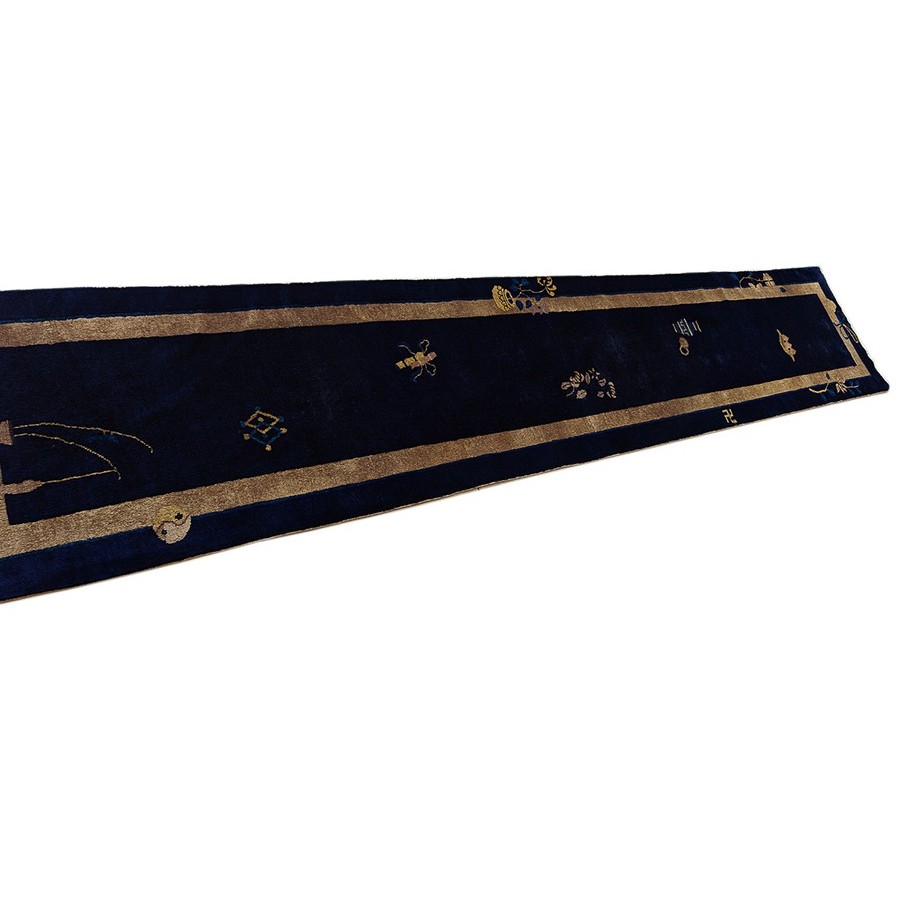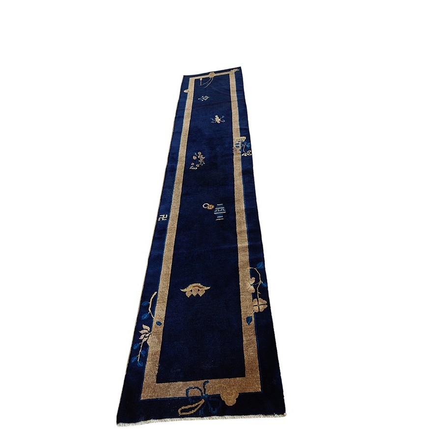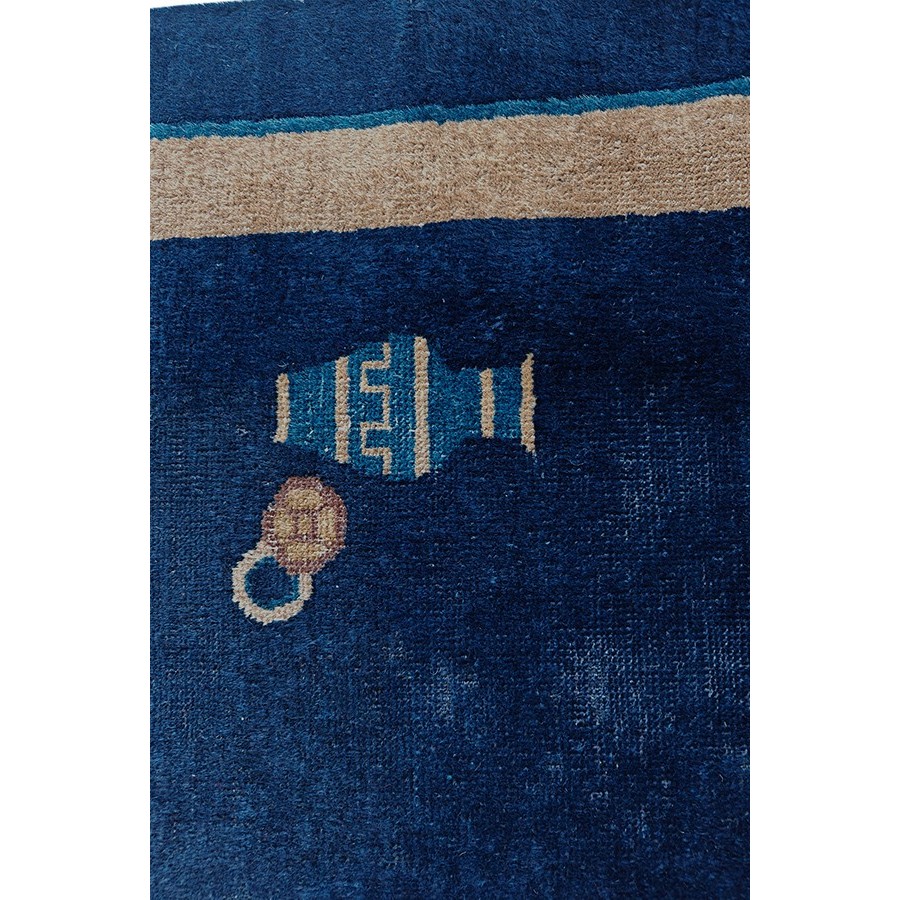 DescriptionChineseCarpets made in China proper. See entries Ningshia, Peking, Art Deco. Chinese - PekingThe commercial Peking carpet is a later 19th century development, begun by importing weaves from Ningshia (see entry) to create and export industry aimed at Western markets. The foundation is cotton and the pile is a good quality carpet wool which takes dyes particularly well. The neat medium weave is in Persian (asymmetric) knots. Designs are strictly Chinese and the whole motif repertoire of Chinese art is employed. Blue and white is the most popular color combination and red is particularly rare. Sizes tend to 9 x 12 and larger, and few small pieces appear. For a short time in the early 1920s Persian designs were woven to capitalize on the death of new Iranian goods. The industry decimated by the Communist Revolution relocated to the Pearl River area. There is a good supply of antique carpets at reasonable prices. | |