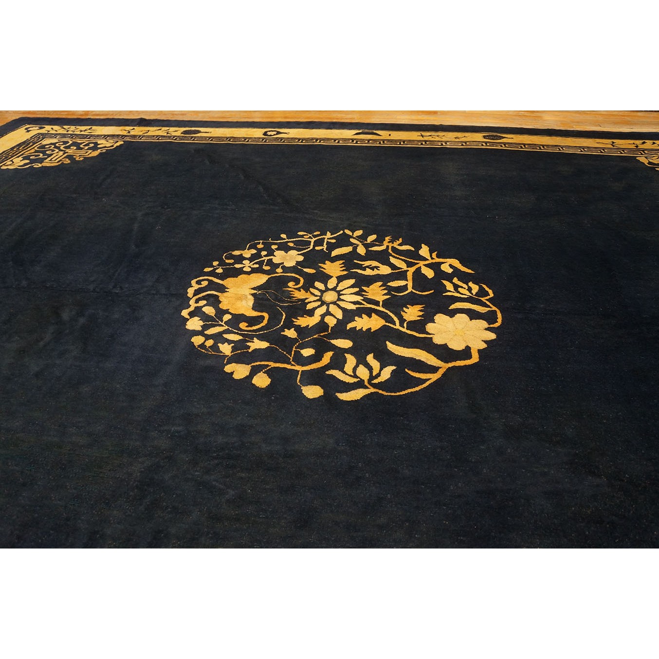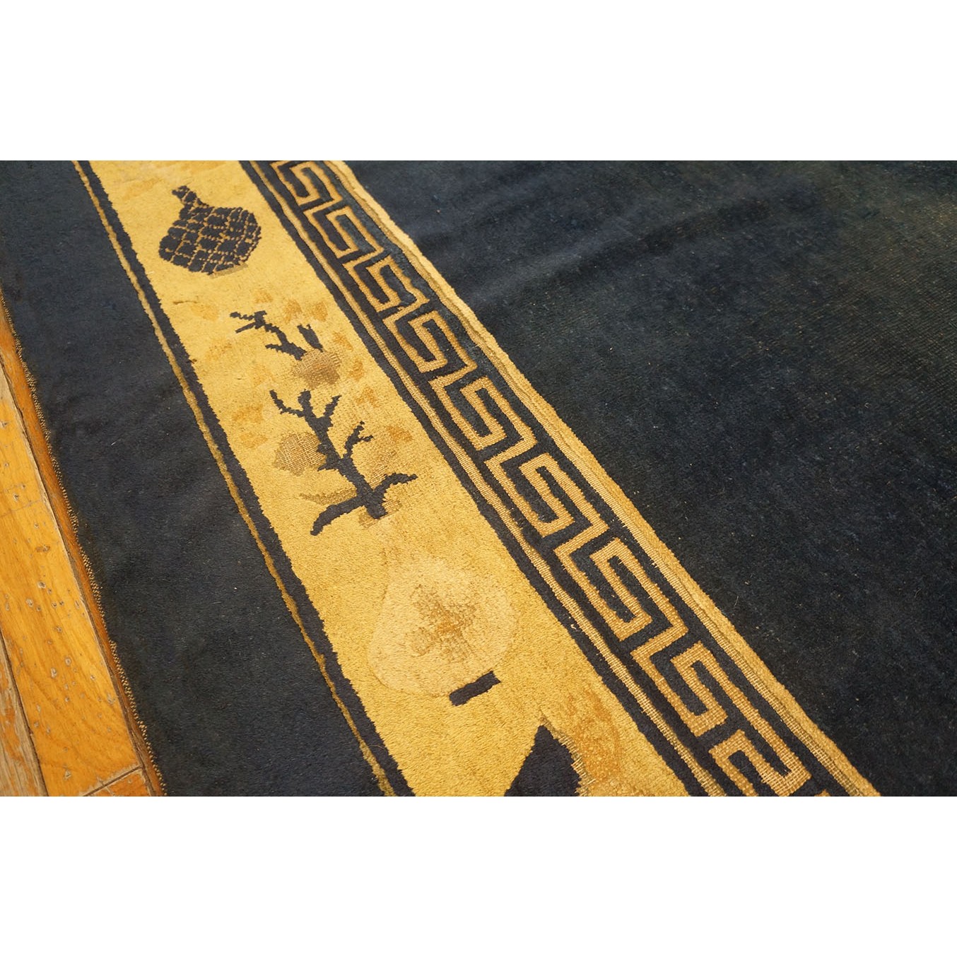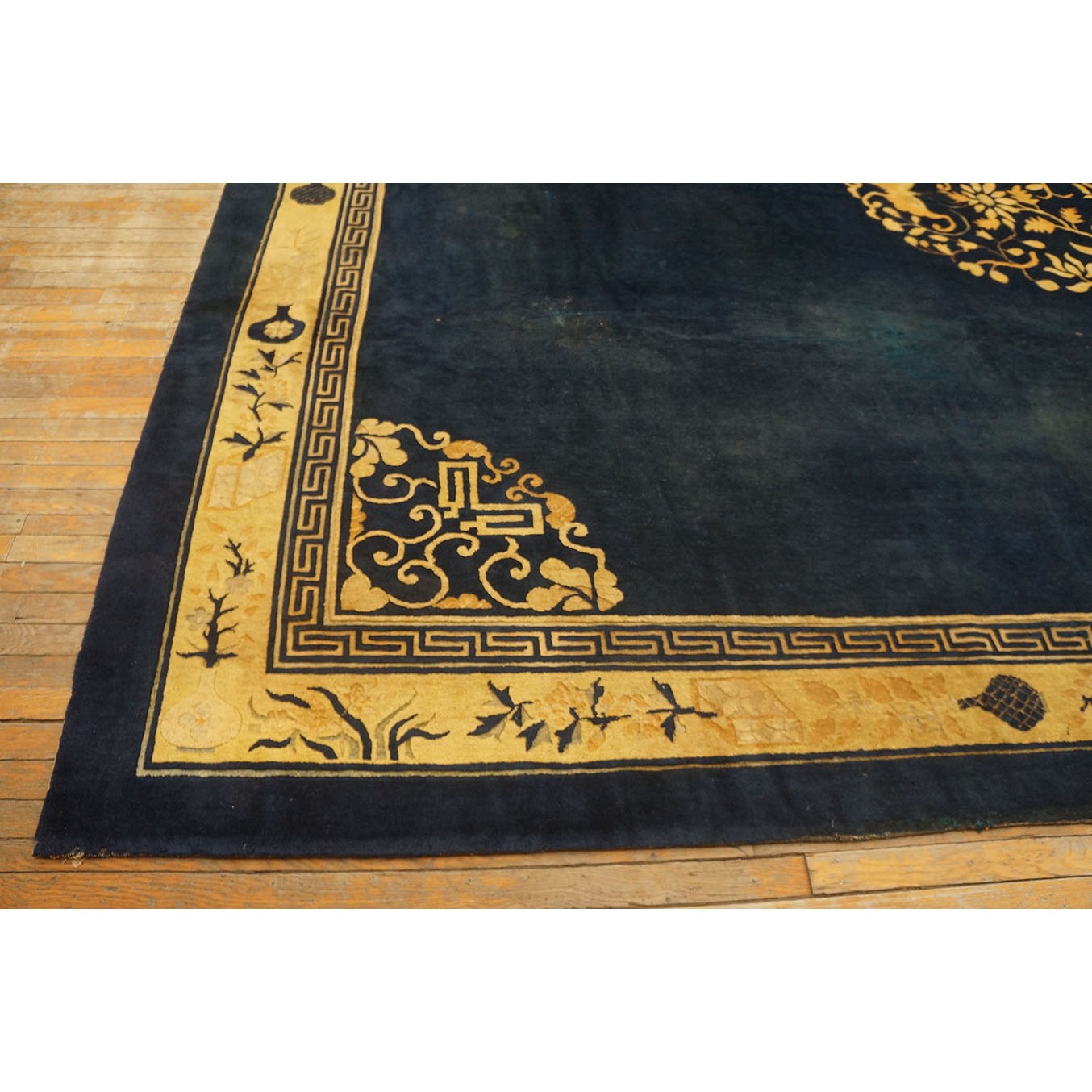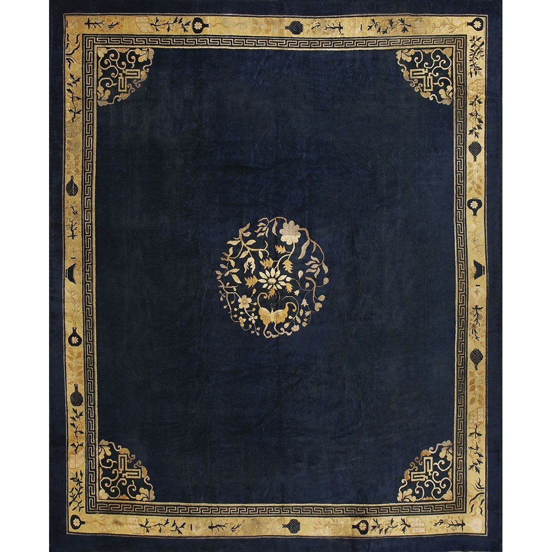 The commercial Peking carpet is a later 19th century development, begun by importing weaves from Ningshia (see entry) to create and export industry aimed at Western markets. The foundation is cotton and the pile is a good quality carpet wool which takes dyes particularly well. The neat medium weave is in Persian (asymmetric) knots. Designs are strictly Chinese and the whole motif repertoire of Chinese art is employed. Blue and white is the most popular color combination and red is particularly rare. Sizes tend to 9’ x 12’ and larger, and few small pieces appear. For a short time in the early 1920’s Persian designs were woven to capitalize on the death of new Iranian goods. The industry decimated by the Communist Revolution relocated to the Pearl River area. There is a good supply of antique carpets at reasonable prices.