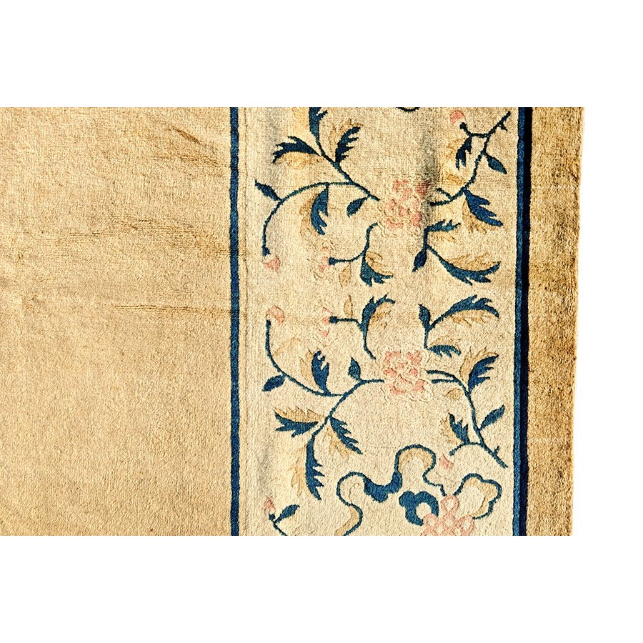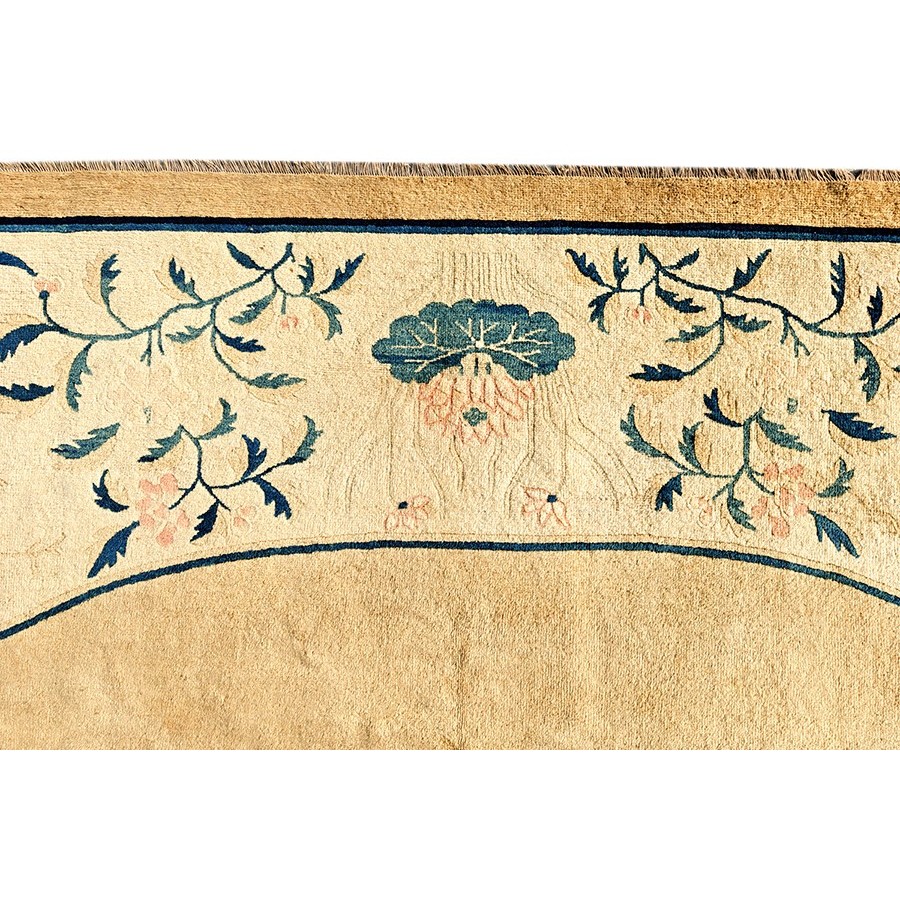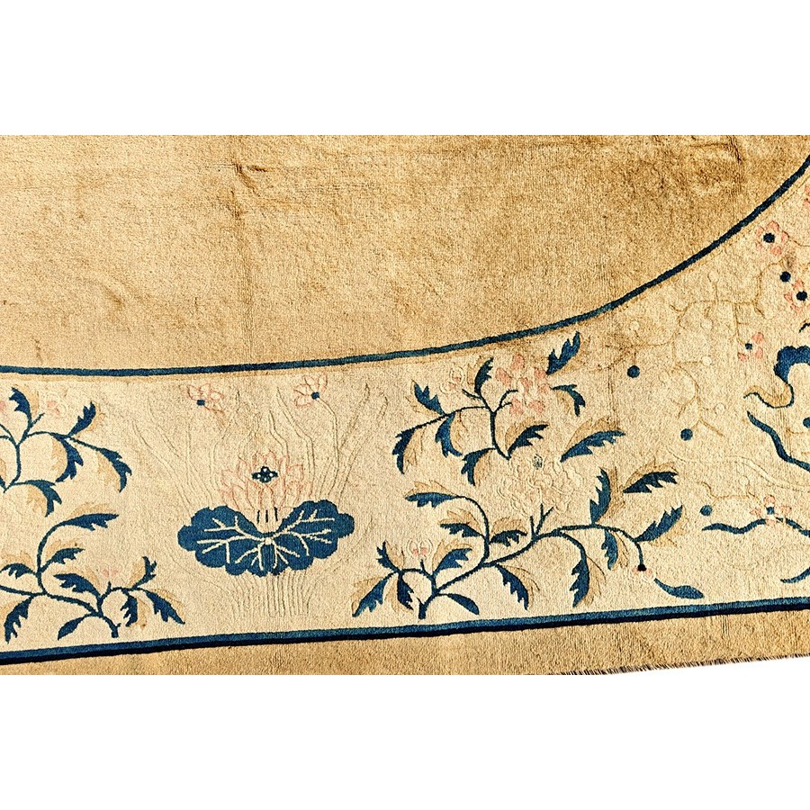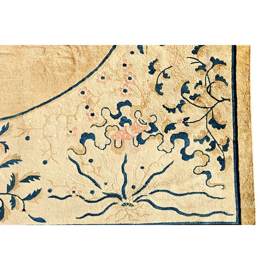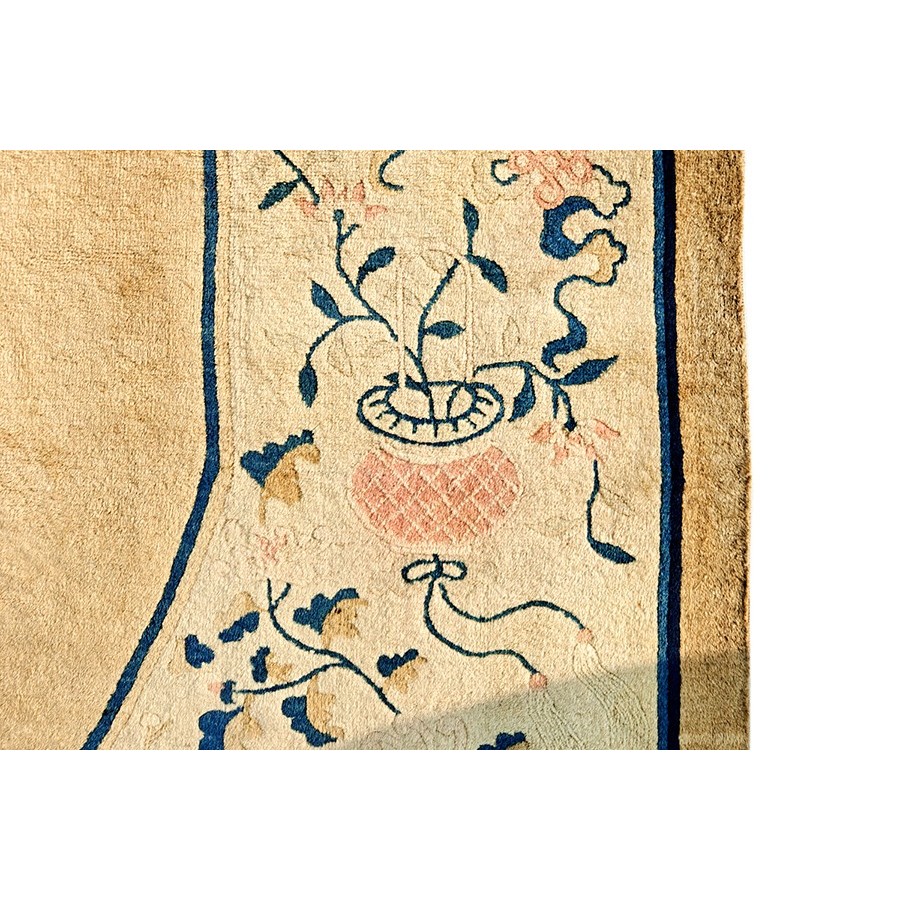 DescriptionChineseCarpets made in China proper. See entries Ningshia, Peking, Art Deco. Chinese - PekingThe commercial Peking carpet is a later 19th century development, begun by importing weaves from Ningshia (see entry) to create and export industry aimed at Western markets. The foundation is cotton and the pile is a good quality carpet wool which takes dyes particularly well. The neat medium weave is in Persian (asymmetric) knots. Designs are strictly Chinese and the whole motif repertoire of Chinese art is employed. Blue and white is the most popular color combination and red is particularly rare. Sizes tend to 9 x 12 and larger, and few small pieces appear. For a short time in the early 1920s Persian designs were woven to capitalize on the death of new Iranian goods. The industry decimated by the Communist Revolution relocated to the Pearl River area. There is a good supply of antique carpets at reasonable prices. | |