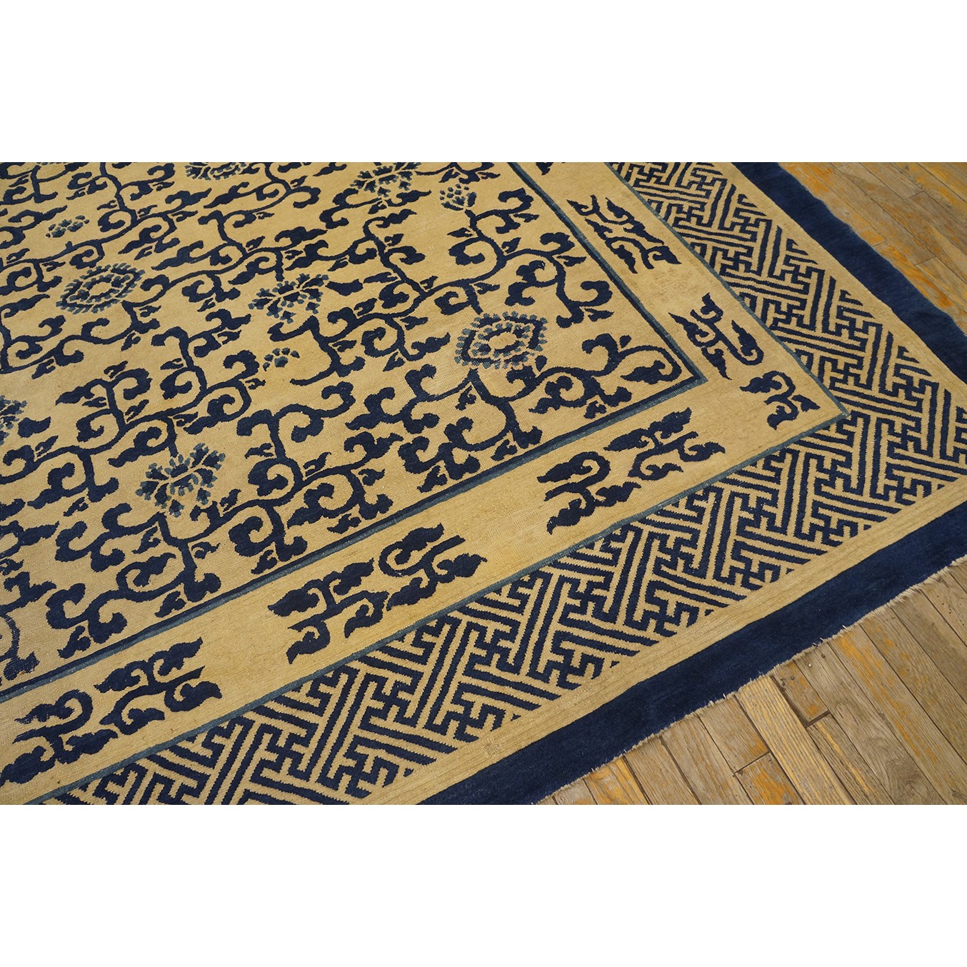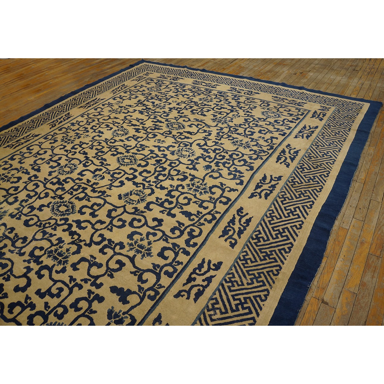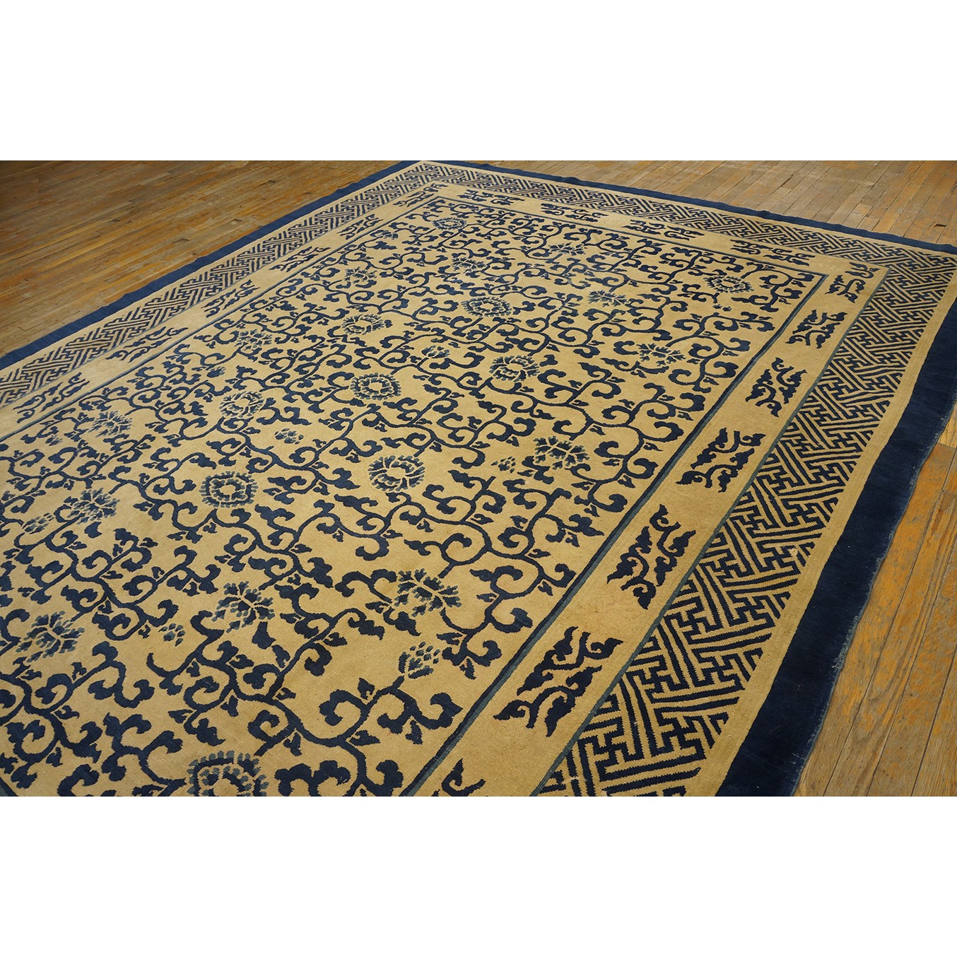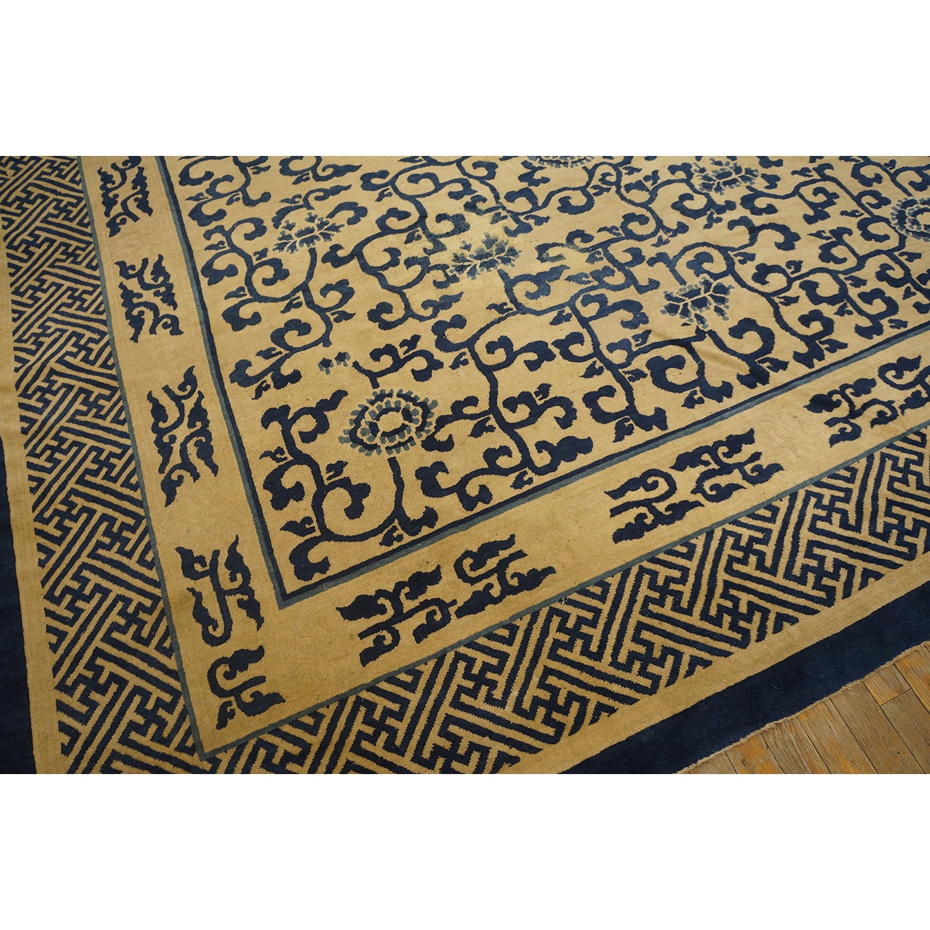 DescriptionChineseCarpets made in China proper. See entries Ningshia, Peking, Art Deco. Chinese - PekingThe commercial Peking carpet is a later 19th century development, begun by importing weaves from Ningshia (see entry) to create and export industry aimed at Western markets. The foundation is cotton and the pile is a good quality carpet wool which takes dyes particularly well. The neat medium weave is in Persian (asymmetric) knots. Designs are strictly Chinese and the whole motif repertoire of Chinese art is employed. Blue and white is the most popular color combination and red is particularly rare. Sizes tend to 9 x 12 and larger, and few small pieces appear. For a short time in the early 1920s Persian designs were woven to capitalize on the death of new Iranian goods. The industry decimated by the Communist Revolution relocated to the Pearl River area. There is a good supply of antique carpets at reasonable prices. | |