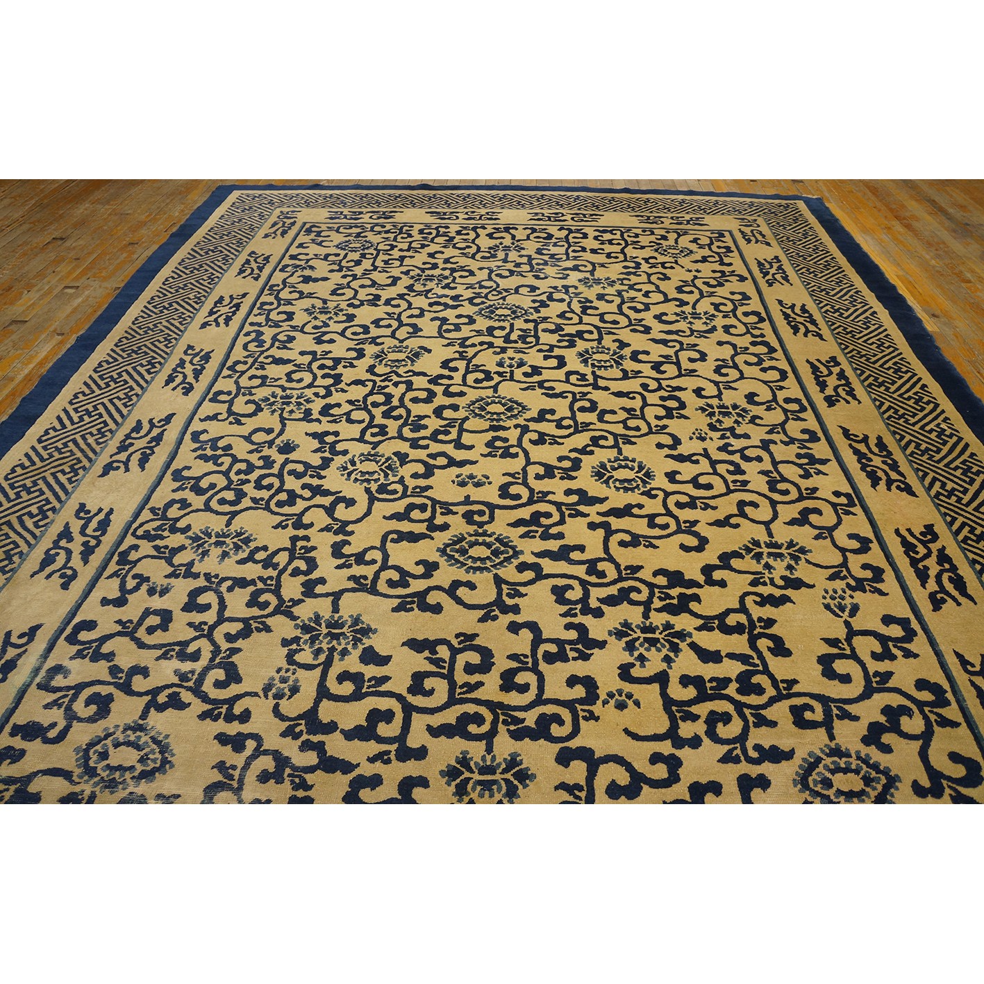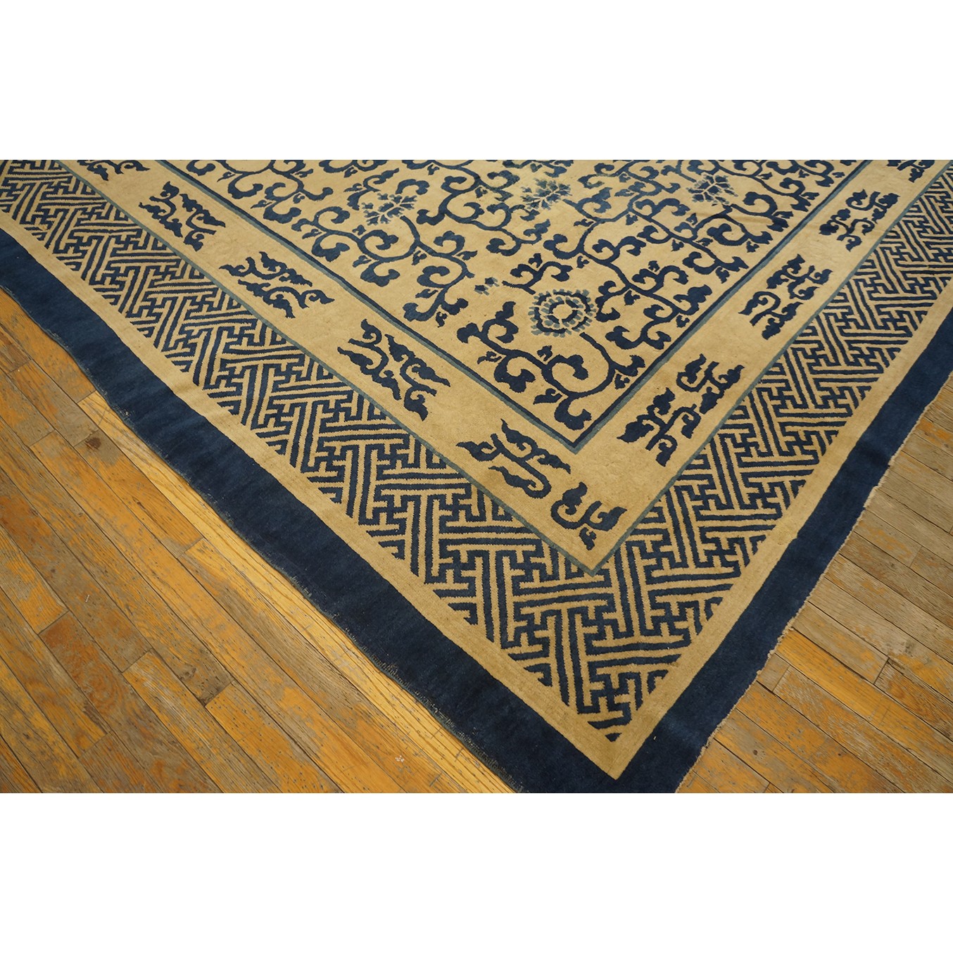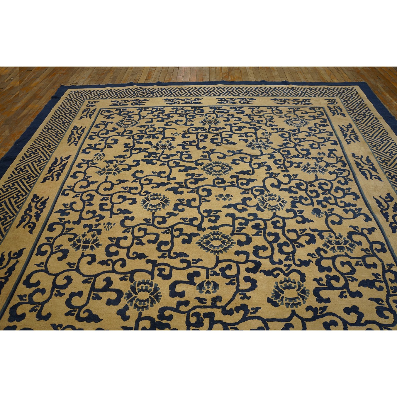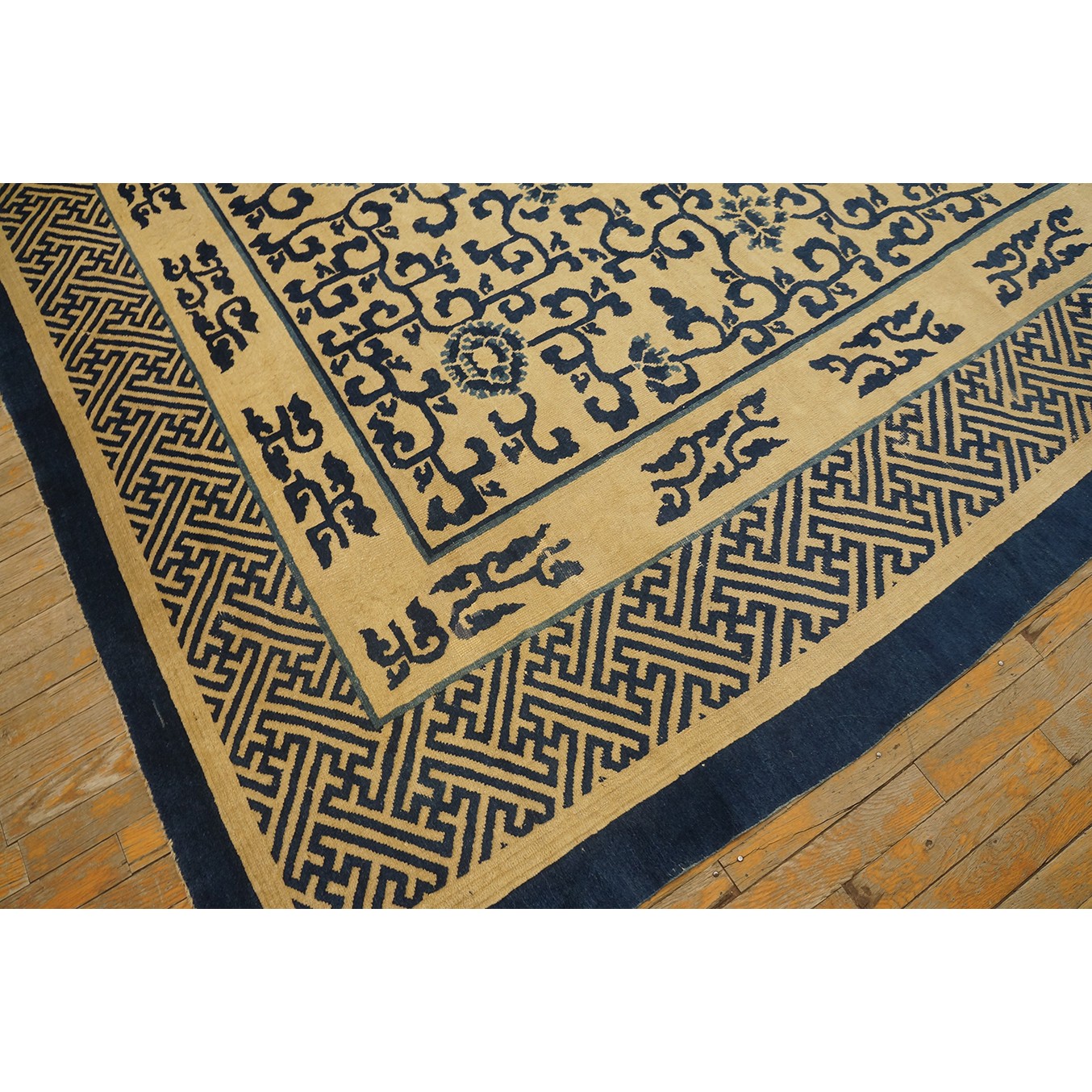 DescriptionChineseCarpets made in China proper. See entries Ningshia, Peking, Art Deco. Chinese - PekingThe commercial Peking carpet is a later 19th century development, begun by importing weaves from Ningshia (see entry) to create and export industry aimed at Western markets. The foundation is cotton and the pile is a good quality carpet wool which takes dyes particularly well. The neat medium weave is in Persian (asymmetric) knots. Designs are strictly Chinese and the whole motif repertoire of Chinese art is employed. Blue and white is the most popular color combination and red is particularly rare. Sizes tend to 9 x 12 and larger, and few small pieces appear. For a short time in the early 1920s Persian designs were woven to capitalize on the death of new Iranian goods. The industry decimated by the Communist Revolution relocated to the Pearl River area. There is a good supply of antique carpets at reasonable prices. | |