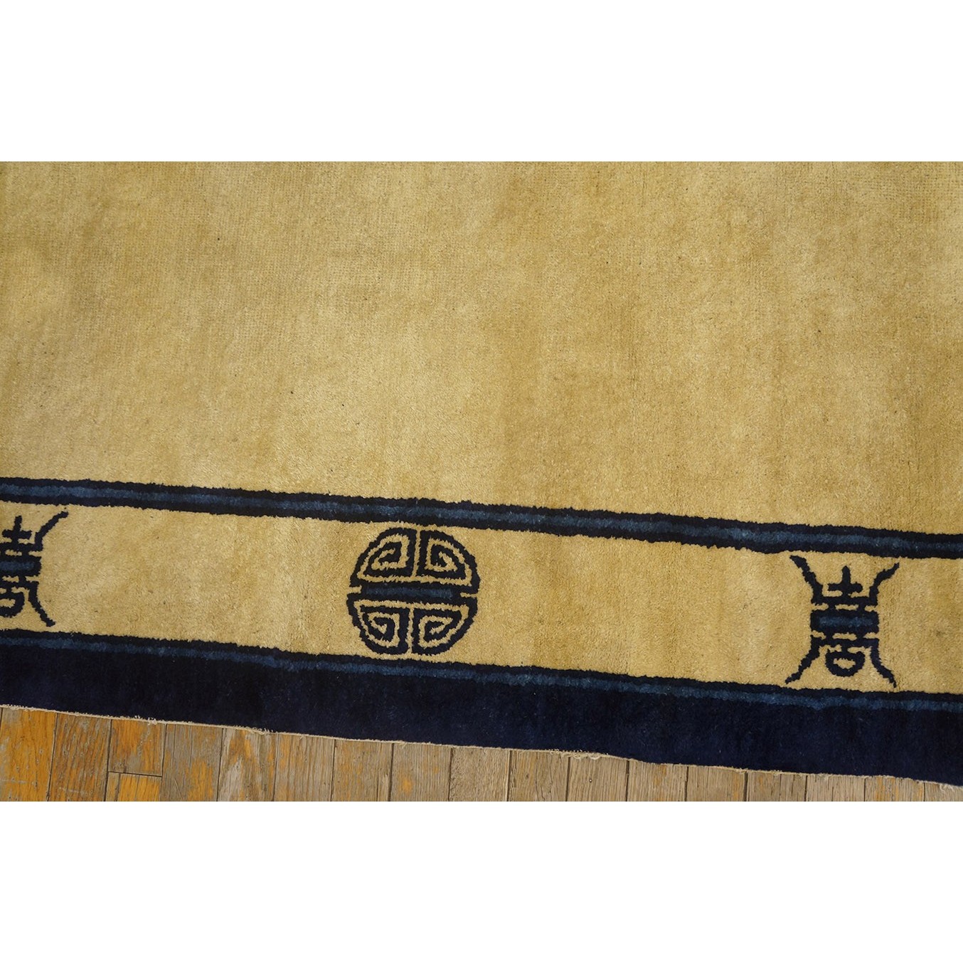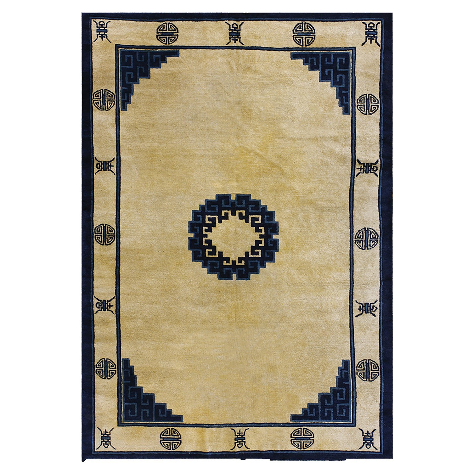 The commercial Peking carpet is a later 19th century development, begun by importing weaves from Ningshia (see entry) to create and export industry aimed at Western markets. The foundation is cotton and the pile is a good quality carpet wool which takes dyes particularly well. The neat medium weave is in Persian (asymmetric) knots. Designs are strictly Chinese and the whole motif repertoire of Chinese art is employed. Blue and white is the most popular color combination and red is particularly rare. Sizes tend to 9’ x 12’ and larger, and few small pieces appear. For a short time in the early 1920’s Persian designs were woven to capitalize on the death of new Iranian goods. The industry decimated by the Communist Revolution relocated to the Pearl River area. There is a good supply of antique carpets at reasonable prices.