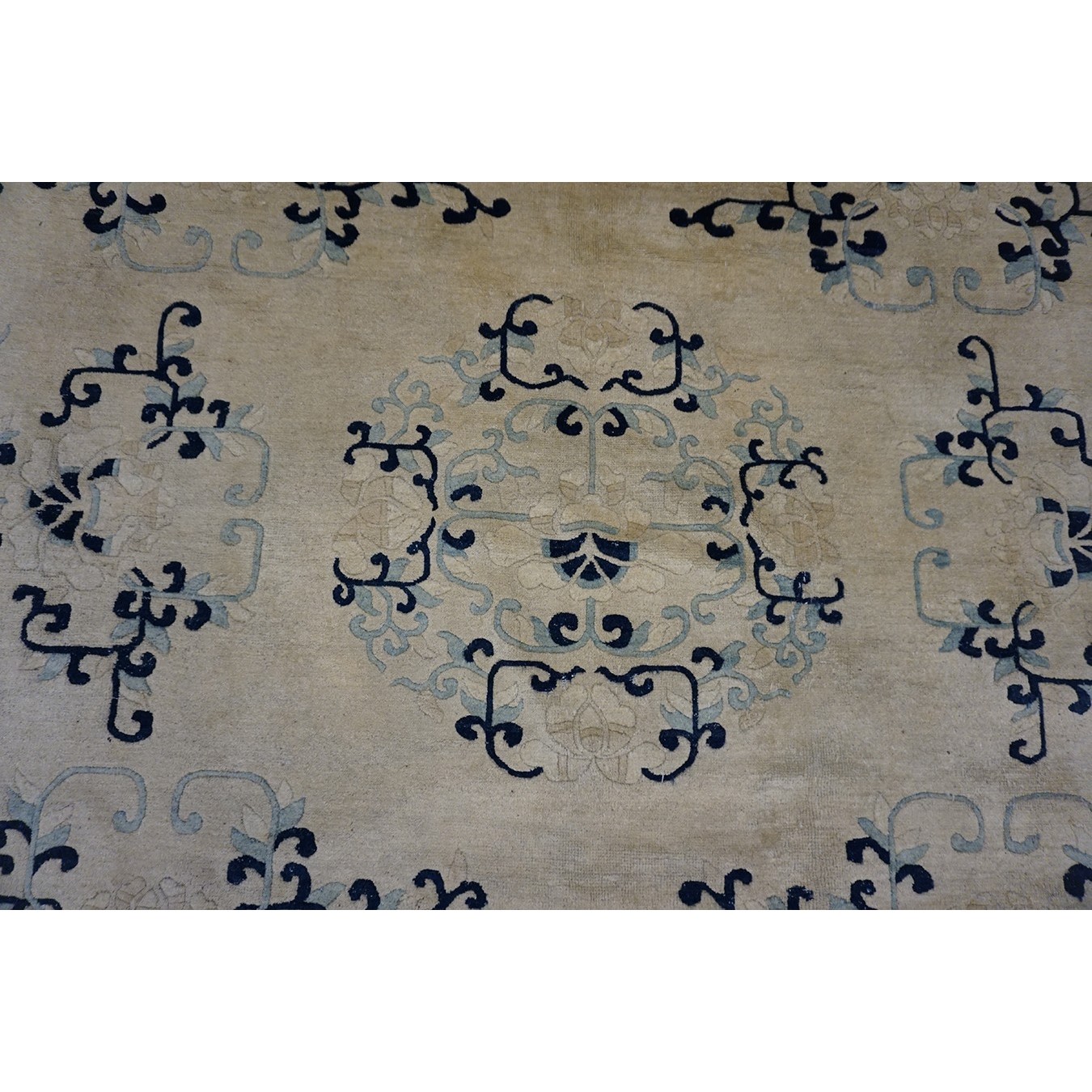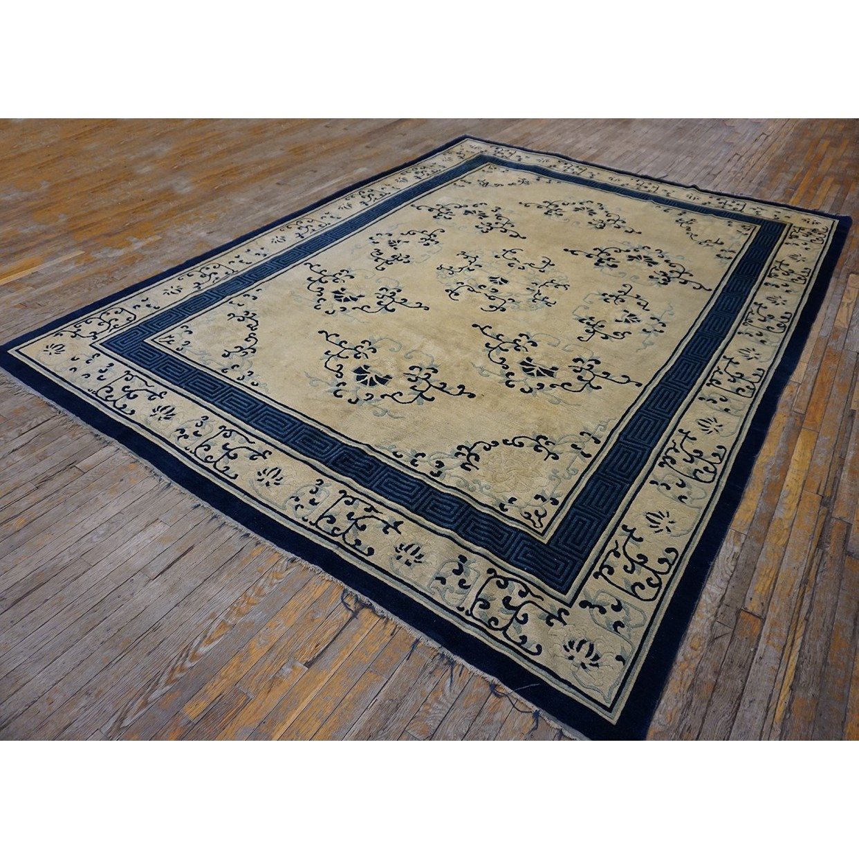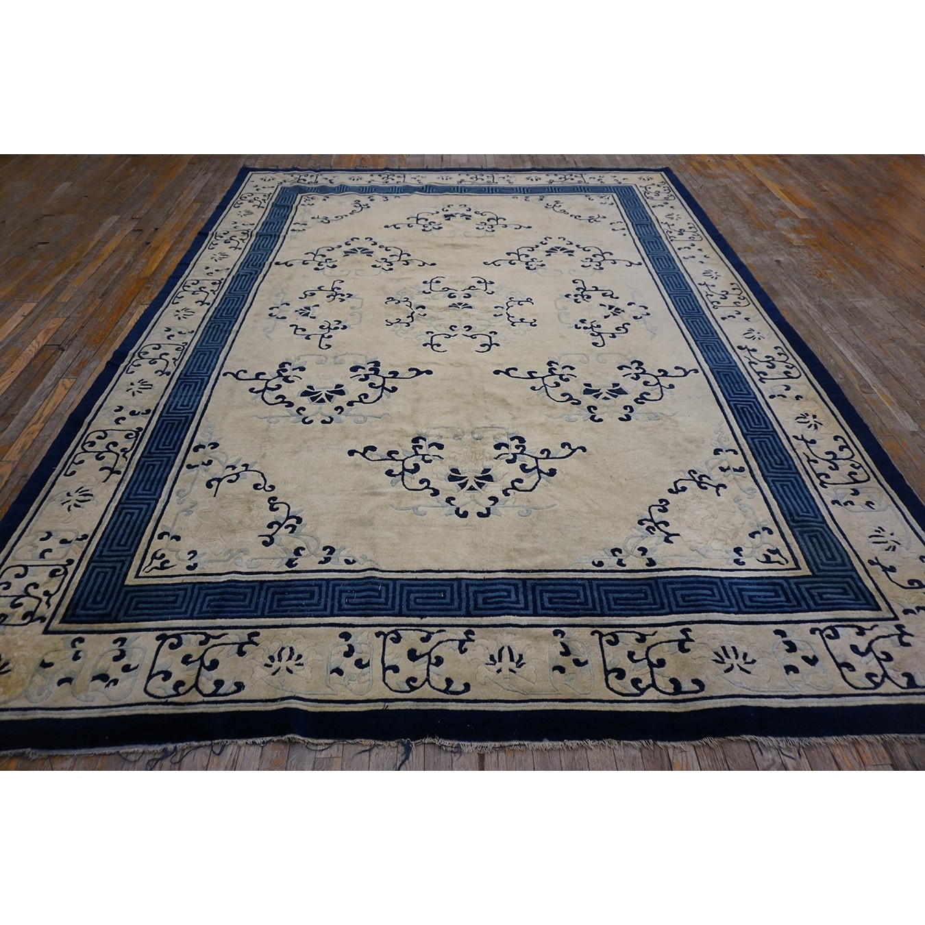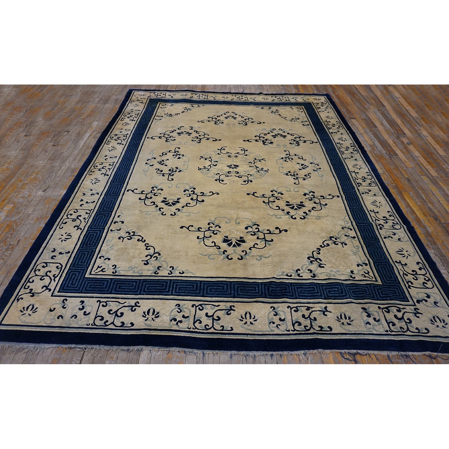 DescriptionChineseCarpets made in China proper. See entries Ningshia, Peking, Art Deco. Chinese - PekingThe commercial Peking carpet is a later 19th century development, begun by importing weaves from Ningshia (see entry) to create and export industry aimed at Western markets. The foundation is cotton and the pile is a good quality carpet wool which takes dyes particularly well. The neat medium weave is in Persian (asymmetric) knots. Designs are strictly Chinese and the whole motif repertoire of Chinese art is employed. Blue and white is the most popular color combination and red is particularly rare. Sizes tend to 9 x 12 and larger, and few small pieces appear. For a short time in the early 1920s Persian designs were woven to capitalize on the death of new Iranian goods. The industry decimated by the Communist Revolution relocated to the Pearl River area. There is a good supply of antique carpets at reasonable prices. | |