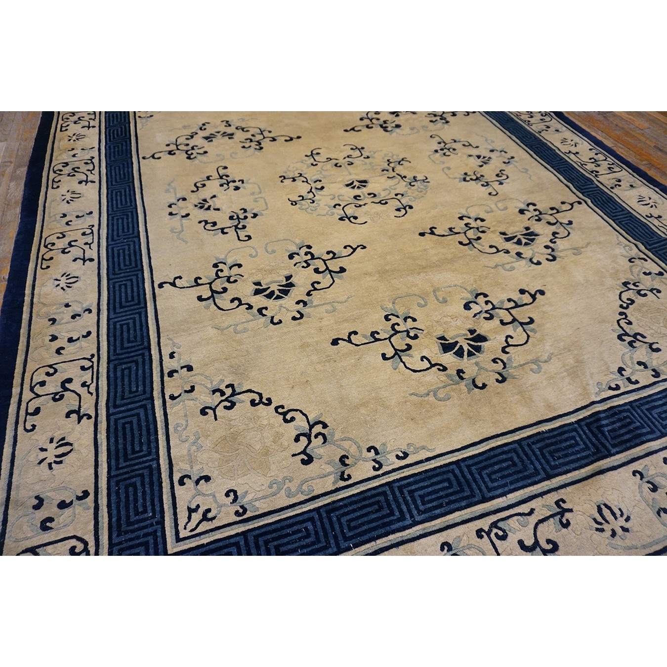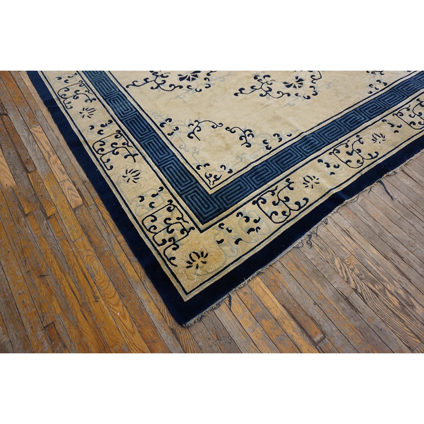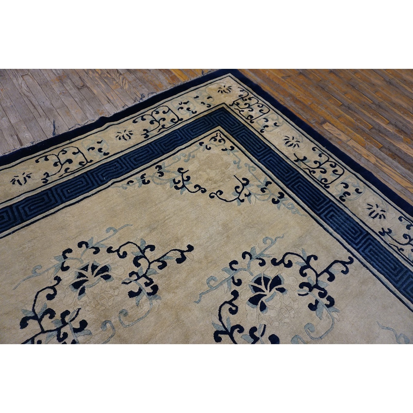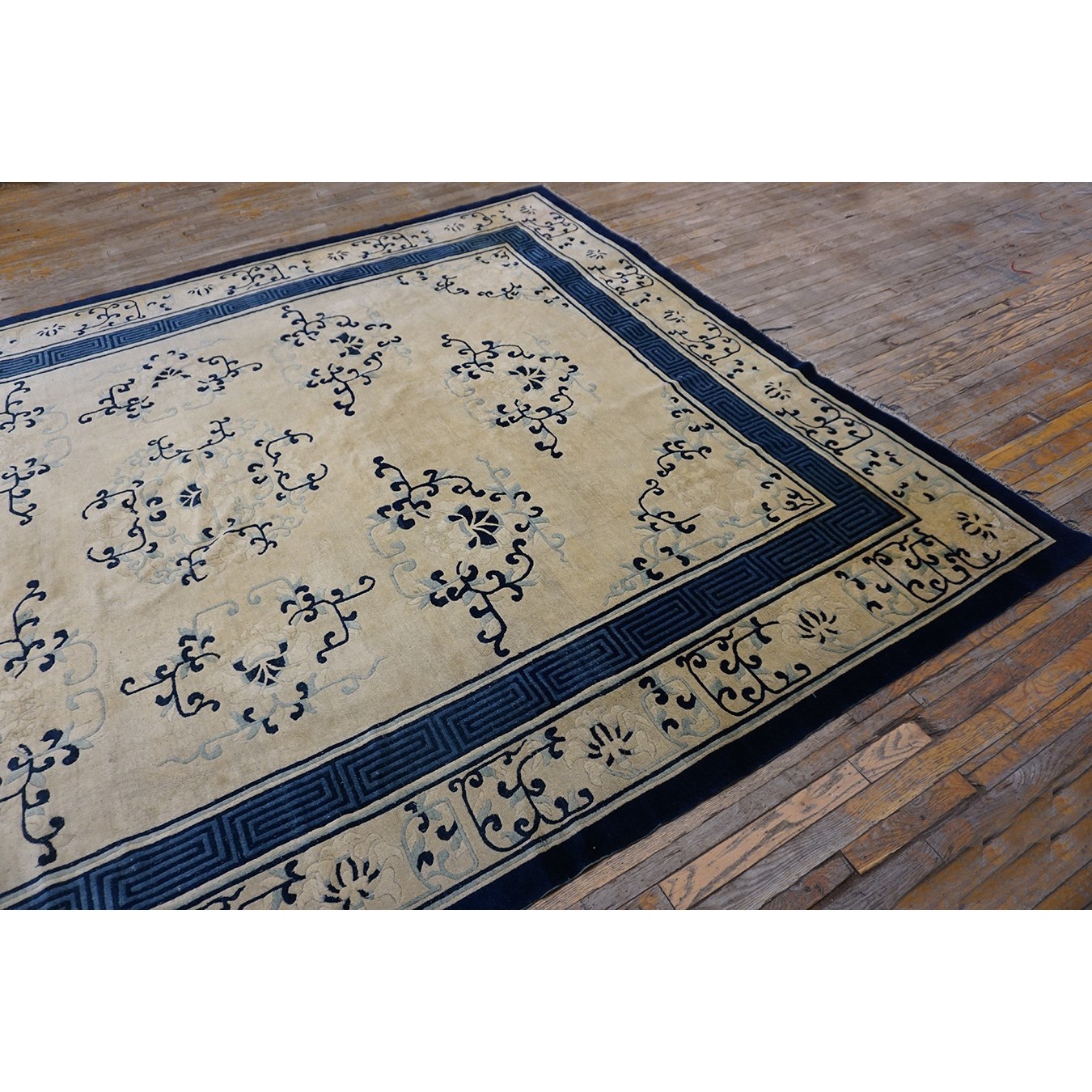 DescriptionChineseCarpets made in China proper. See entries Ningshia, Peking, Art Deco. Chinese - PekingThe commercial Peking carpet is a later 19th century development, begun by importing weaves from Ningshia (see entry) to create and export industry aimed at Western markets. The foundation is cotton and the pile is a good quality carpet wool which takes dyes particularly well. The neat medium weave is in Persian (asymmetric) knots. Designs are strictly Chinese and the whole motif repertoire of Chinese art is employed. Blue and white is the most popular color combination and red is particularly rare. Sizes tend to 9 x 12 and larger, and few small pieces appear. For a short time in the early 1920s Persian designs were woven to capitalize on the death of new Iranian goods. The industry decimated by the Communist Revolution relocated to the Pearl River area. There is a good supply of antique carpets at reasonable prices. | |