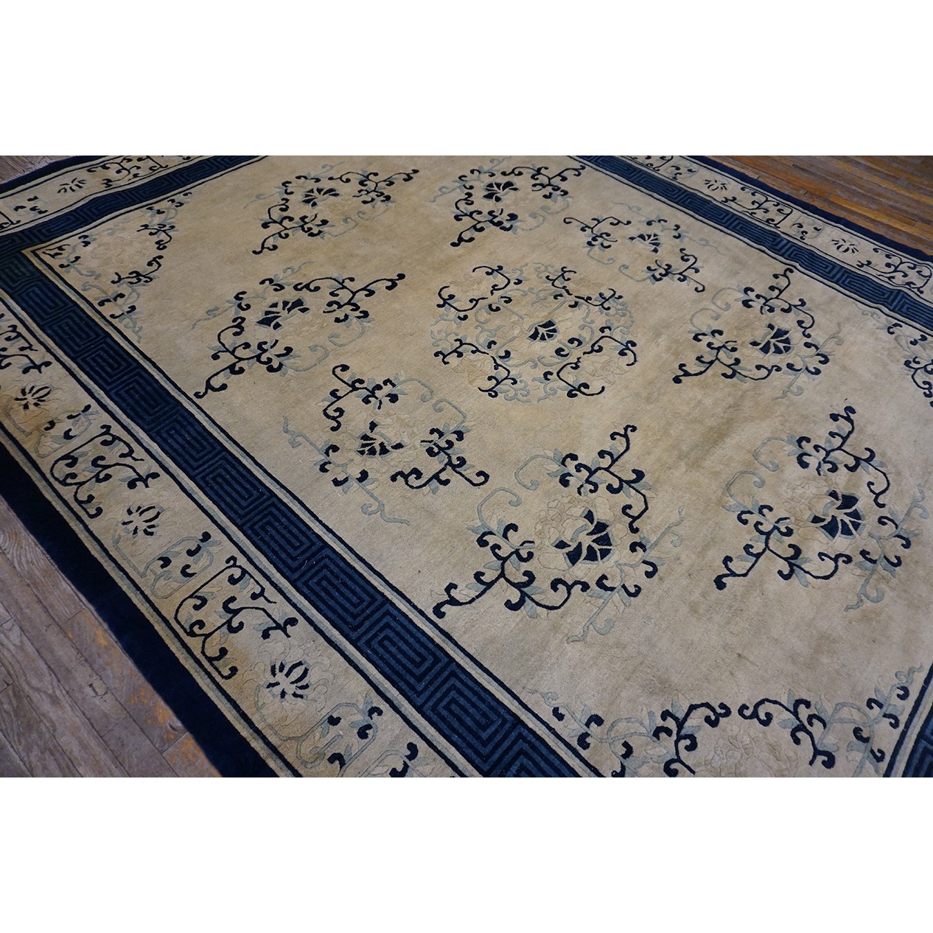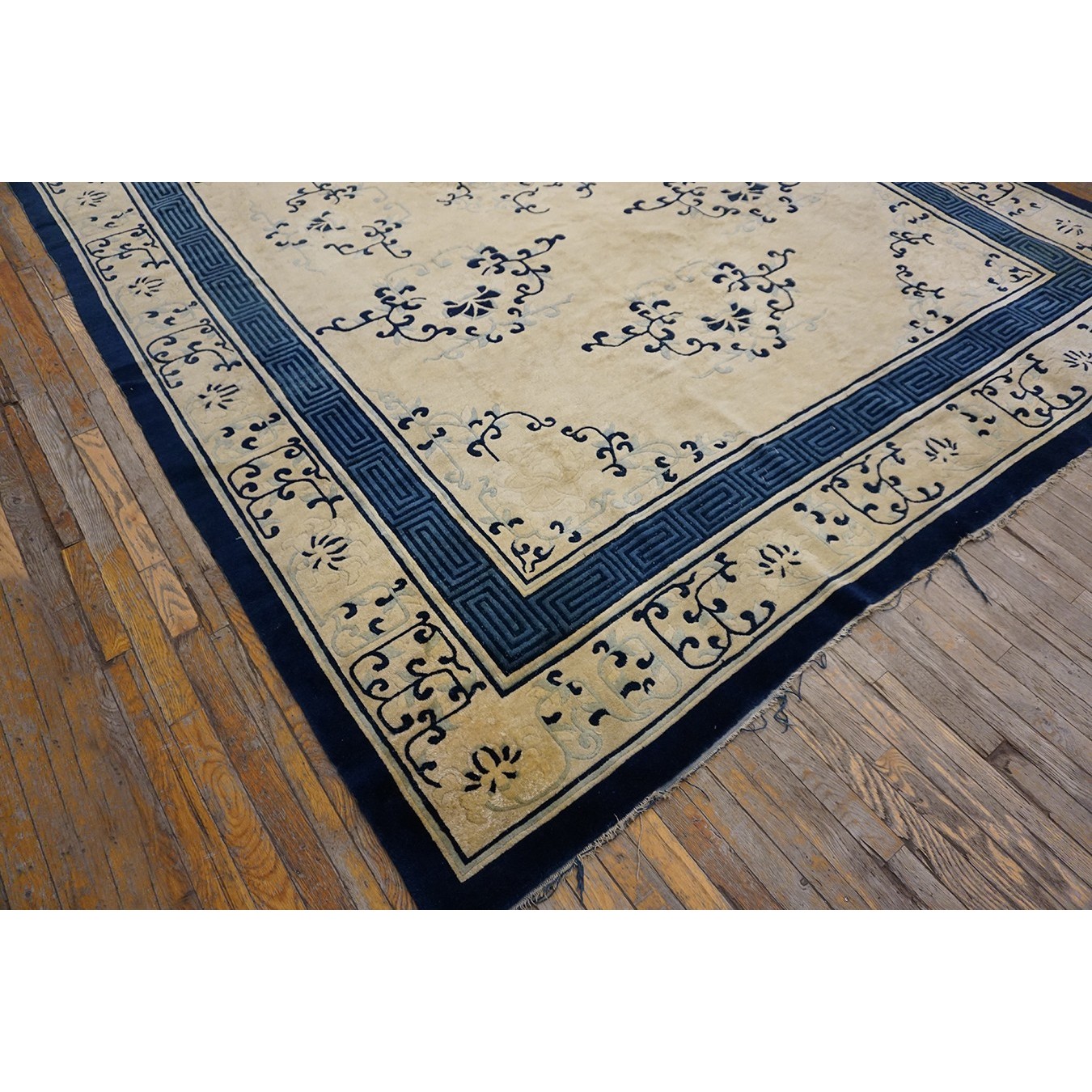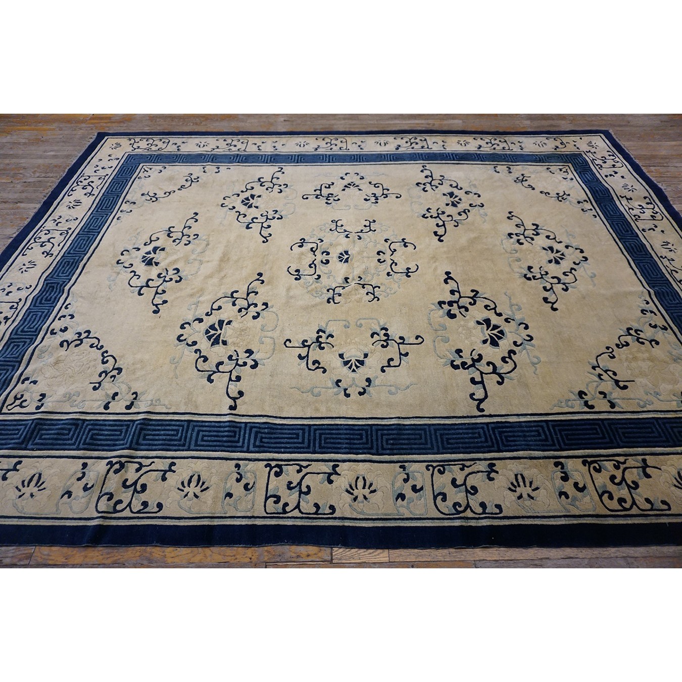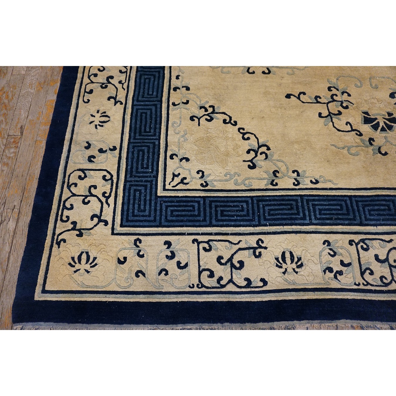 DescriptionChineseCarpets made in China proper. See entries Ningshia, Peking, Art Deco. Chinese - PekingThe commercial Peking carpet is a later 19th century development, begun by importing weaves from Ningshia (see entry) to create and export industry aimed at Western markets. The foundation is cotton and the pile is a good quality carpet wool which takes dyes particularly well. The neat medium weave is in Persian (asymmetric) knots. Designs are strictly Chinese and the whole motif repertoire of Chinese art is employed. Blue and white is the most popular color combination and red is particularly rare. Sizes tend to 9 x 12 and larger, and few small pieces appear. For a short time in the early 1920s Persian designs were woven to capitalize on the death of new Iranian goods. The industry decimated by the Communist Revolution relocated to the Pearl River area. There is a good supply of antique carpets at reasonable prices. | |