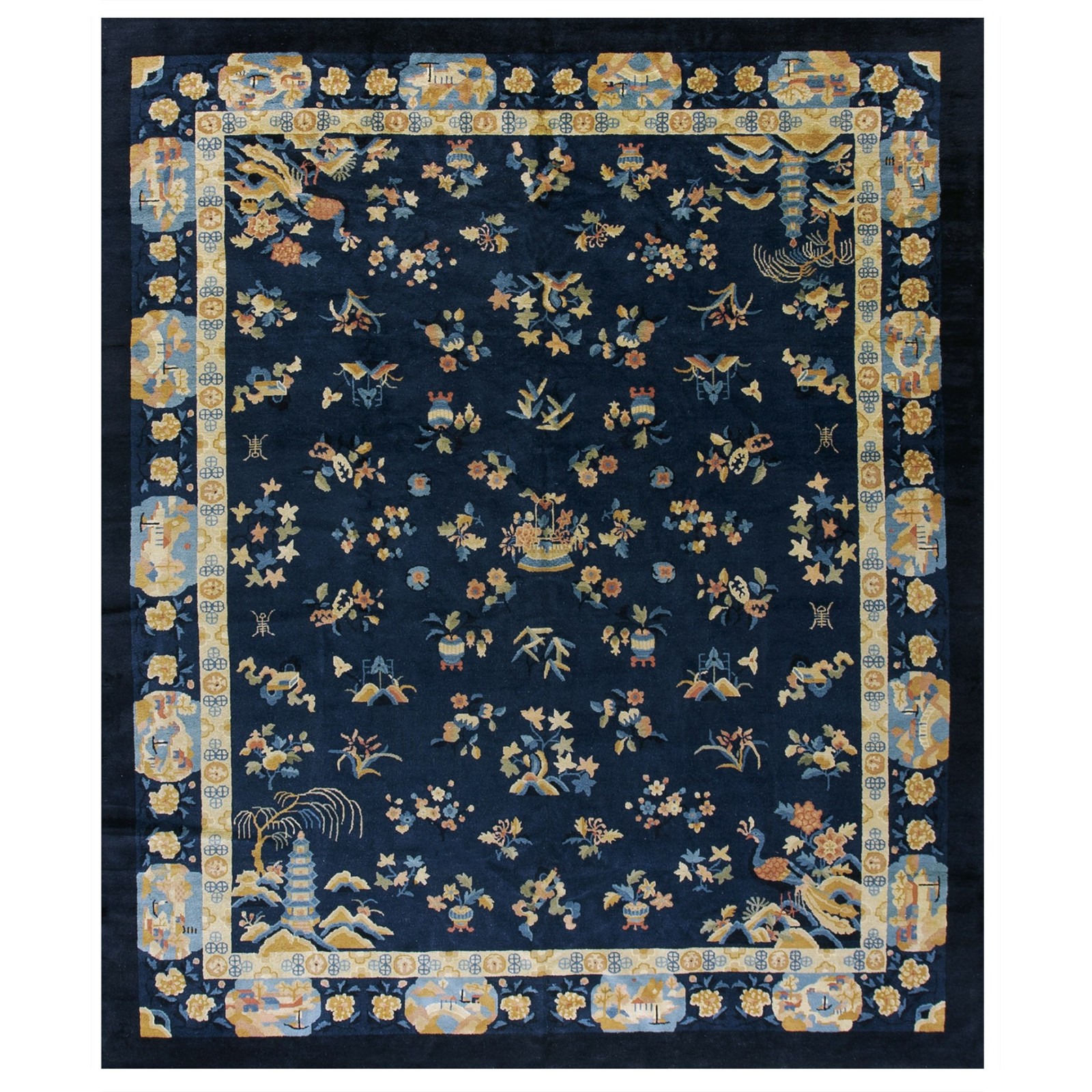 DescriptionChineseCarpets made in China proper. See entries Ningshia, Peking, Art Deco. Chinese - PekingThe commercial Peking carpet is a later 19th century development, begun by importing weaves from Ningshia (see entry) to create and export industry aimed at Western markets. The foundation is cotton and the pile is a good quality carpet wool which takes dyes particularly well. The neat medium weave is in Persian (asymmetric) knots. Designs are strictly Chinese and the whole motif repertoire of Chinese art is employed. Blue and white is the most popular color combination and red is particularly rare. Sizes tend to 9 x 12 and larger, and few small pieces appear. For a short time in the early 1920s Persian designs were woven to capitalize on the death of new Iranian goods. The industry decimated by the Communist Revolution relocated to the Pearl River area. There is a good supply of antique carpets at reasonable prices. | |