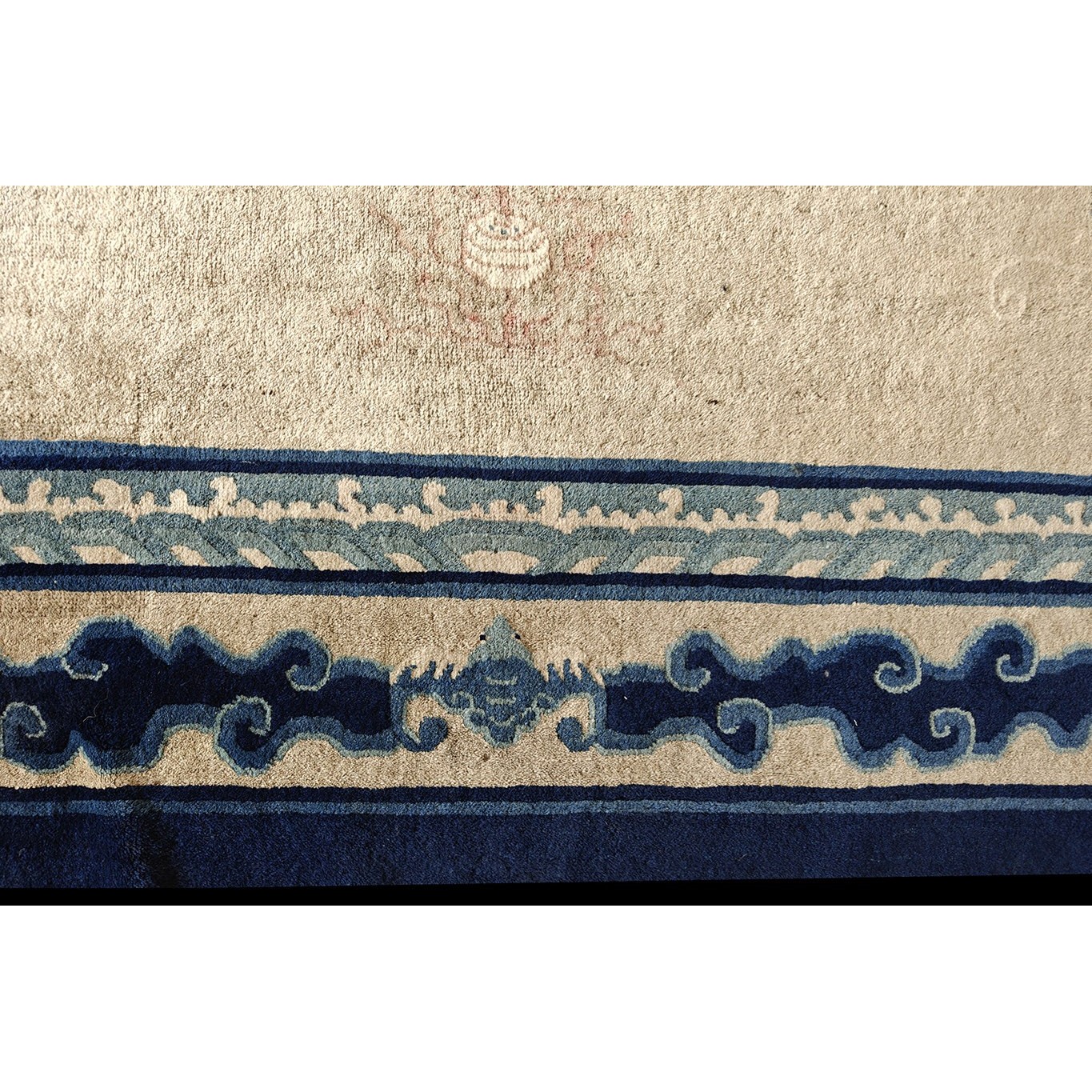 DescriptionChineseCarpets made in China proper. See entries Ningshia, Peking, Art Deco. Chinese - PekingThe commercial Peking carpet is a later 19th century development, begun by importing weaves from Ningshia (see entry) to create and export industry aimed at Western markets. The foundation is cotton and the pile is a good quality carpet wool which takes dyes particularly well. The neat medium weave is in Persian (asymmetric) knots. Designs are strictly Chinese and the whole motif repertoire of Chinese art is employed. Blue and white is the most popular color combination and red is particularly rare. Sizes tend to 9 x 12 and larger, and few small pieces appear. For a short time in the early 1920s Persian designs were woven to capitalize on the death of new Iranian goods. The industry decimated by the Communist Revolution relocated to the Pearl River area. There is a good supply of antique carpets at reasonable prices. | |