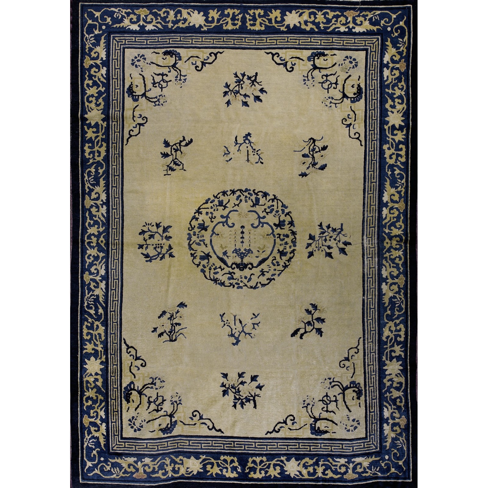 DescriptionChineseCarpets made in China proper. See entries Ningshia, Peking, Art Deco. Chinese - PekingThe commercial Peking carpet is a later 19th century development, begun by importing weaves from Ningshia (see entry) to create and export industry aimed at Western markets. The foundation is cotton and the pile is a good quality carpet wool which takes dyes particularly well. The neat medium weave is in Persian (asymmetric) knots. Designs are strictly Chinese and the whole motif repertoire of Chinese art is employed. Blue and white is the most popular color combination and red is particularly rare. Sizes tend to 9 x 12 and larger, and few small pieces appear. For a short time in the early 1920s Persian designs were woven to capitalize on the death of new Iranian goods. The industry decimated by the Communist Revolution relocated to the Pearl River area. There is a good supply of antique carpets at reasonable prices. | |