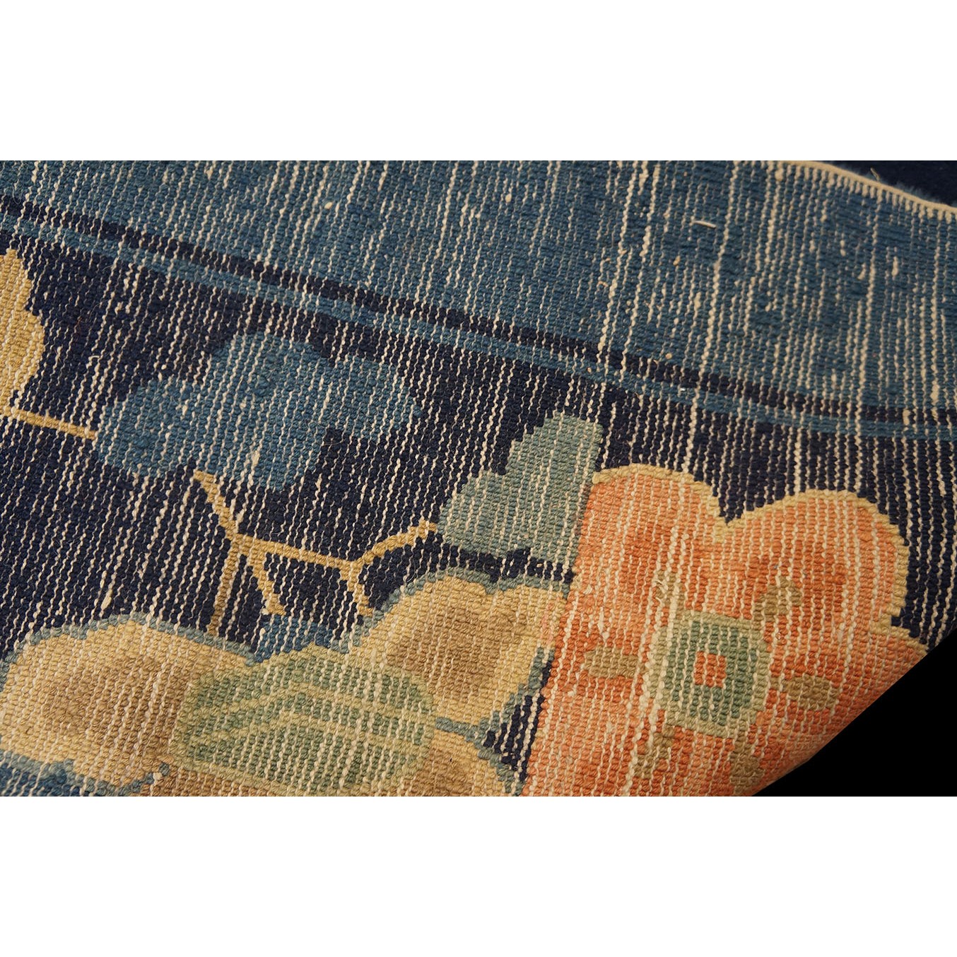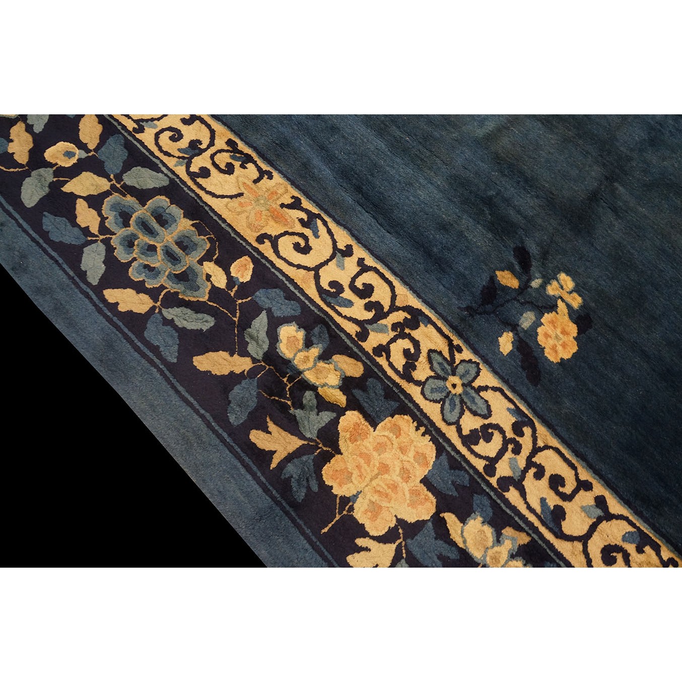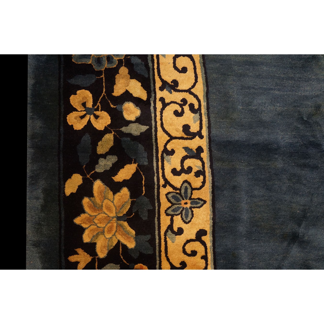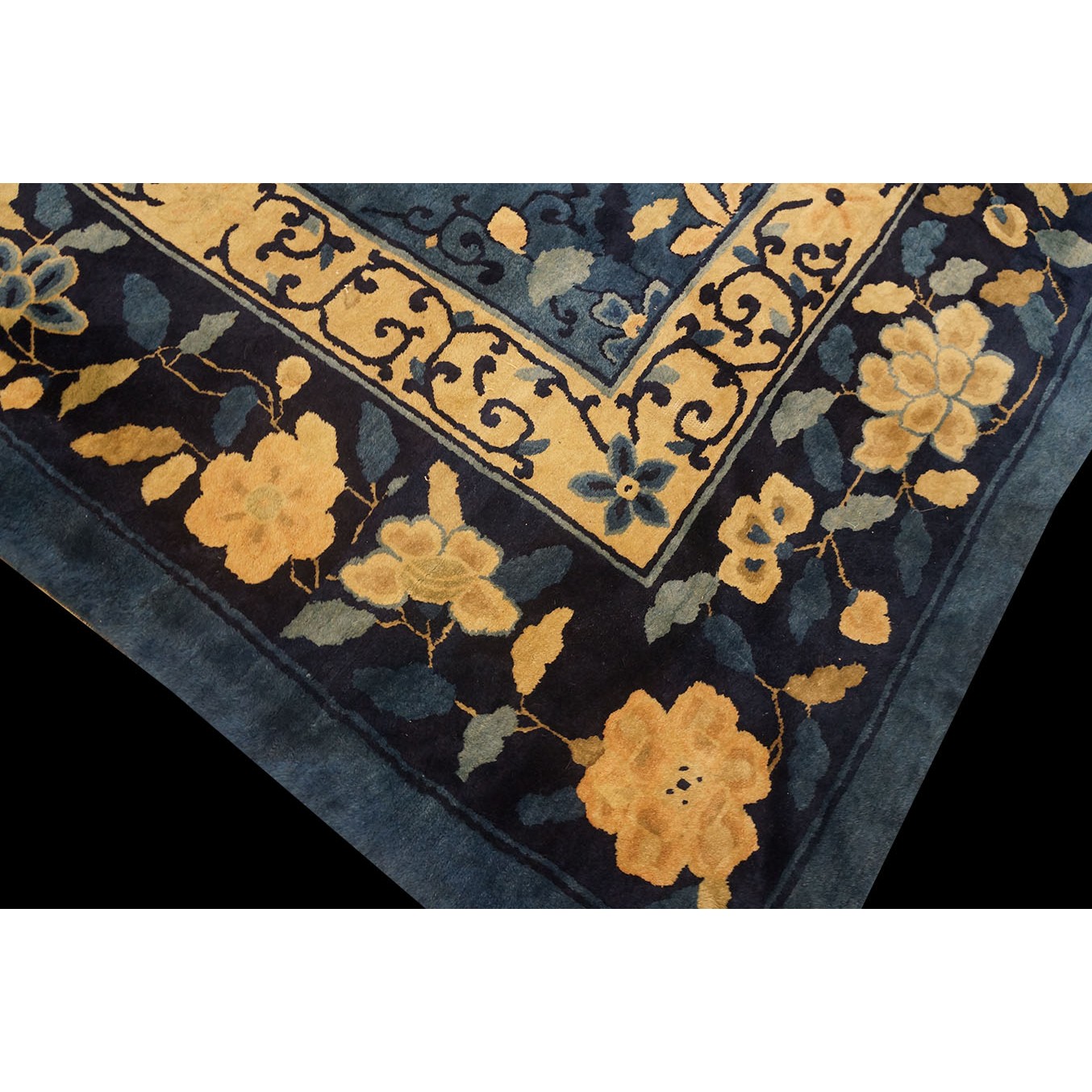 DescriptionChineseCarpets made in China proper. See entries Ningshia, Peking, Art Deco. Chinese - PekingThe commercial Peking carpet is a later 19th century development, begun by importing weaves from Ningshia (see entry) to create and export industry aimed at Western markets. The foundation is cotton and the pile is a good quality carpet wool which takes dyes particularly well. The neat medium weave is in Persian (asymmetric) knots. Designs are strictly Chinese and the whole motif repertoire of Chinese art is employed. Blue and white is the most popular color combination and red is particularly rare. Sizes tend to 9 x 12 and larger, and few small pieces appear. For a short time in the early 1920s Persian designs were woven to capitalize on the death of new Iranian goods. The industry decimated by the Communist Revolution relocated to the Pearl River area. There is a good supply of antique carpets at reasonable prices. | |