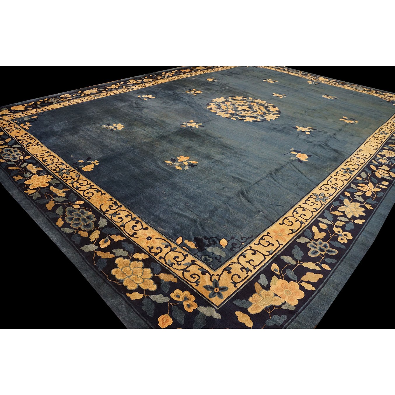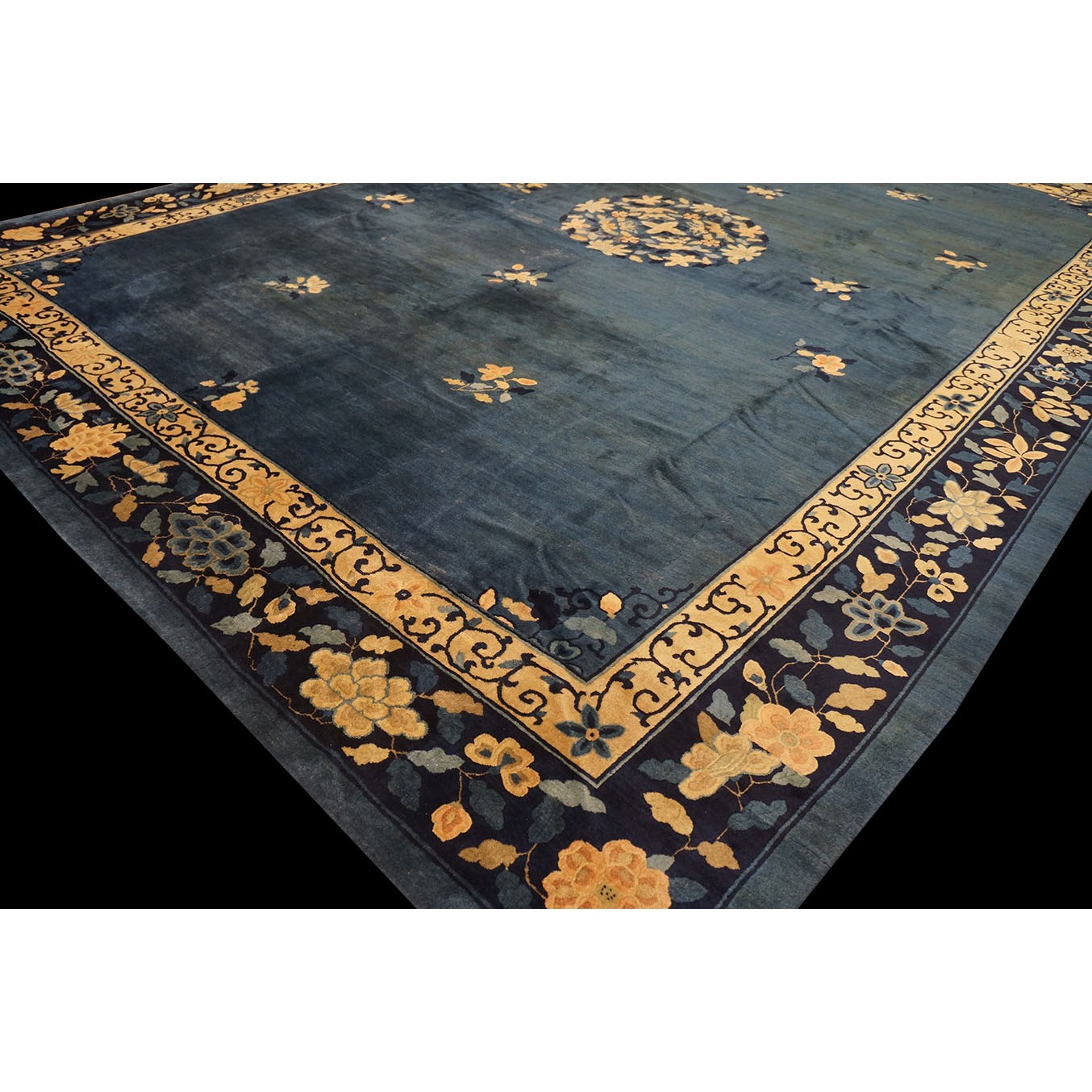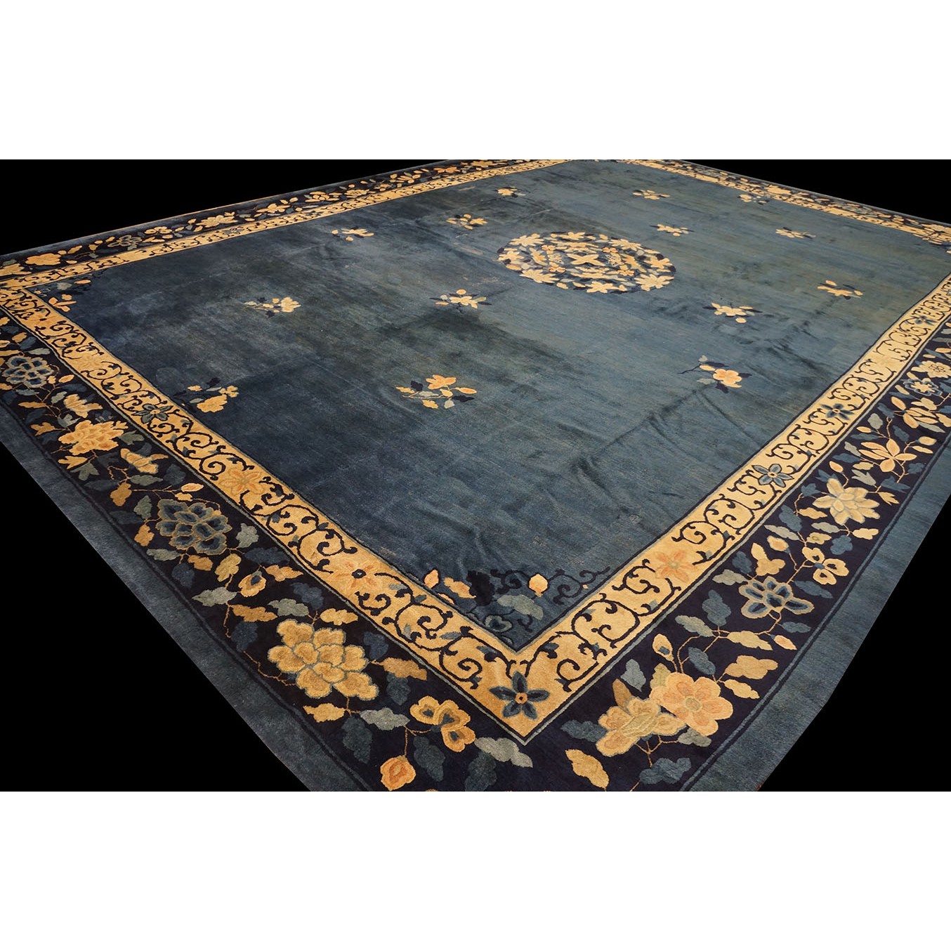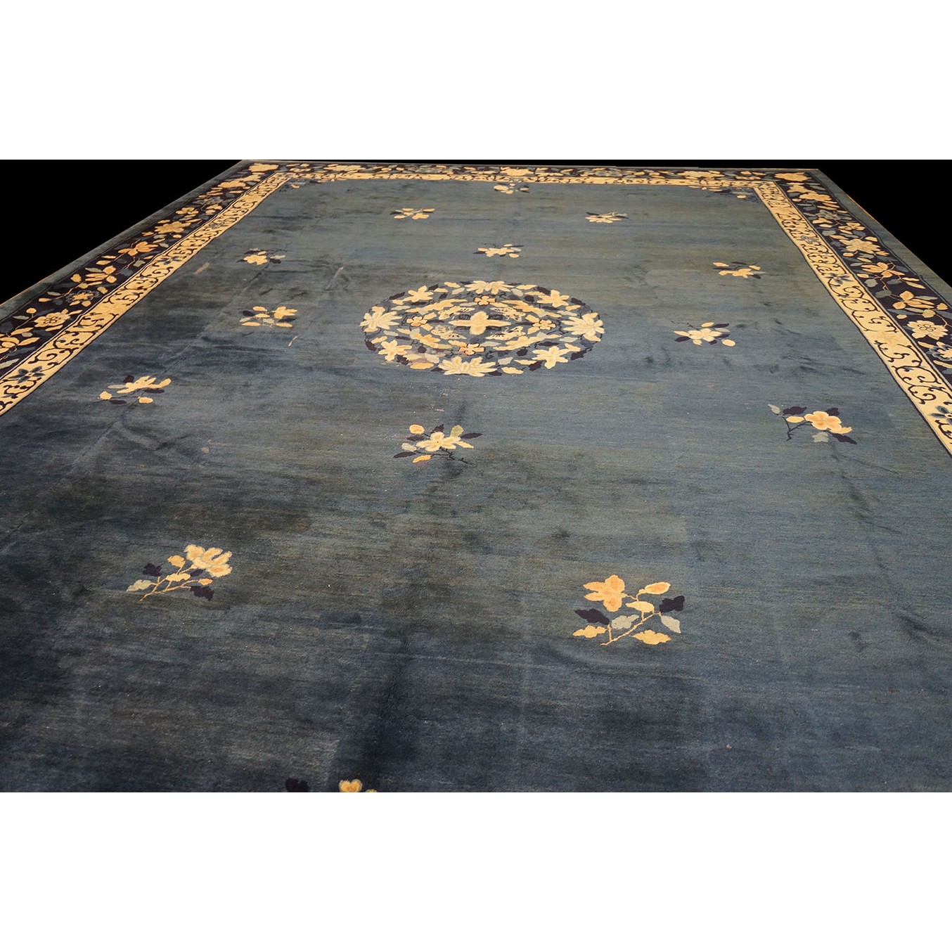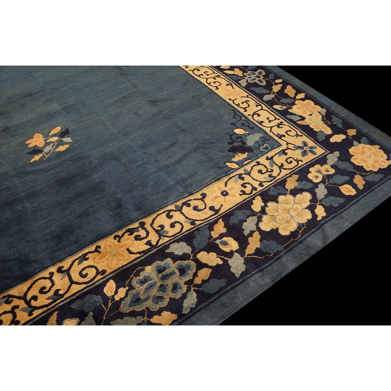 DescriptionChineseCarpets made in China proper. See entries Ningshia, Peking, Art Deco. Chinese - PekingThe commercial Peking carpet is a later 19th century development, begun by importing weaves from Ningshia (see entry) to create and export industry aimed at Western markets. The foundation is cotton and the pile is a good quality carpet wool which takes dyes particularly well. The neat medium weave is in Persian (asymmetric) knots. Designs are strictly Chinese and the whole motif repertoire of Chinese art is employed. Blue and white is the most popular color combination and red is particularly rare. Sizes tend to 9 x 12 and larger, and few small pieces appear. For a short time in the early 1920s Persian designs were woven to capitalize on the death of new Iranian goods. The industry decimated by the Communist Revolution relocated to the Pearl River area. There is a good supply of antique carpets at reasonable prices. | |