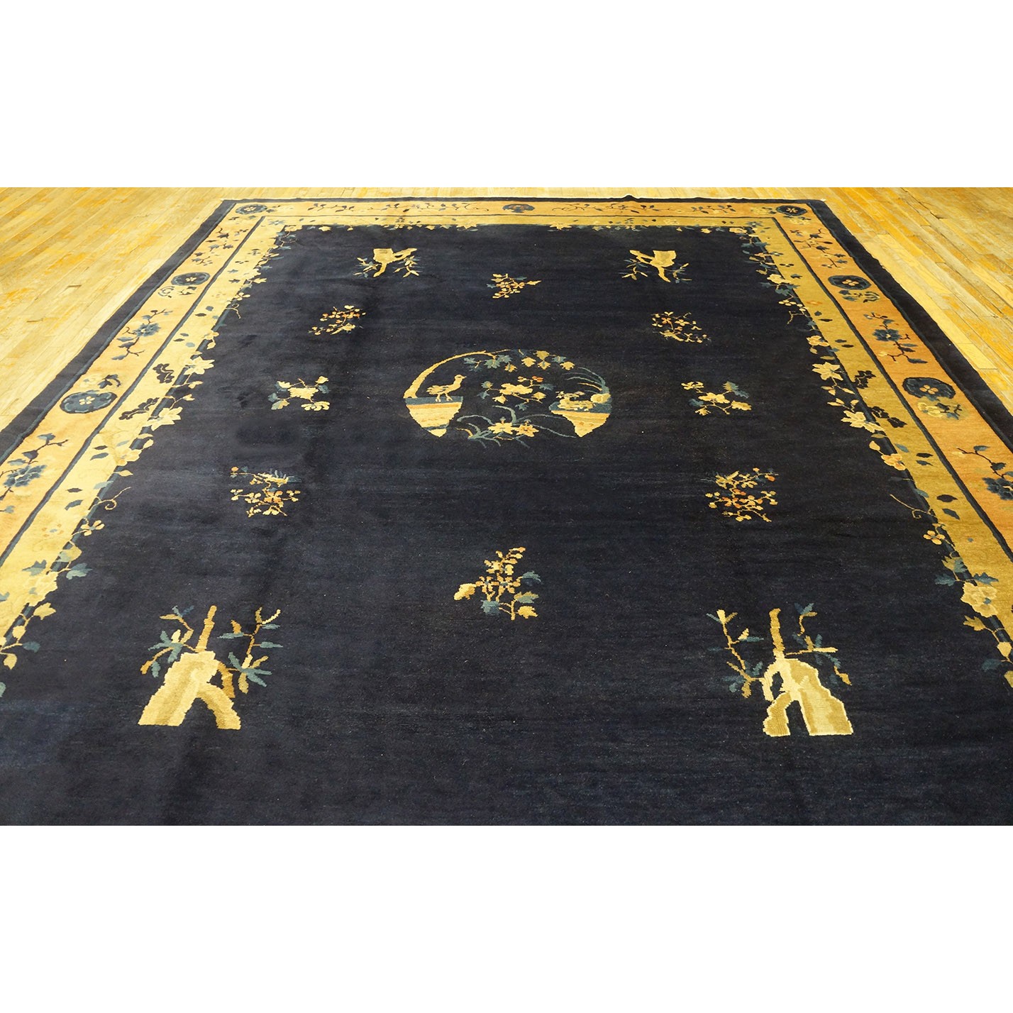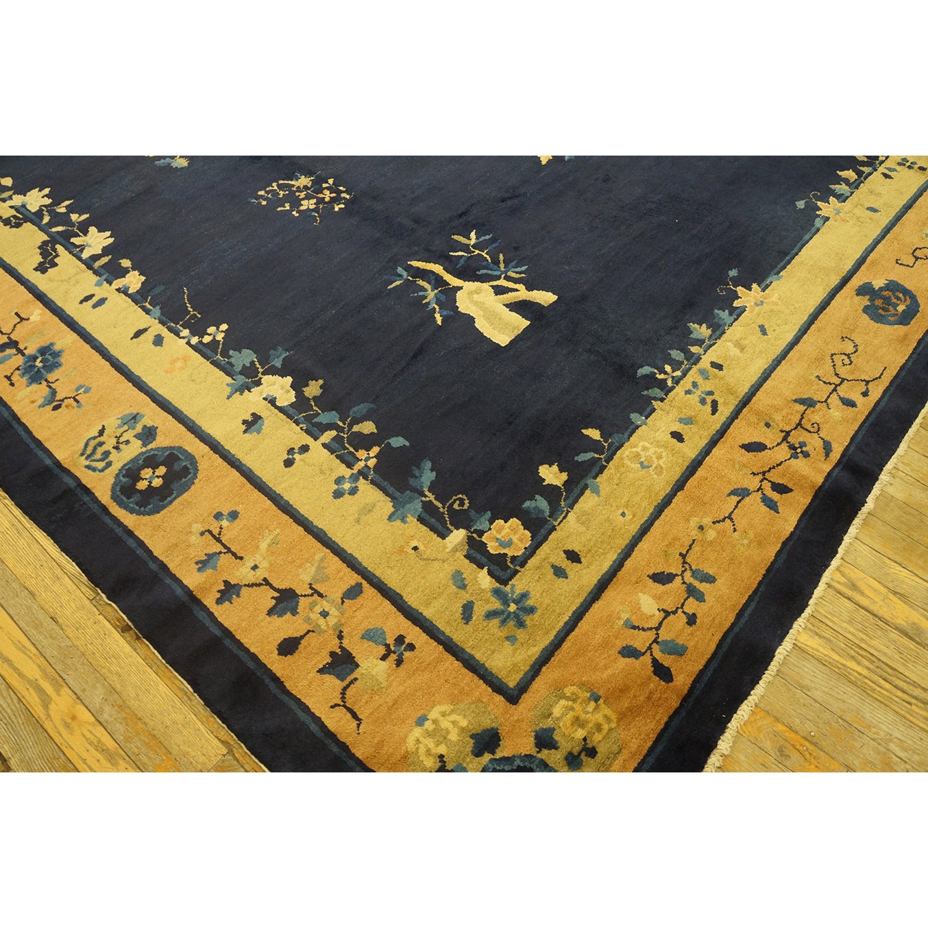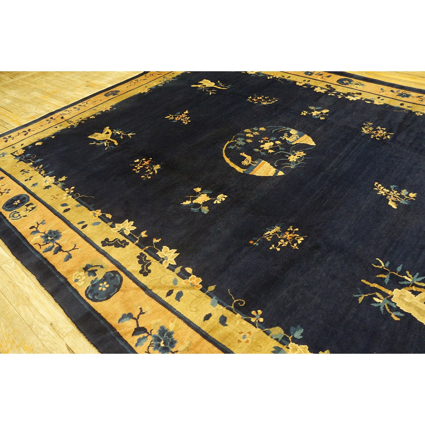DescriptionChineseCarpets made in China proper. See entries Ningshia, Peking, Art Deco. Chinese - PekingThe commercial Peking carpet is a later 19th century development, begun by importing weaves from Ningshia (see entry) to create and export industry aimed at Western markets. The foundation is cotton and the pile is a good quality carpet wool which takes dyes particularly well. The neat medium weave is in Persian (asymmetric) knots. Designs are strictly Chinese and the whole motif repertoire of Chinese art is employed. Blue and white is the most popular color combination and red is particularly rare. Sizes tend to 9 x 12 and larger, and few small pieces appear. For a short time in the early 1920s Persian designs were woven to capitalize on the death of new Iranian goods. The industry decimated by the Communist Revolution relocated to the Pearl River area. There is a good supply of antique carpets at reasonable prices. | |