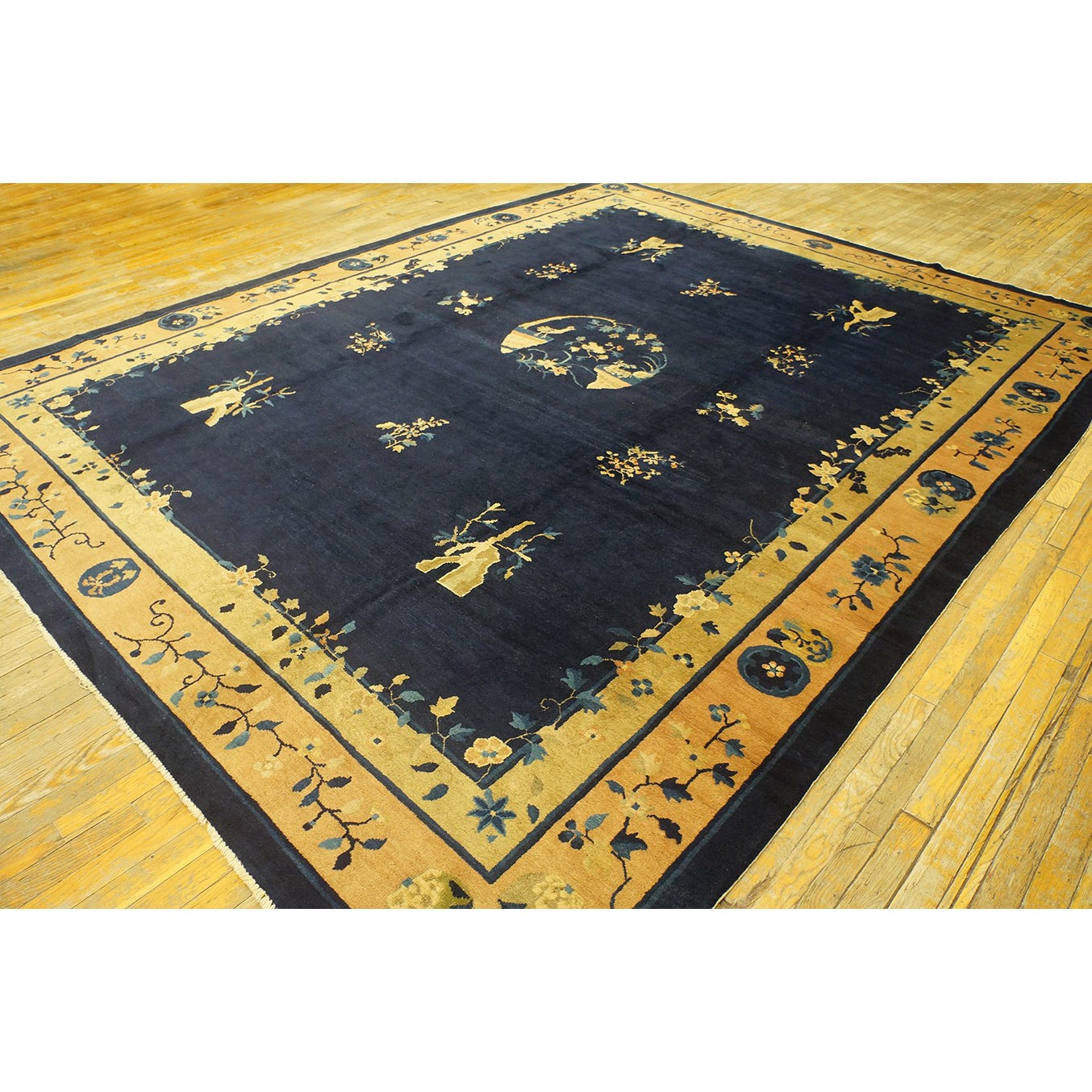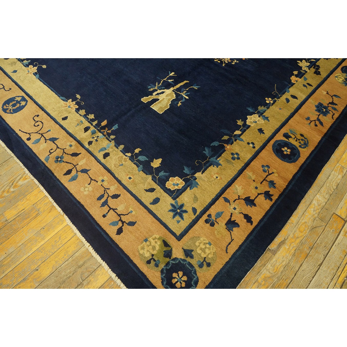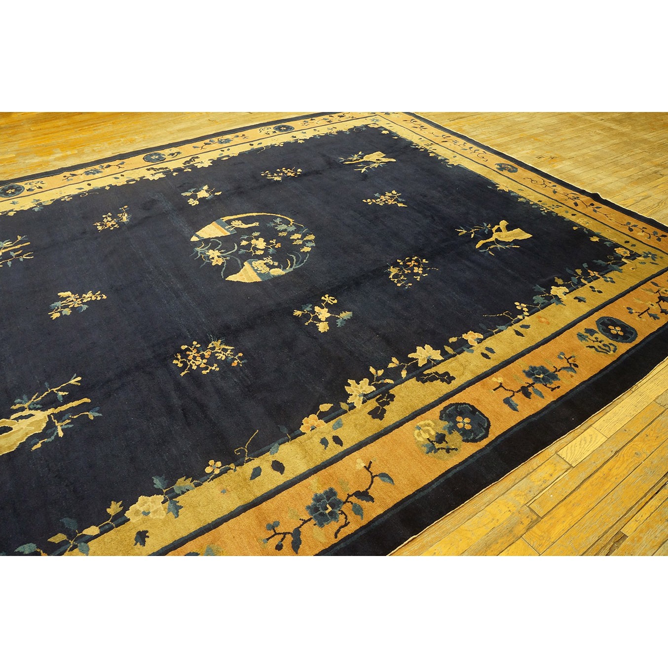 DescriptionChineseCarpets made in China proper. See entries Ningshia, Peking, Art Deco. Chinese - PekingThe commercial Peking carpet is a later 19th century development, begun by importing weaves from Ningshia (see entry) to create and export industry aimed at Western markets. The foundation is cotton and the pile is a good quality carpet wool which takes dyes particularly well. The neat medium weave is in Persian (asymmetric) knots. Designs are strictly Chinese and the whole motif repertoire of Chinese art is employed. Blue and white is the most popular color combination and red is particularly rare. Sizes tend to 9 x 12 and larger, and few small pieces appear. For a short time in the early 1920s Persian designs were woven to capitalize on the death of new Iranian goods. The industry decimated by the Communist Revolution relocated to the Pearl River area. There is a good supply of antique carpets at reasonable prices. | |