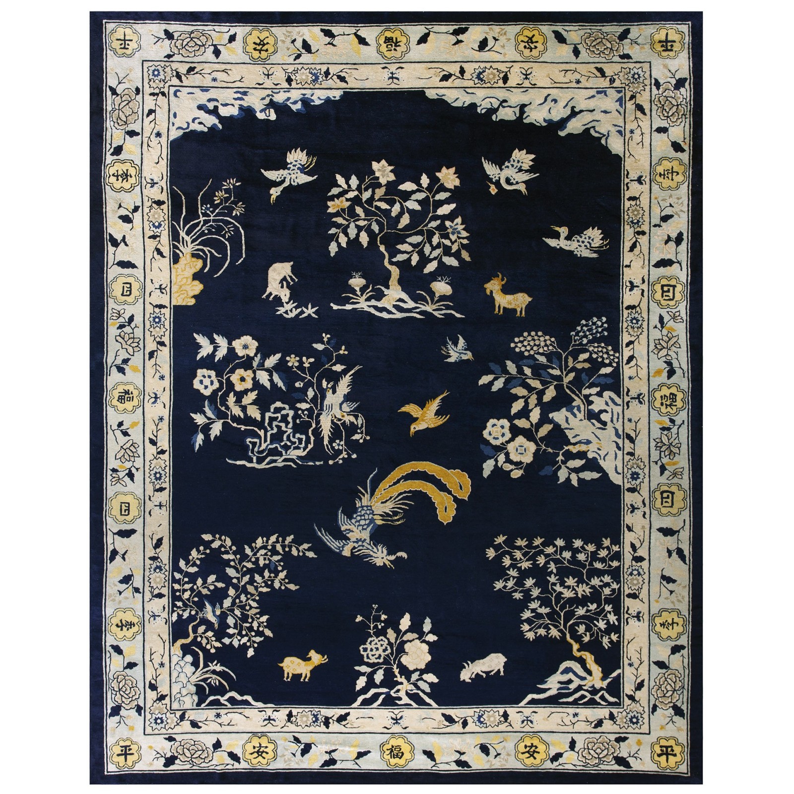 DescriptionChineseCarpets made in China proper. See entries Ningshia, Peking, Art Deco. Chinese - PekingThe commercial Peking carpet is a later 19th century development, begun by importing weaves from Ningshia (see entry) to create and export industry aimed at Western markets. The foundation is cotton and the pile is a good quality carpet wool which takes dyes particularly well. The neat medium weave is in Persian (asymmetric) knots. Designs are strictly Chinese and the whole motif repertoire of Chinese art is employed. Blue and white is the most popular color combination and red is particularly rare. Sizes tend to 9 x 12 and larger, and few small pieces appear. For a short time in the early 1920s Persian designs were woven to capitalize on the death of new Iranian goods. The industry decimated by the Communist Revolution relocated to the Pearl River area. There is a good supply of antique carpets at reasonable prices. | |