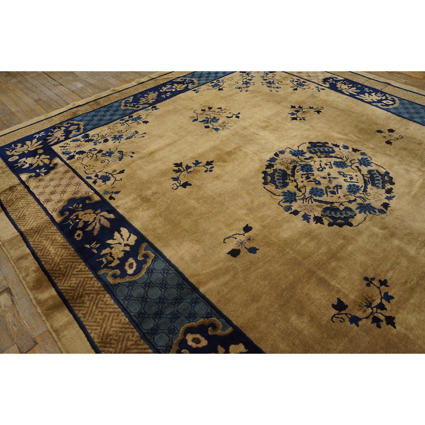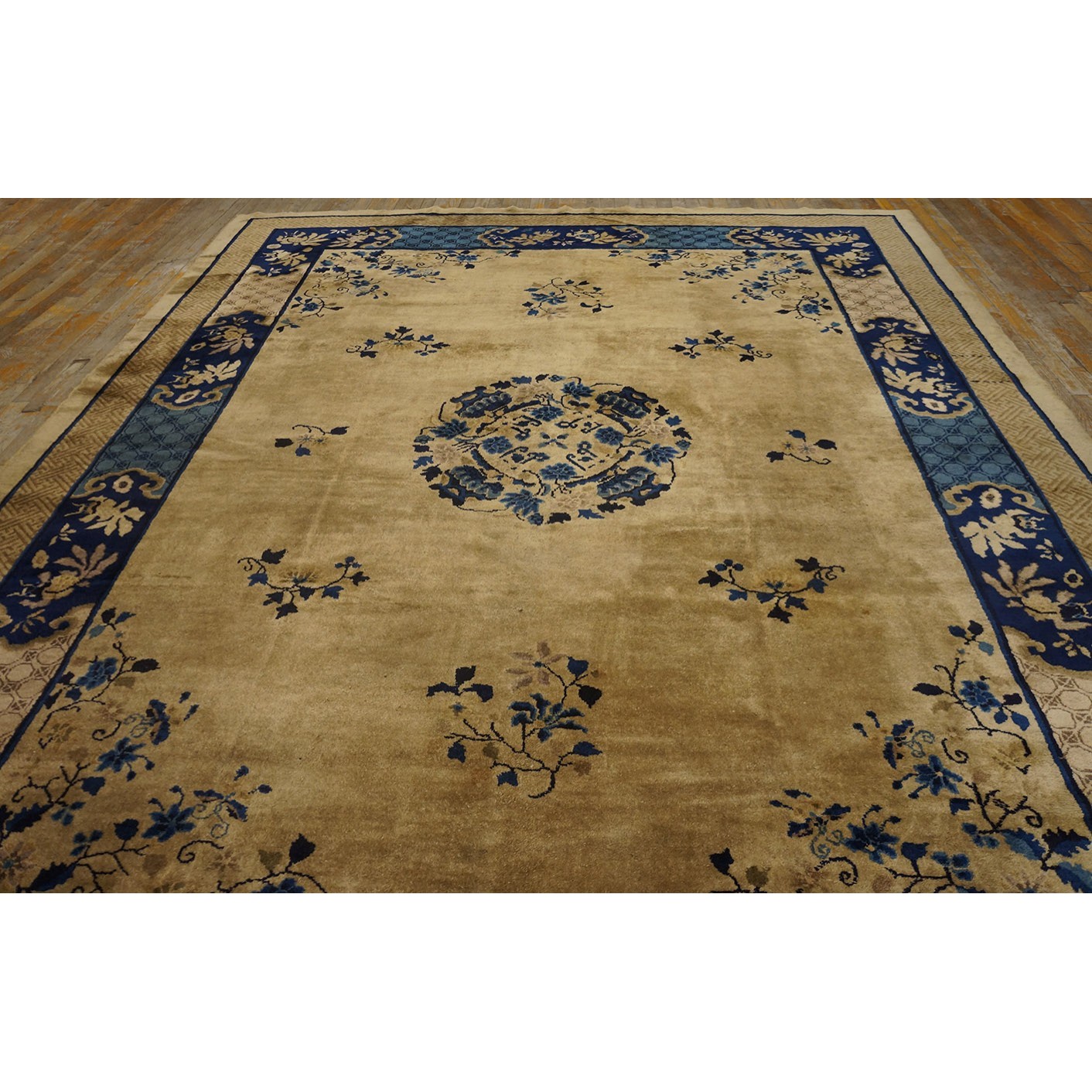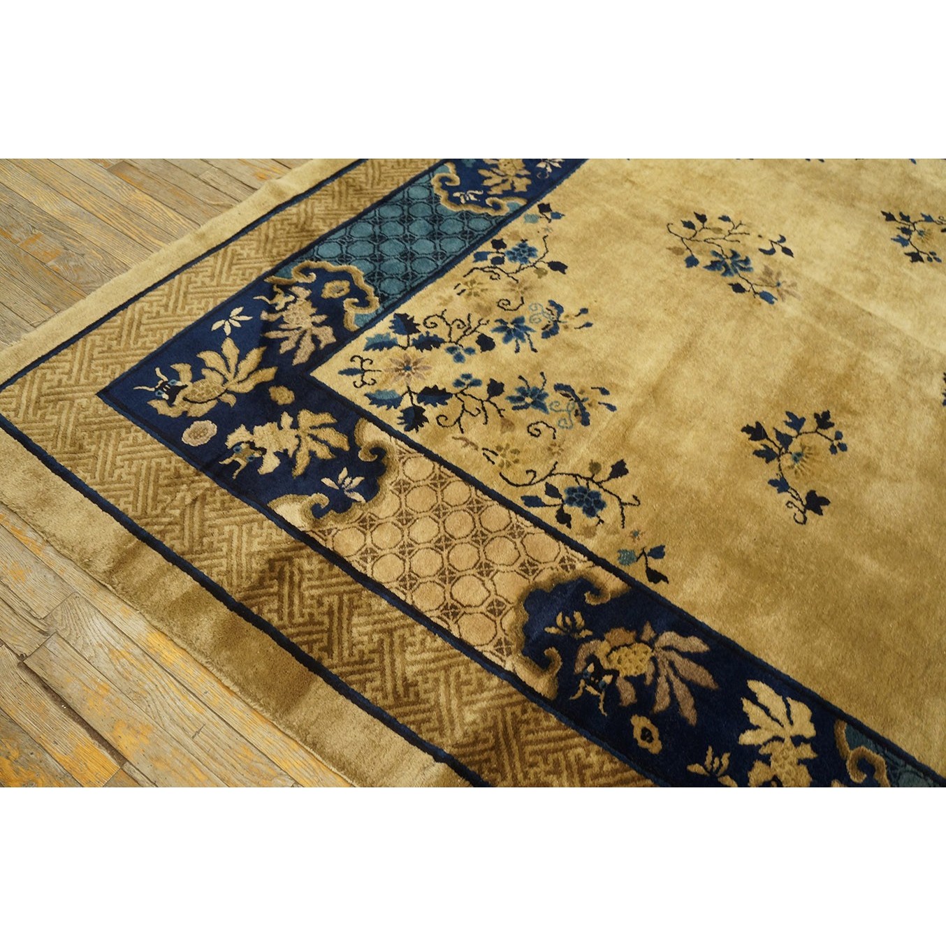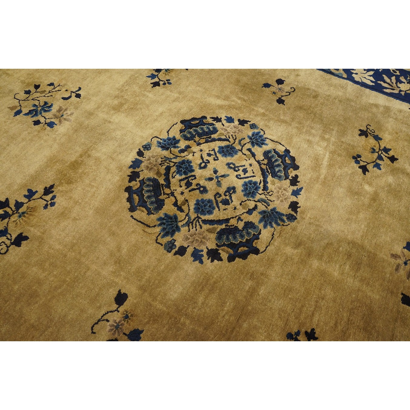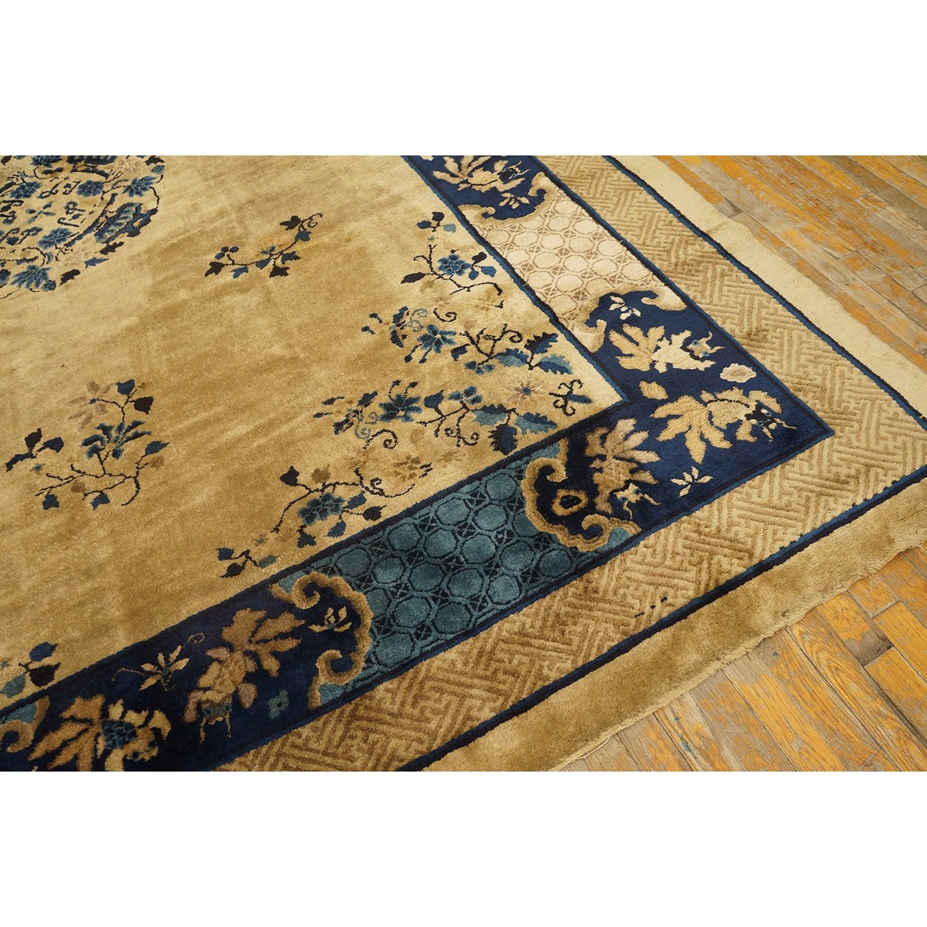 DescriptionChineseCarpets made in China proper. See entries Ningshia, Peking, Art Deco. Chinese - PekingThe commercial Peking carpet is a later 19th century development, begun by importing weaves from Ningshia (see entry) to create and export industry aimed at Western markets. The foundation is cotton and the pile is a good quality carpet wool which takes dyes particularly well. The neat medium weave is in Persian (asymmetric) knots. Designs are strictly Chinese and the whole motif repertoire of Chinese art is employed. Blue and white is the most popular color combination and red is particularly rare. Sizes tend to 9 x 12 and larger, and few small pieces appear. For a short time in the early 1920s Persian designs were woven to capitalize on the death of new Iranian goods. The industry decimated by the Communist Revolution relocated to the Pearl River area. There is a good supply of antique carpets at reasonable prices. | |