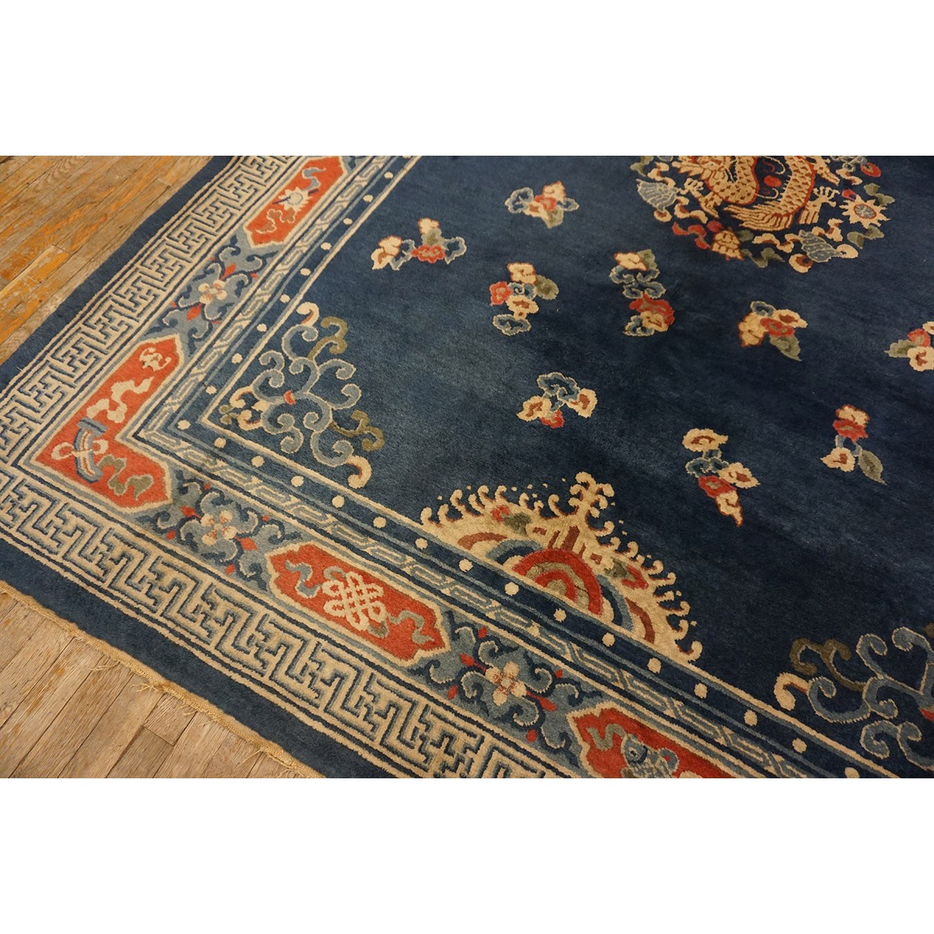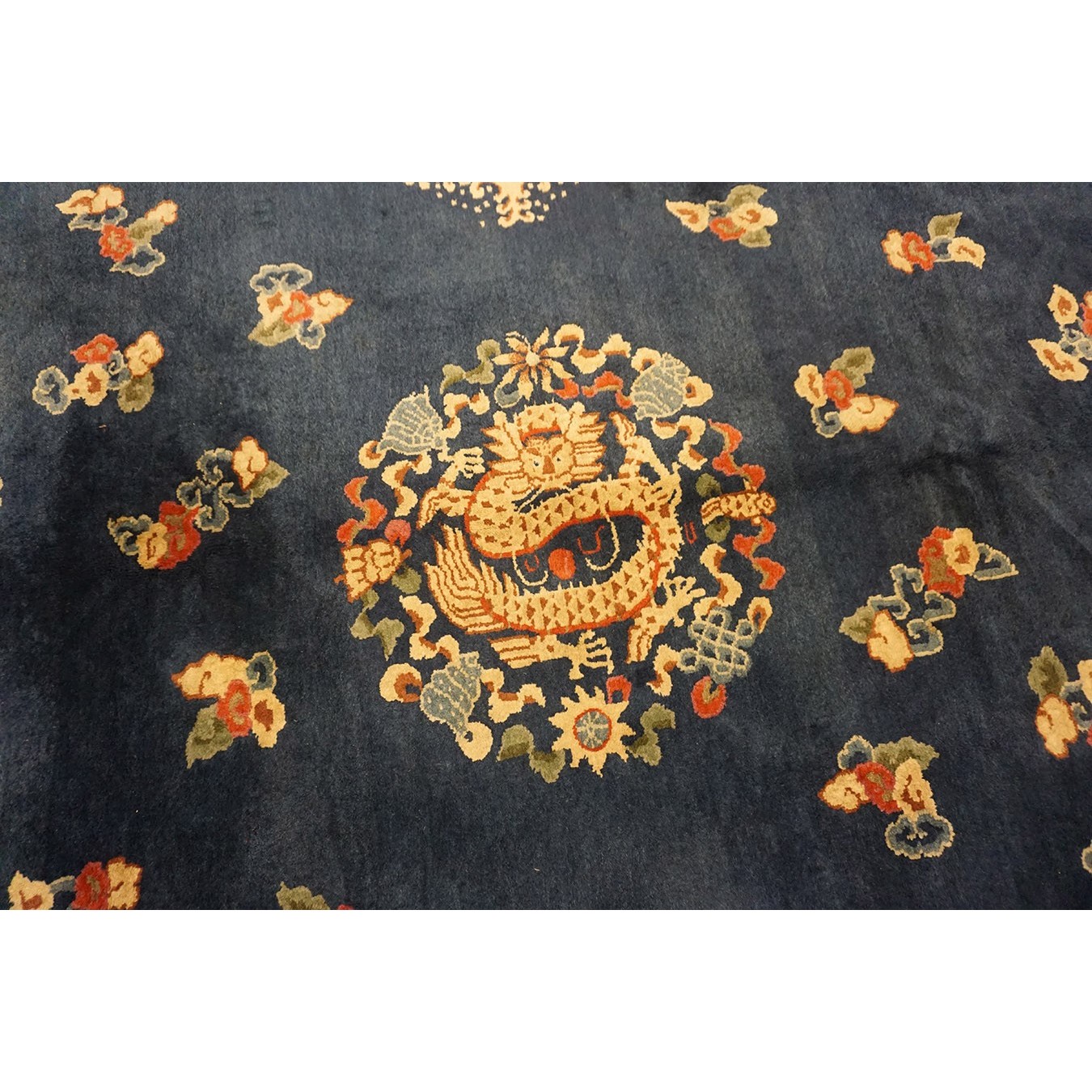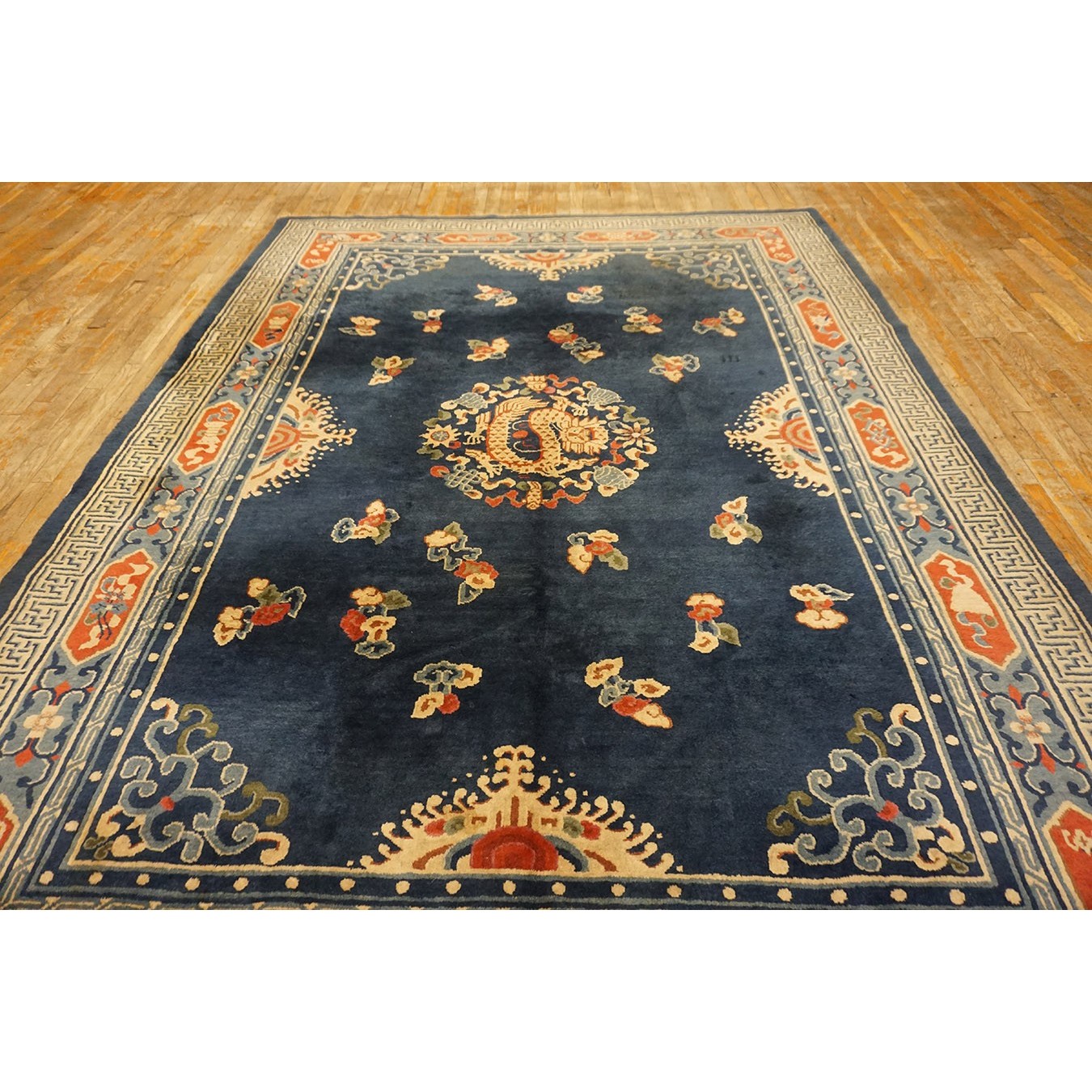 DescriptionChineseCarpets made in China proper. See entries Ningshia, Peking, Art Deco. Chinese - PekingThe commercial Peking carpet is a later 19th century development, begun by importing weaves from Ningshia (see entry) to create and export industry aimed at Western markets. The foundation is cotton and the pile is a good quality carpet wool which takes dyes particularly well. The neat medium weave is in Persian (asymmetric) knots. Designs are strictly Chinese and the whole motif repertoire of Chinese art is employed. Blue and white is the most popular color combination and red is particularly rare. Sizes tend to 9 x 12 and larger, and few small pieces appear. For a short time in the early 1920s Persian designs were woven to capitalize on the death of new Iranian goods. The industry decimated by the Communist Revolution relocated to the Pearl River area. There is a good supply of antique carpets at reasonable prices. | |