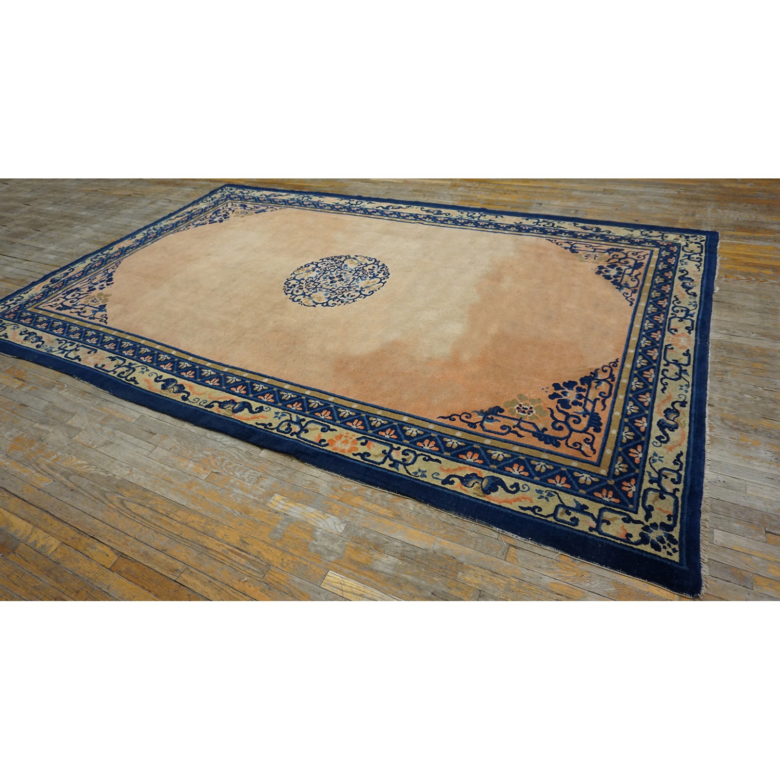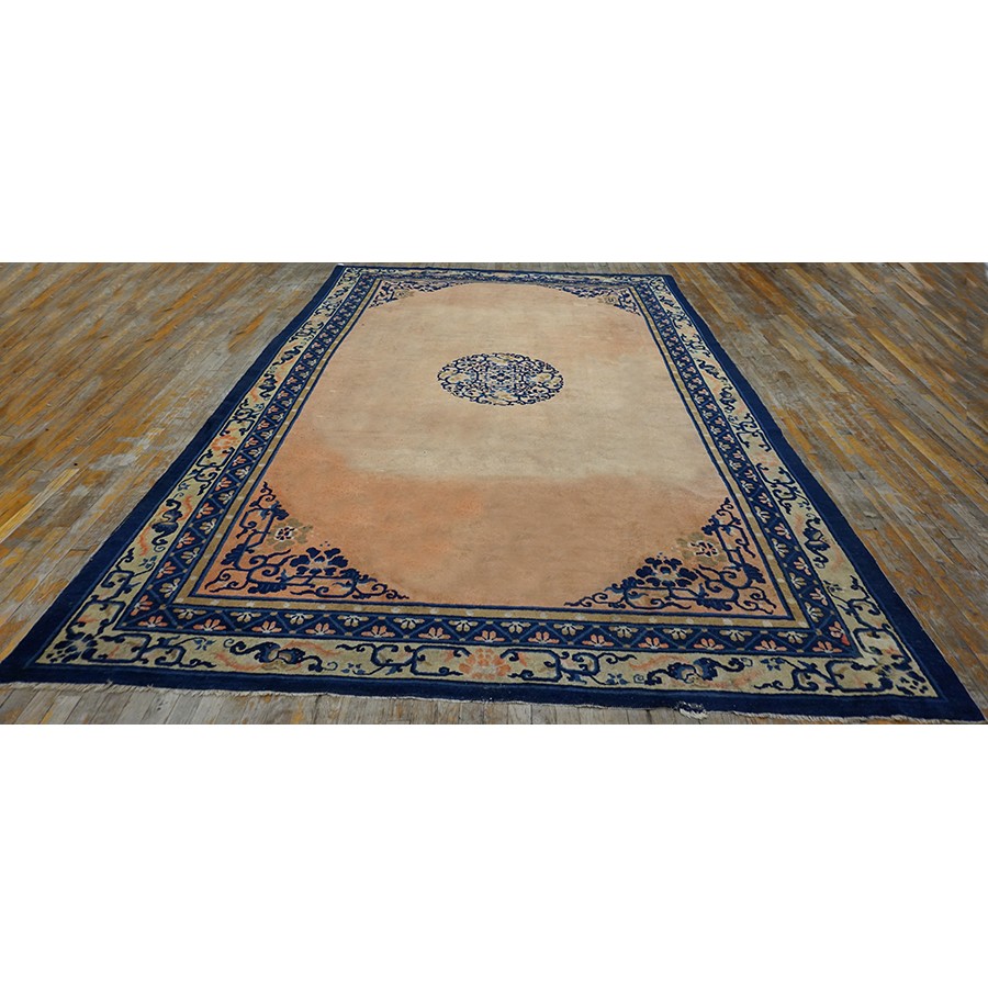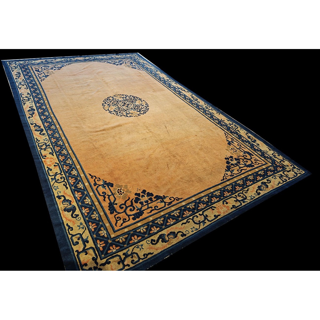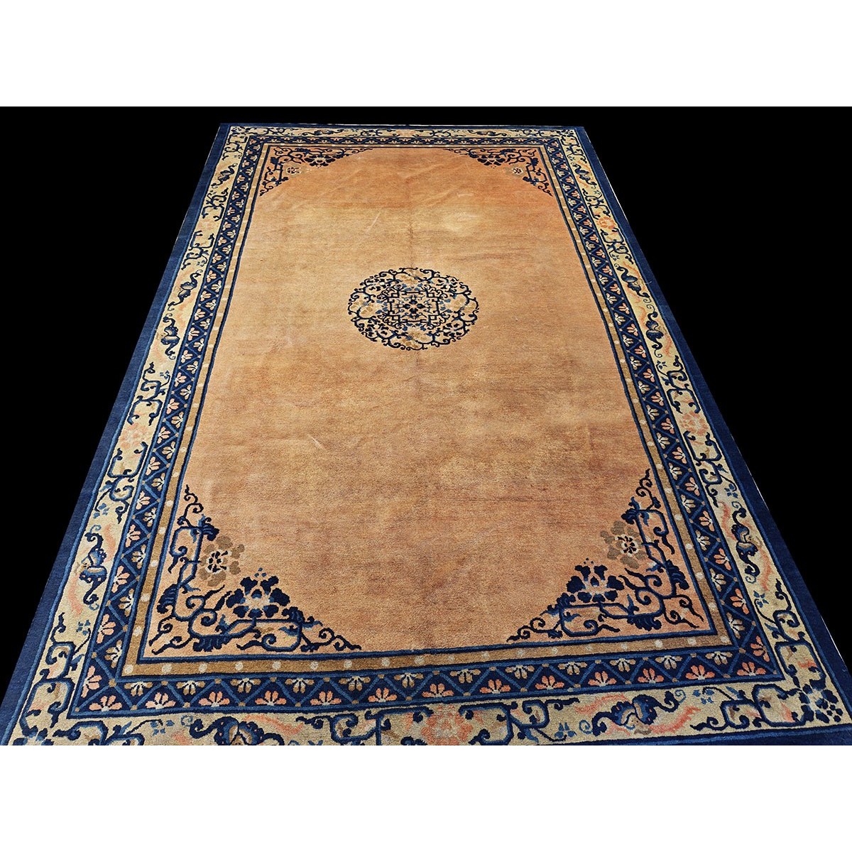 DescriptionChineseCarpets made in China proper. See entries Ningshia, Peking, Art Deco. Chinese - PekingThe commercial Peking carpet is a later 19th century development, begun by importing weaves from Ningshia (see entry) to create and export industry aimed at Western markets. The foundation is cotton and the pile is a good quality carpet wool which takes dyes particularly well. The neat medium weave is in Persian (asymmetric) knots. Designs are strictly Chinese and the whole motif repertoire of Chinese art is employed. Blue and white is the most popular color combination and red is particularly rare. Sizes tend to 9 x 12 and larger, and few small pieces appear. For a short time in the early 1920s Persian designs were woven to capitalize on the death of new Iranian goods. The industry decimated by the Communist Revolution relocated to the Pearl River area. There is a good supply of antique carpets at reasonable prices. | |