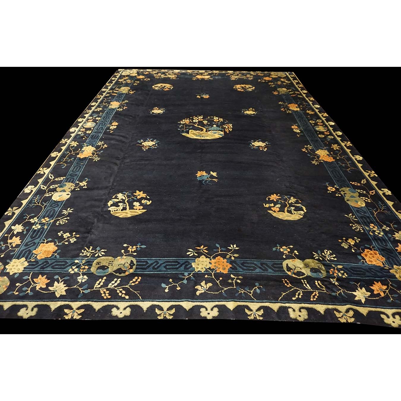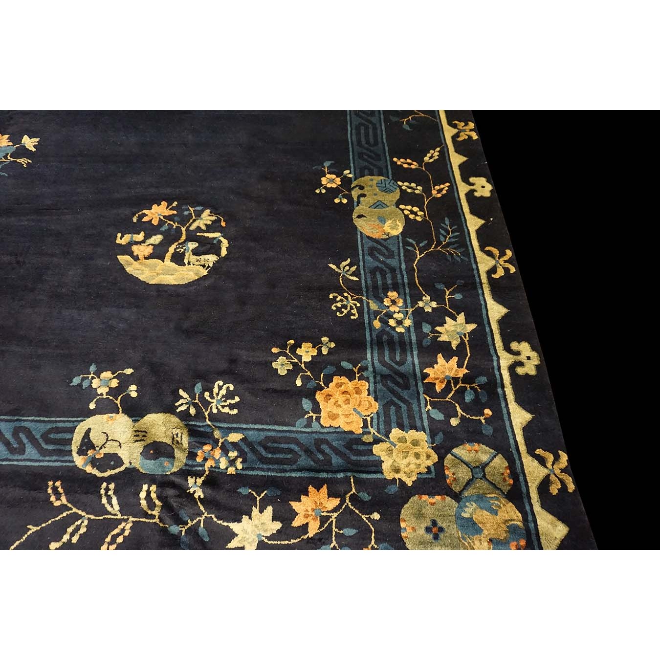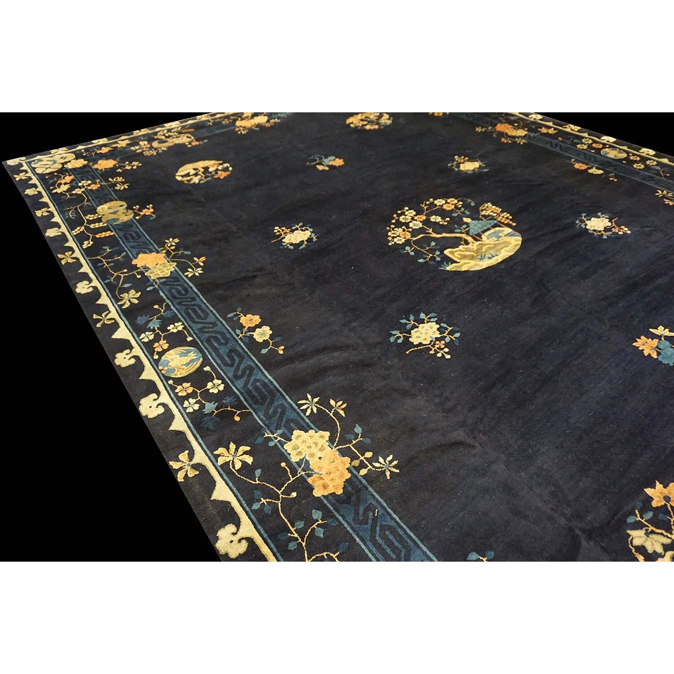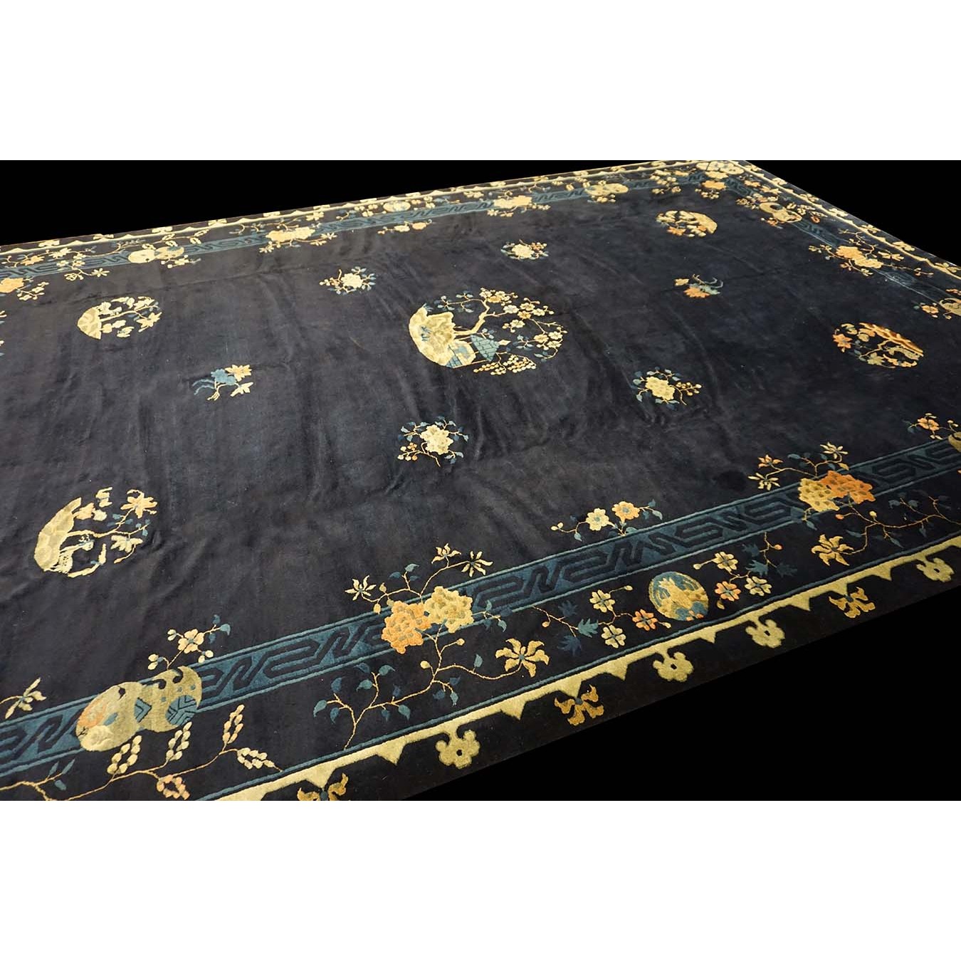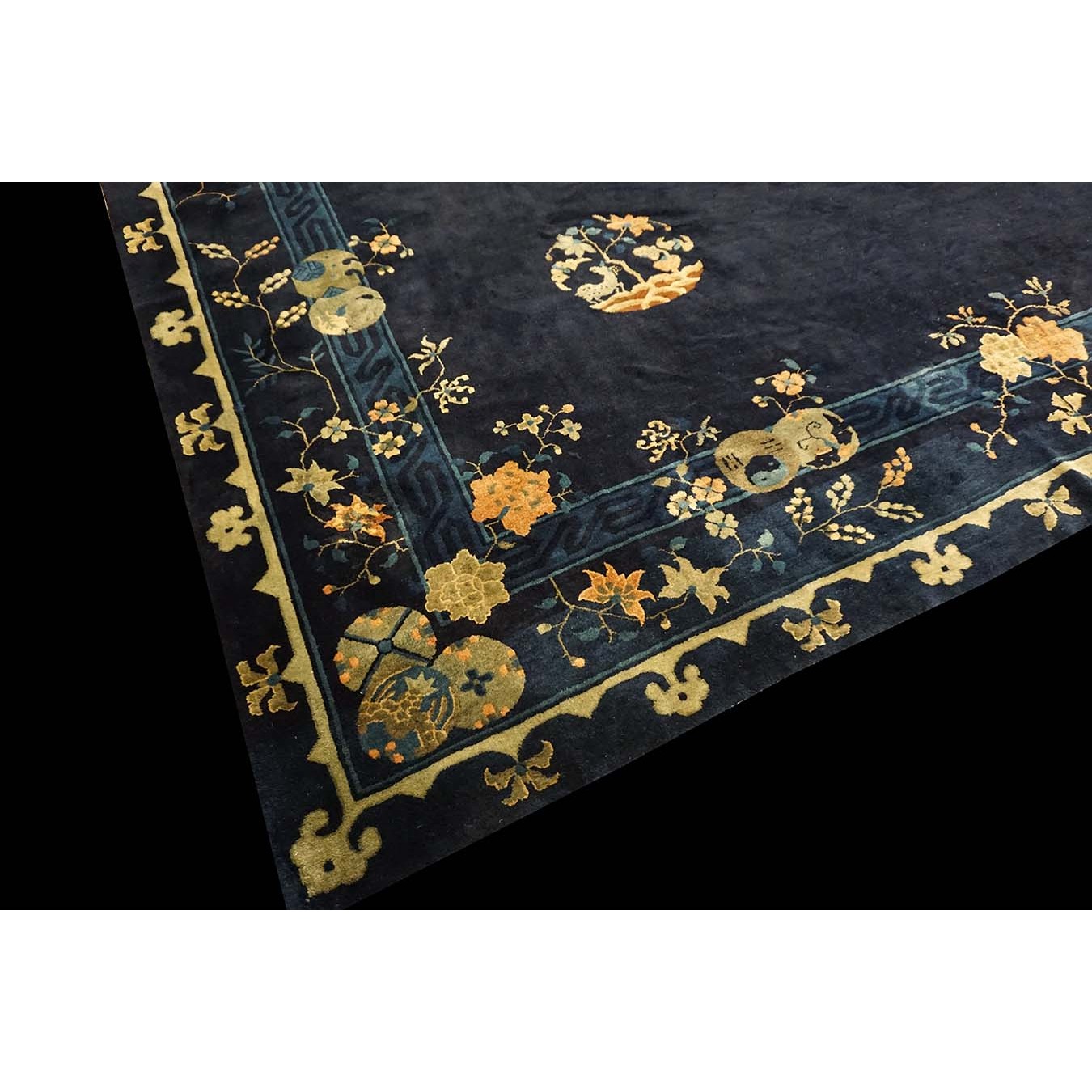DescriptionChineseCarpets made in China proper. See entries Ningshia, Peking, Art Deco. Chinese - PekingThe commercial Peking carpet is a later 19th century development, begun by importing weaves from Ningshia (see entry) to create and export industry aimed at Western markets. The foundation is cotton and the pile is a good quality carpet wool which takes dyes particularly well. The neat medium weave is in Persian (asymmetric) knots. Designs are strictly Chinese and the whole motif repertoire of Chinese art is employed. Blue and white is the most popular color combination and red is particularly rare. Sizes tend to 9 x 12 and larger, and few small pieces appear. For a short time in the early 1920s Persian designs were woven to capitalize on the death of new Iranian goods. The industry decimated by the Communist Revolution relocated to the Pearl River area. There is a good supply of antique carpets at reasonable prices. | |