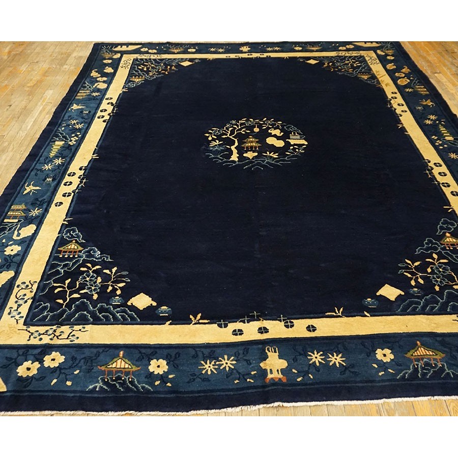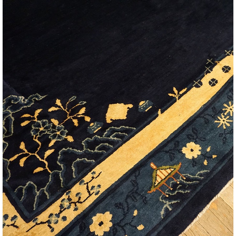 DescriptionChineseCarpets made in China proper. See entries Ningshia, Peking, Art Deco. Chinese - PekingThe commercial Peking carpet is a later 19th century development, begun by importing weaves from Ningshia (see entry) to create and export industry aimed at Western markets. The foundation is cotton and the pile is a good quality carpet wool which takes dyes particularly well. The neat medium weave is in Persian (asymmetric) knots. Designs are strictly Chinese and the whole motif repertoire of Chinese art is employed. Blue and white is the most popular color combination and red is particularly rare. Sizes tend to 9 x 12 and larger, and few small pieces appear. For a short time in the early 1920s Persian designs were woven to capitalize on the death of new Iranian goods. The industry decimated by the Communist Revolution relocated to the Pearl River area. There is a good supply of antique carpets at reasonable prices. | |