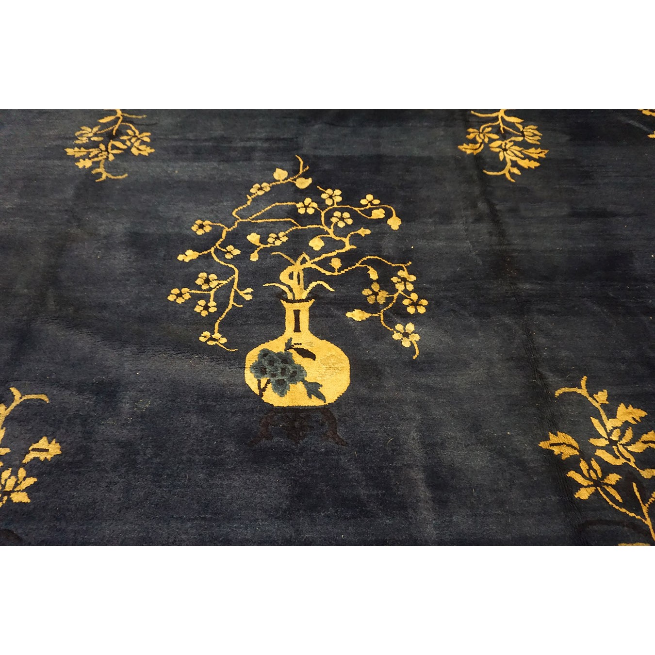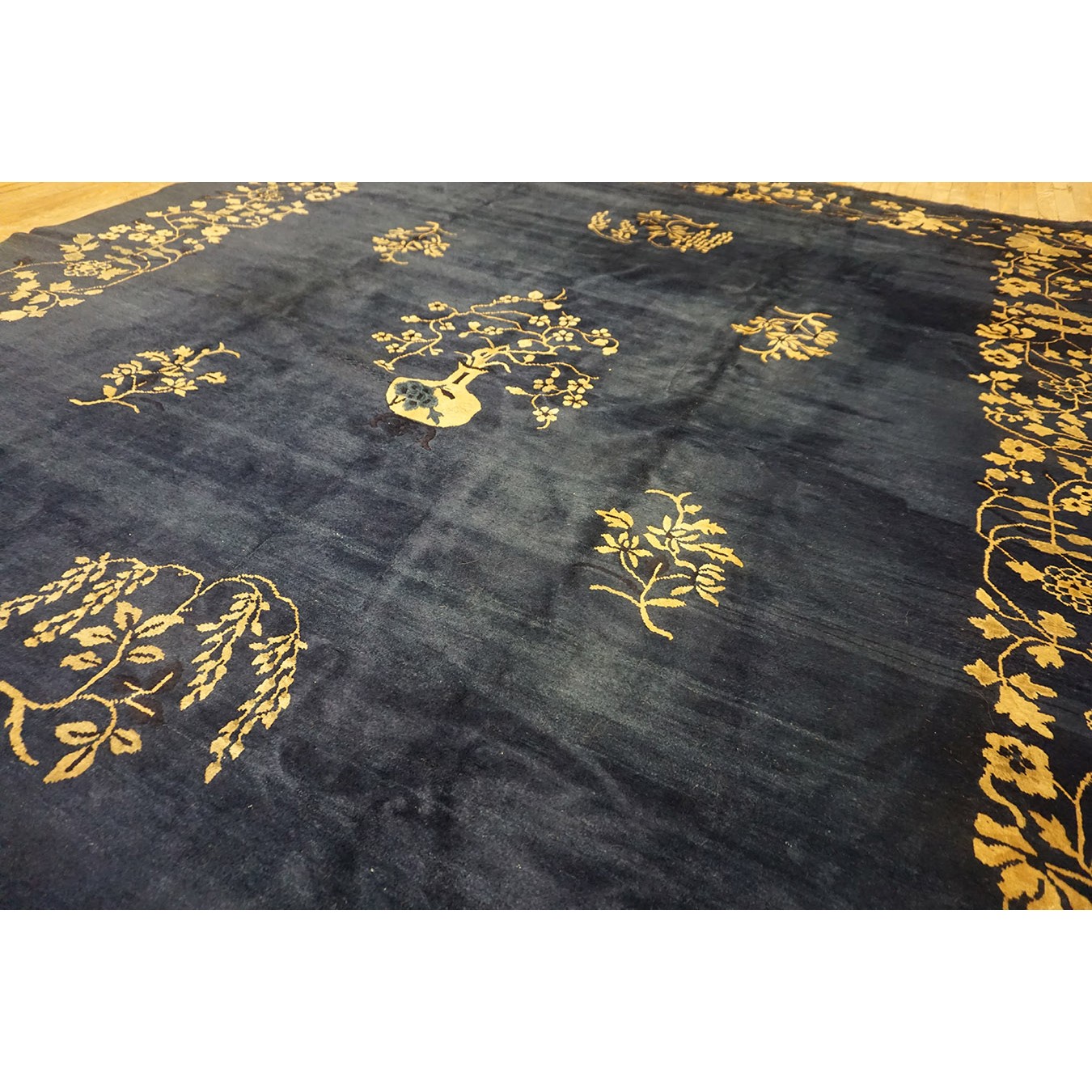 DescriptionChineseCarpets made in China proper. See entries Ningshia, Peking, Art Deco. Chinese - PekingThe commercial Peking carpet is a later 19th century development, begun by importing weaves from Ningshia (see entry) to create and export industry aimed at Western markets. The foundation is cotton and the pile is a good quality carpet wool which takes dyes particularly well. The neat medium weave is in Persian (asymmetric) knots. Designs are strictly Chinese and the whole motif repertoire of Chinese art is employed. Blue and white is the most popular color combination and red is particularly rare. Sizes tend to 9 x 12 and larger, and few small pieces appear. For a short time in the early 1920s Persian designs were woven to capitalize on the death of new Iranian goods. The industry decimated by the Communist Revolution relocated to the Pearl River area. There is a good supply of antique carpets at reasonable prices. | |