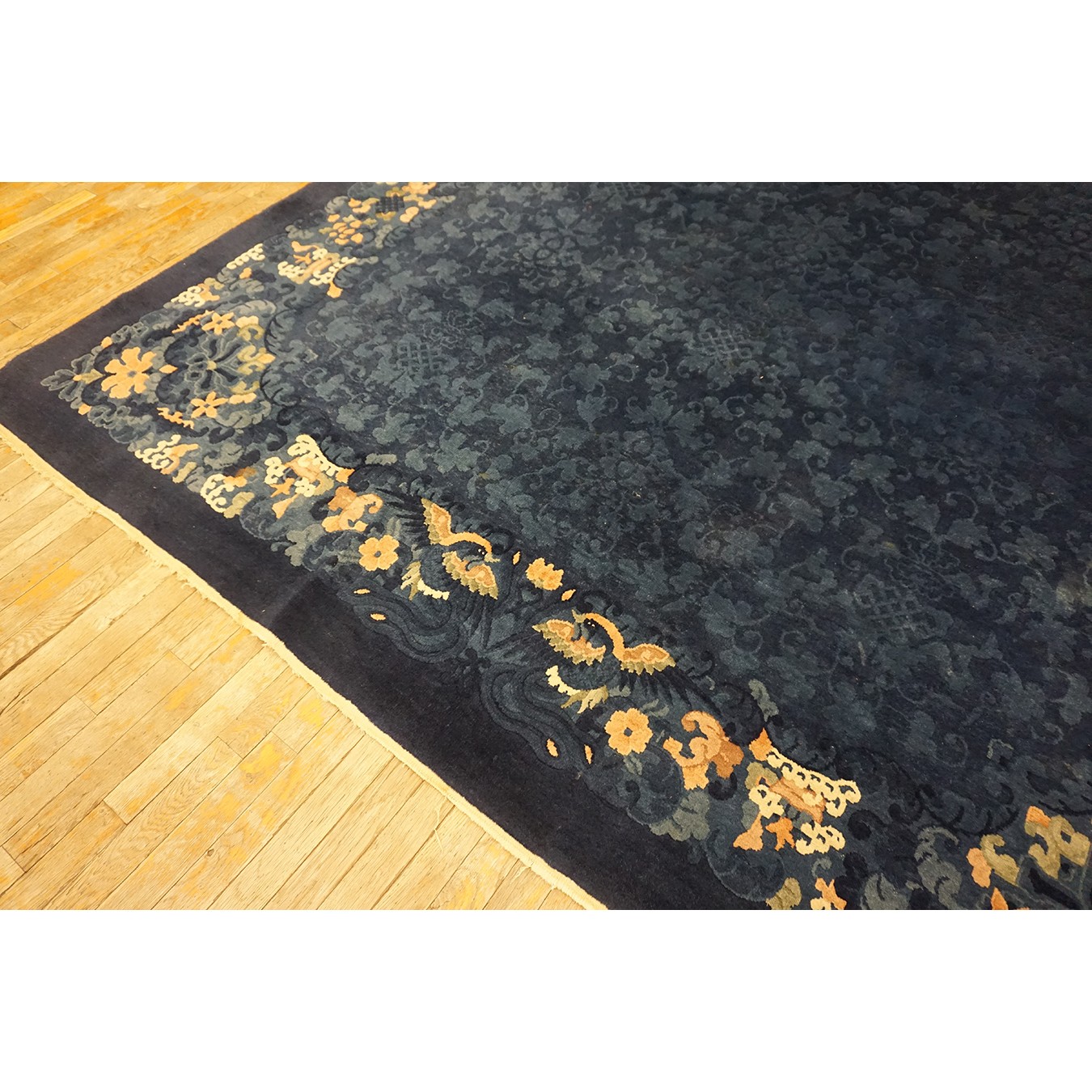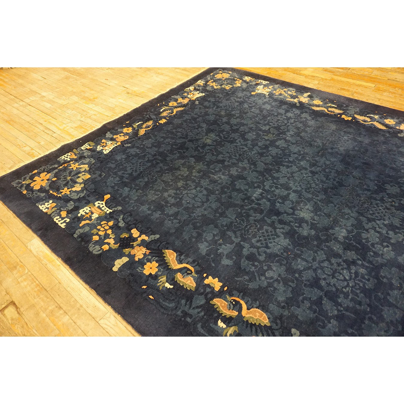 The commercial Peking carpet is a later 19th century development, begun by importing weaves from Ningshia (see entry) to create and export industry aimed at Western markets. The foundation is cotton and the pile is a good quality carpet wool which takes dyes particularly well. The neat medium weave is in Persian (asymmetric) knots. Designs are strictly Chinese and the whole motif repertoire of Chinese art is employed. Blue and white is the most popular color combination and red is particularly rare. Sizes tend to 9’ x 12’ and larger, and few small pieces appear. For a short time in the early 1920’s Persian designs were woven to capitalize on the death of new Iranian goods. The industry decimated by the Communist Revolution relocated to the Pearl River area. There is a good supply of antique carpets at reasonable prices.