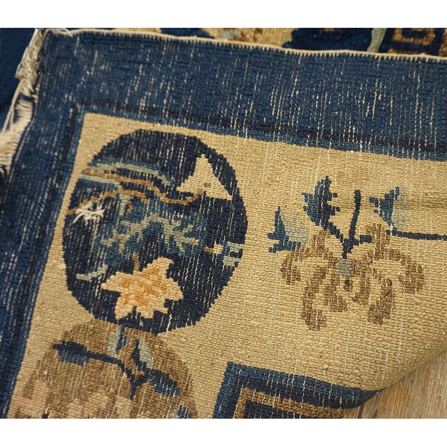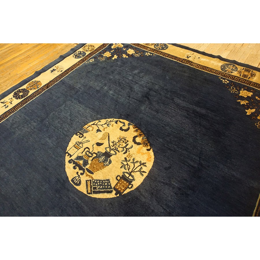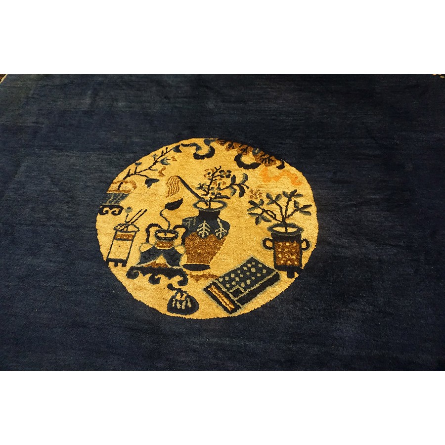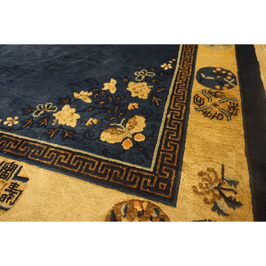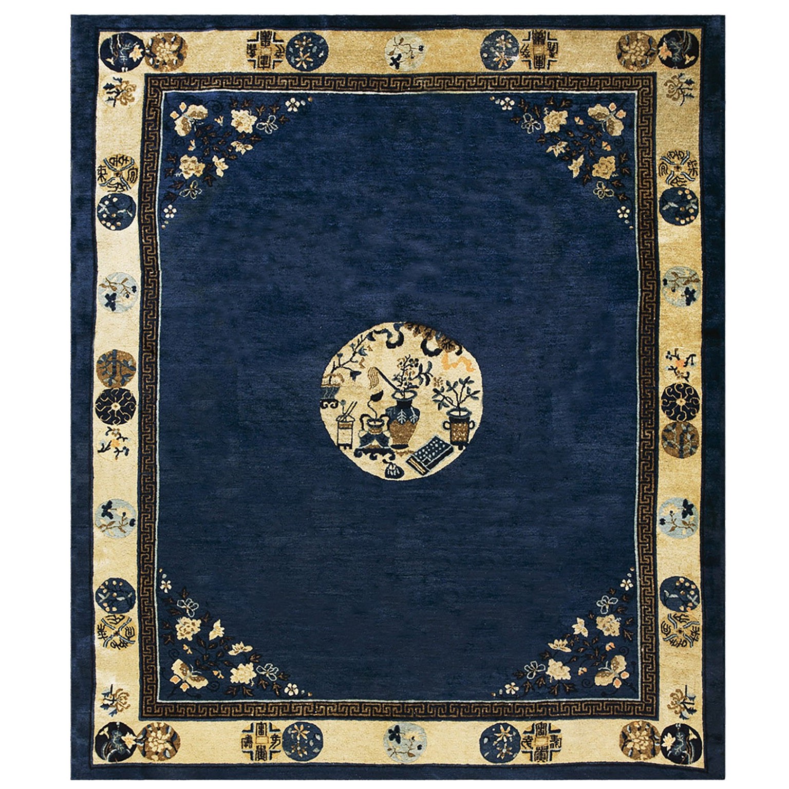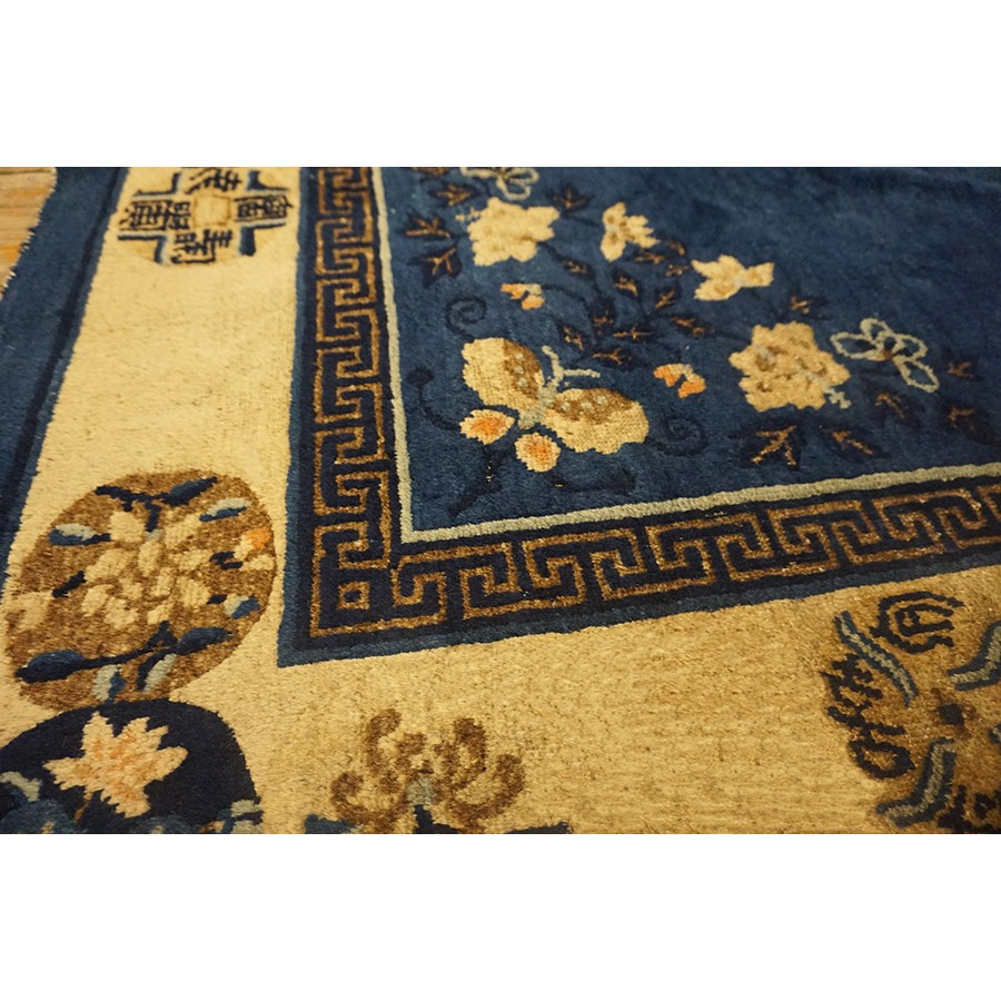 DescriptionChineseCarpets made in China proper. See entries Ningshia, Peking, Art Deco. Chinese - PekingThe commercial Peking carpet is a later 19th century development, begun by importing weaves from Ningshia (see entry) to create and export industry aimed at Western markets. The foundation is cotton and the pile is a good quality carpet wool which takes dyes particularly well. The neat medium weave is in Persian (asymmetric) knots. Designs are strictly Chinese and the whole motif repertoire of Chinese art is employed. Blue and white is the most popular color combination and red is particularly rare. Sizes tend to 9 x 12 and larger, and few small pieces appear. For a short time in the early 1920s Persian designs were woven to capitalize on the death of new Iranian goods. The industry decimated by the Communist Revolution relocated to the Pearl River area. There is a good supply of antique carpets at reasonable prices. | |