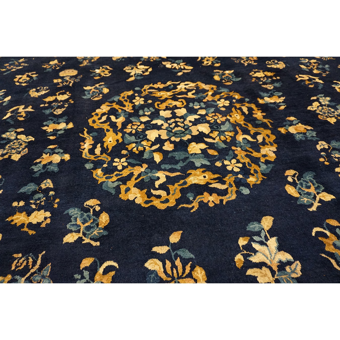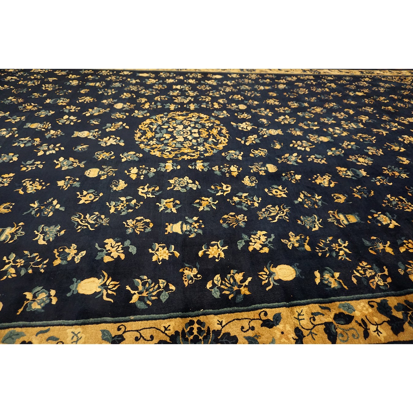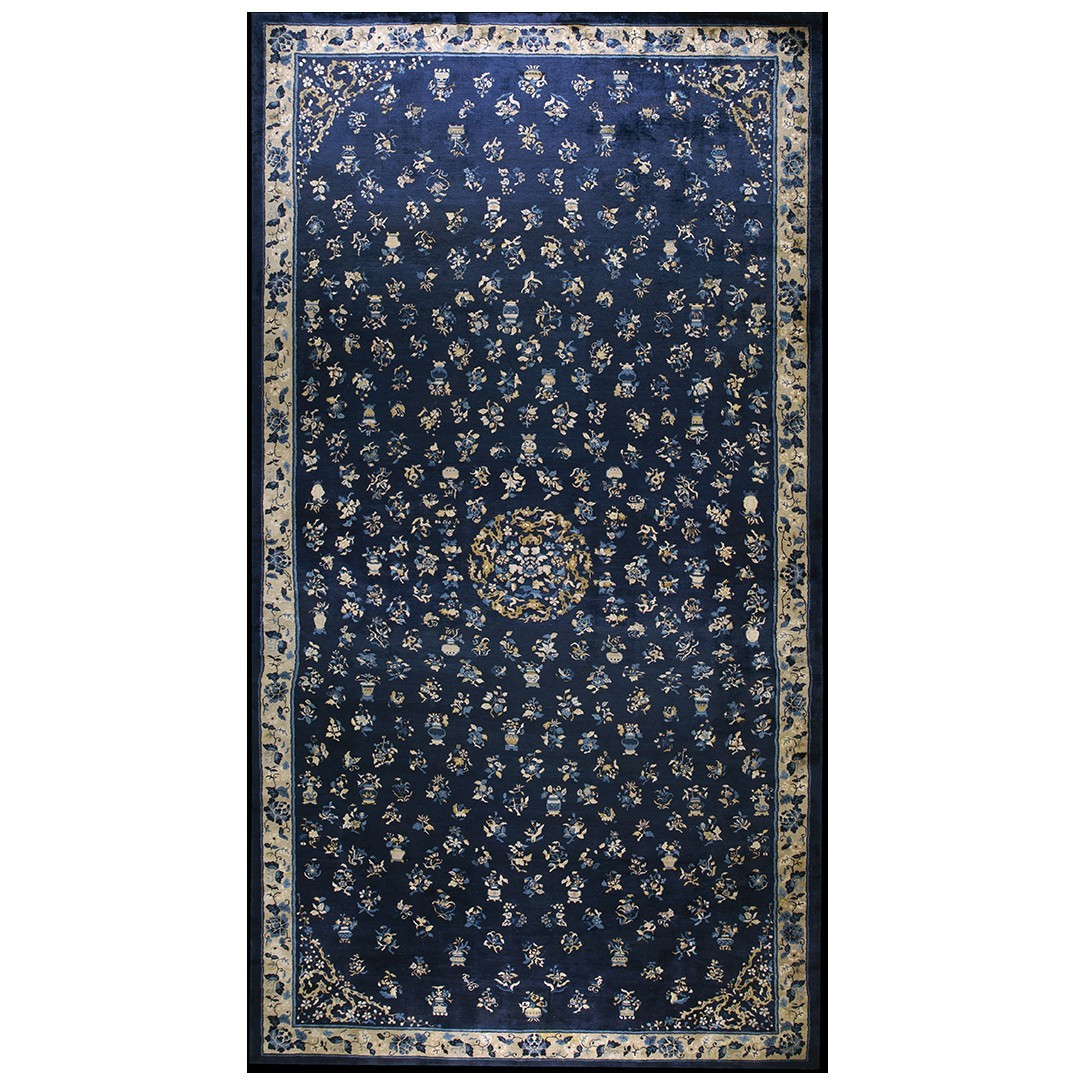 DescriptionChineseCarpets made in China proper. See entries Ningshia, Peking, Art Deco. Chinese - PekingThe commercial Peking carpet is a later 19th century development, begun by importing weaves from Ningshia (see entry) to create and export industry aimed at Western markets. The foundation is cotton and the pile is a good quality carpet wool which takes dyes particularly well. The neat medium weave is in Persian (asymmetric) knots. Designs are strictly Chinese and the whole motif repertoire of Chinese art is employed. Blue and white is the most popular color combination and red is particularly rare. Sizes tend to 9 x 12 and larger, and few small pieces appear. For a short time in the early 1920s Persian designs were woven to capitalize on the death of new Iranian goods. The industry decimated by the Communist Revolution relocated to the Pearl River area. There is a good supply of antique carpets at reasonable prices. | |