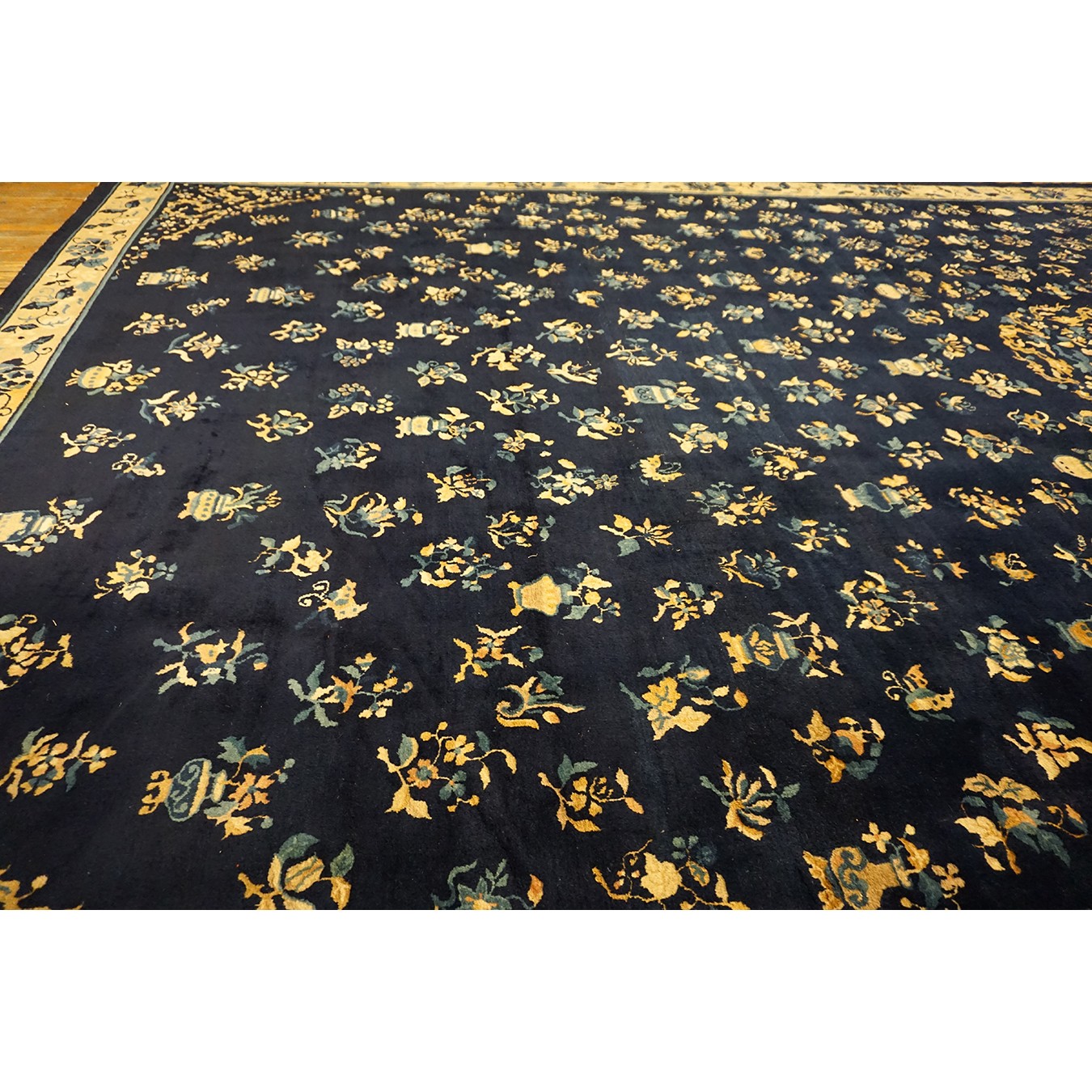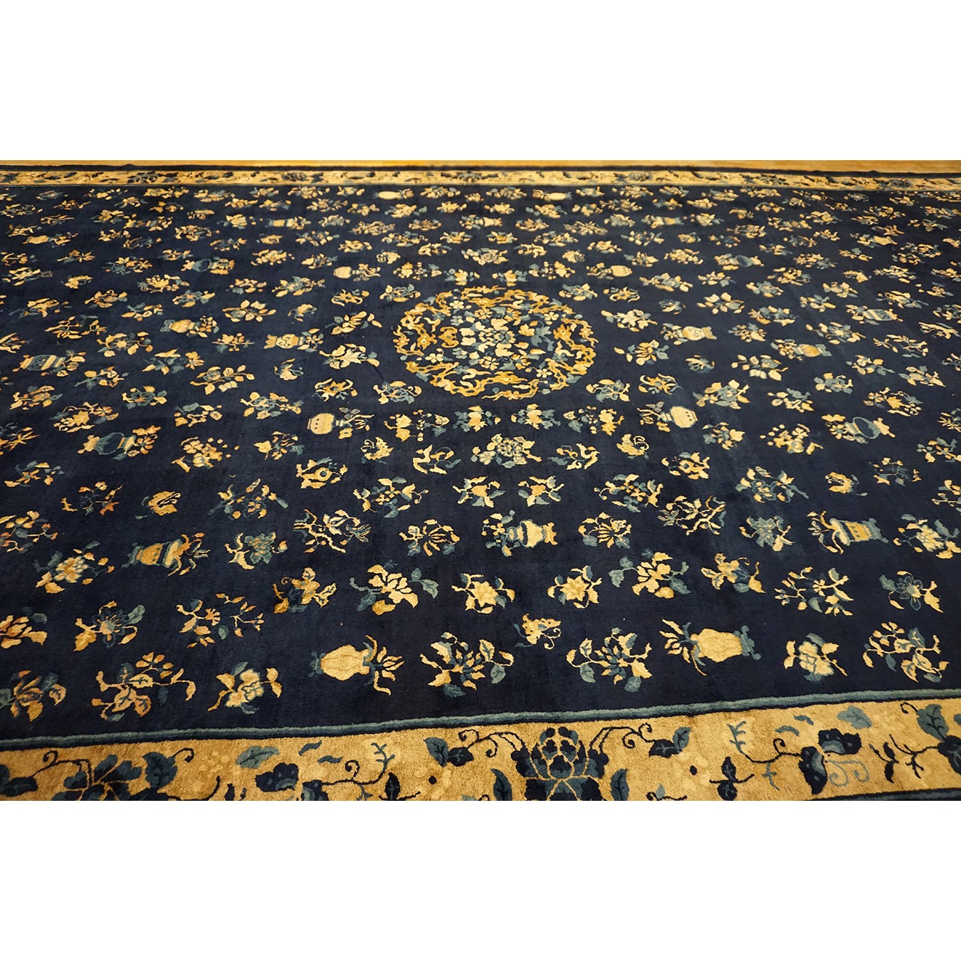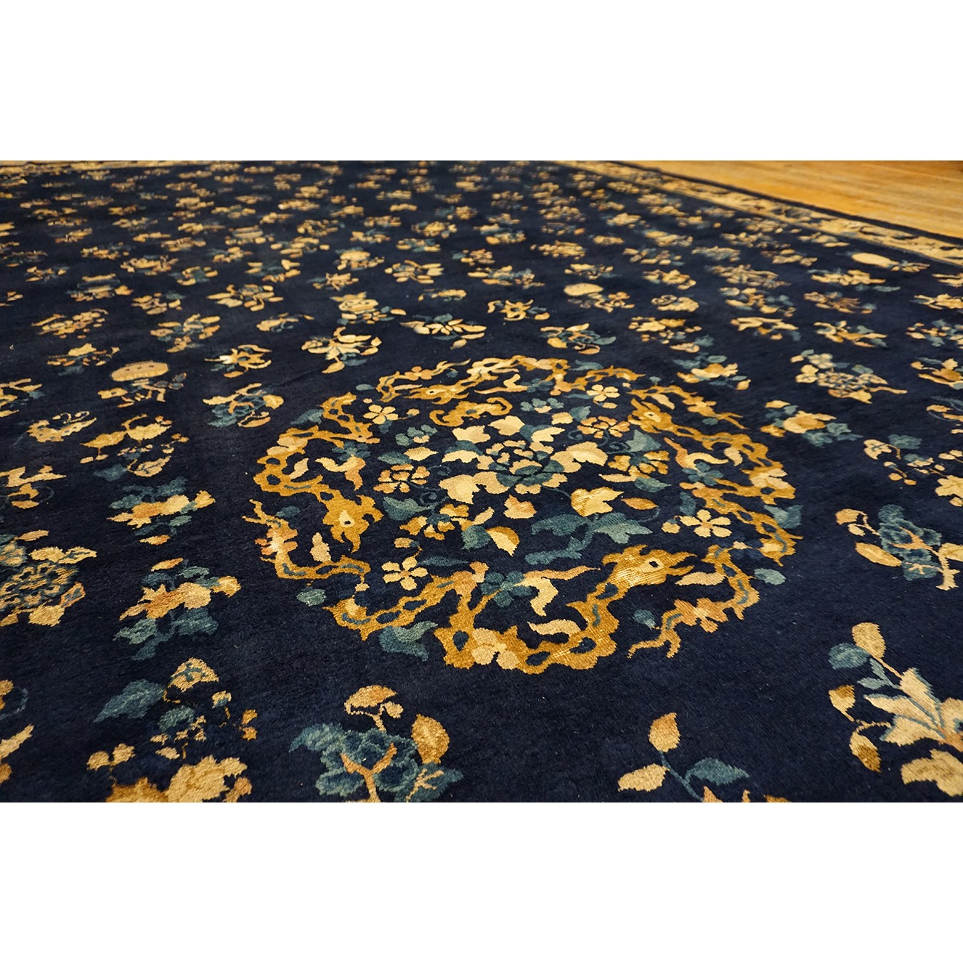 DescriptionChineseCarpets made in China proper. See entries Ningshia, Peking, Art Deco. Chinese - PekingThe commercial Peking carpet is a later 19th century development, begun by importing weaves from Ningshia (see entry) to create and export industry aimed at Western markets. The foundation is cotton and the pile is a good quality carpet wool which takes dyes particularly well. The neat medium weave is in Persian (asymmetric) knots. Designs are strictly Chinese and the whole motif repertoire of Chinese art is employed. Blue and white is the most popular color combination and red is particularly rare. Sizes tend to 9 x 12 and larger, and few small pieces appear. For a short time in the early 1920s Persian designs were woven to capitalize on the death of new Iranian goods. The industry decimated by the Communist Revolution relocated to the Pearl River area. There is a good supply of antique carpets at reasonable prices. | |