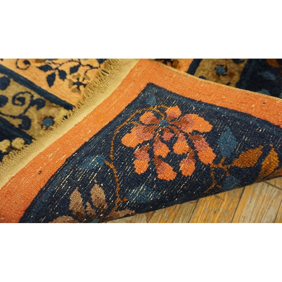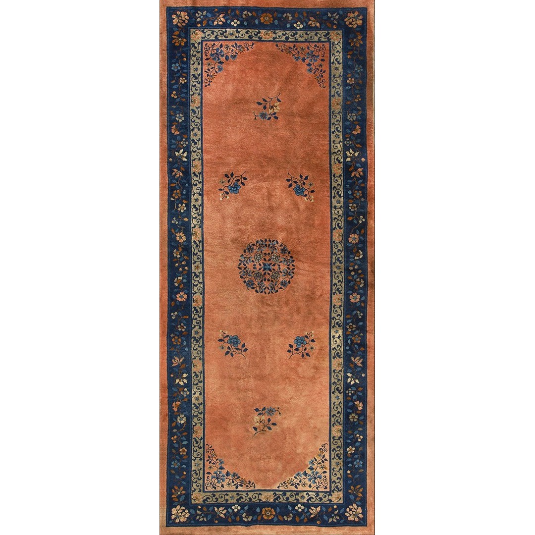 DescriptionChineseCarpets made in China proper. See entries Ningshia, Peking, Art Deco. Chinese - PekingThe commercial Peking carpet is a later 19th century development, begun by importing weaves from Ningshia (see entry) to create and export industry aimed at Western markets. The foundation is cotton and the pile is a good quality carpet wool which takes dyes particularly well. The neat medium weave is in Persian (asymmetric) knots. Designs are strictly Chinese and the whole motif repertoire of Chinese art is employed. Blue and white is the most popular color combination and red is particularly rare. Sizes tend to 9 x 12 and larger, and few small pieces appear. For a short time in the early 1920s Persian designs were woven to capitalize on the death of new Iranian goods. The industry decimated by the Communist Revolution relocated to the Pearl River area. There is a good supply of antique carpets at reasonable prices. | |