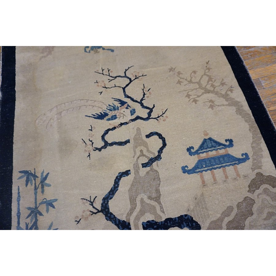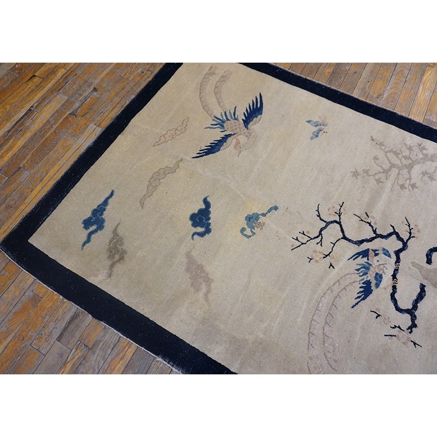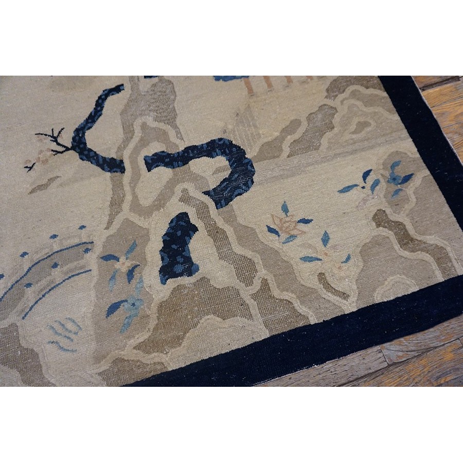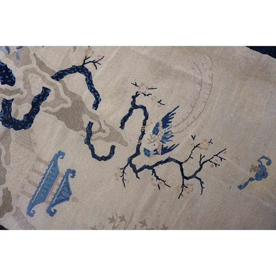 DescriptionChineseCarpets made in China proper. See entries Ningshia, Peking, Art Deco. Chinese - PekingThe commercial Peking carpet is a later 19th century development, begun by importing weaves from Ningshia (see entry) to create and export industry aimed at Western markets. The foundation is cotton and the pile is a good quality carpet wool which takes dyes particularly well. The neat medium weave is in Persian (asymmetric) knots. Designs are strictly Chinese and the whole motif repertoire of Chinese art is employed. Blue and white is the most popular color combination and red is particularly rare. Sizes tend to 9 x 12 and larger, and few small pieces appear. For a short time in the early 1920s Persian designs were woven to capitalize on the death of new Iranian goods. The industry decimated by the Communist Revolution relocated to the Pearl River area. There is a good supply of antique carpets at reasonable prices. | |