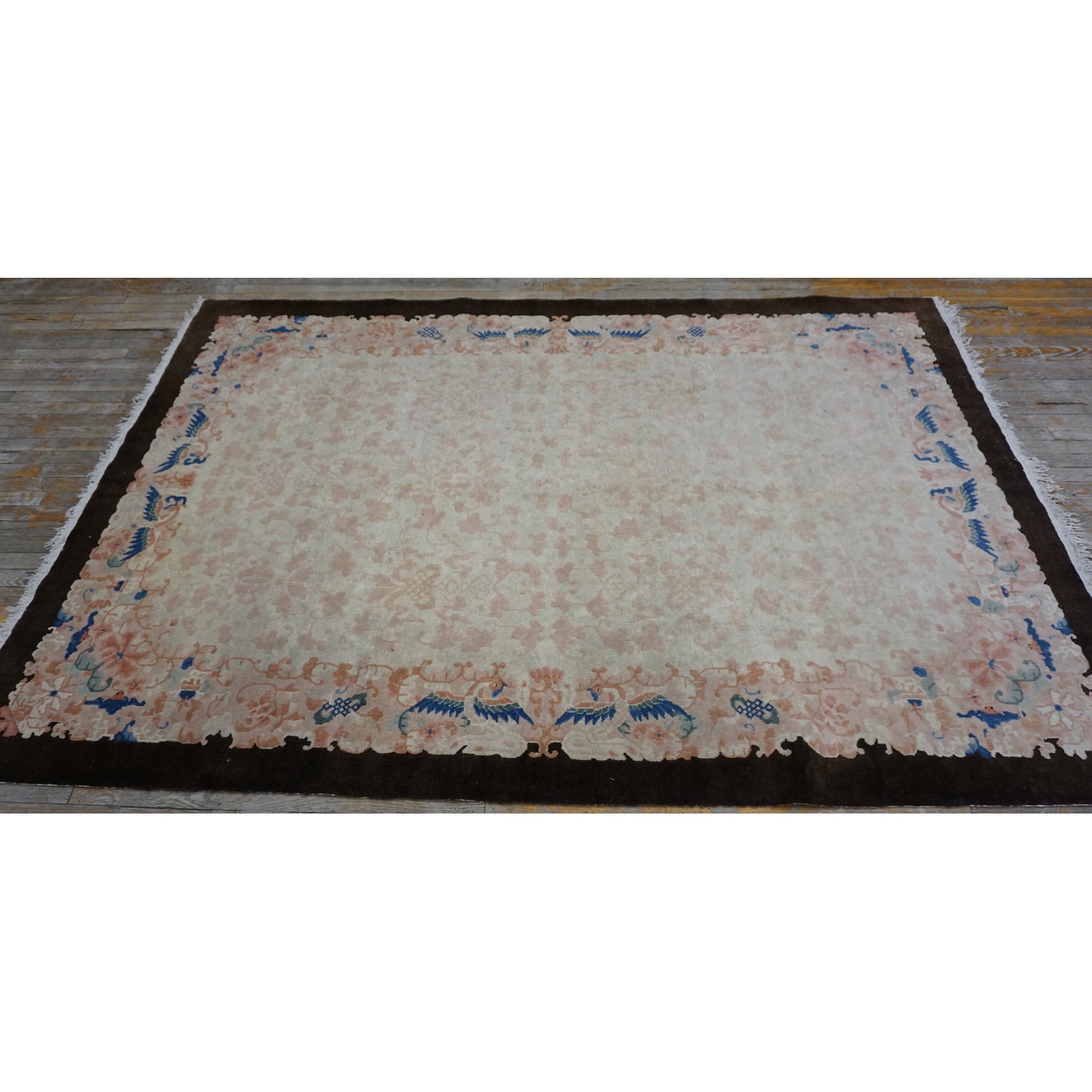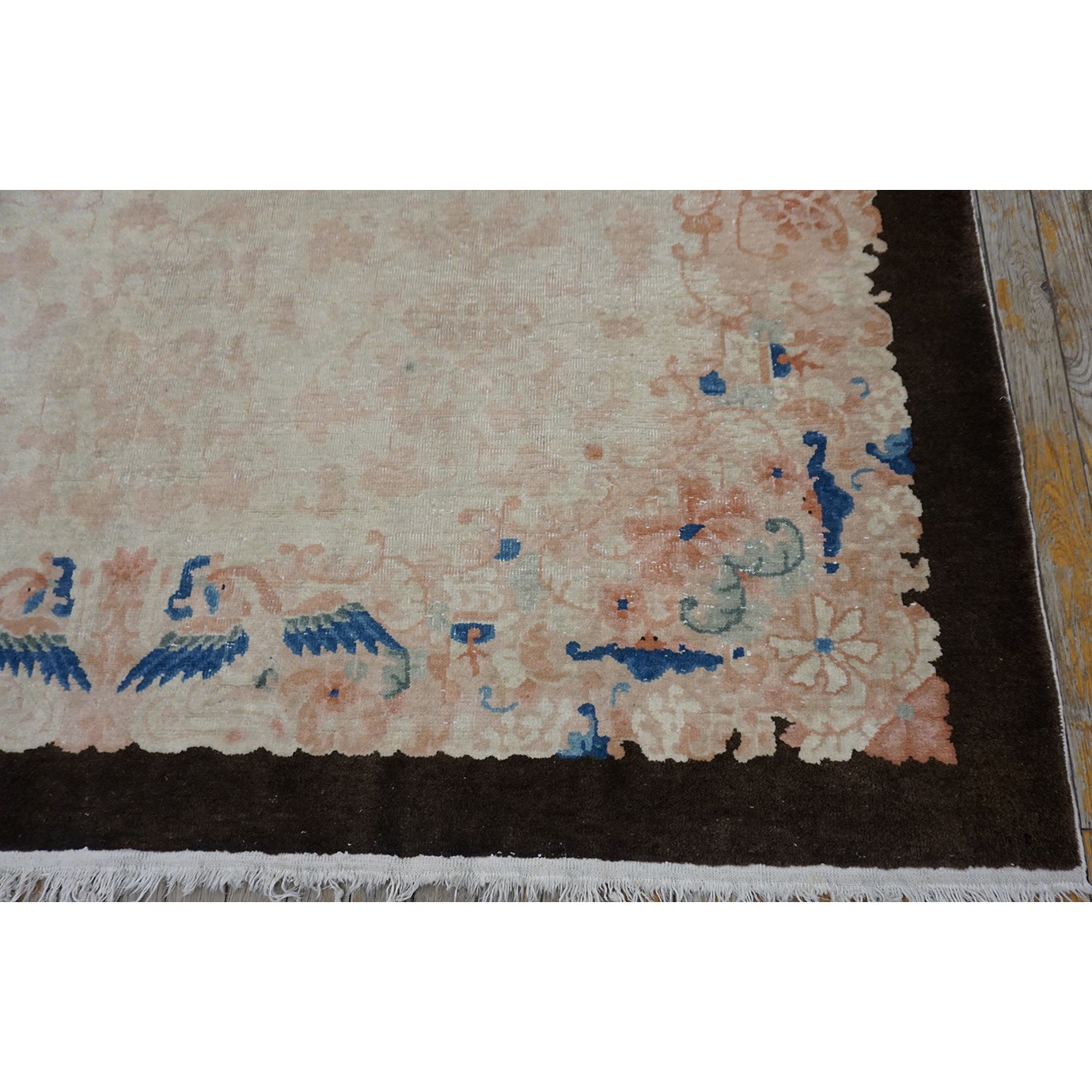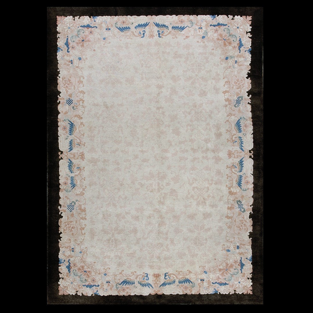 DescriptionChineseCarpets made in China proper. See entries Ningshia, Peking, Art Deco. Chinese - PekingThe commercial Peking carpet is a later 19th century development, begun by importing weaves from Ningshia (see entry) to create and export industry aimed at Western markets. The foundation is cotton and the pile is a good quality carpet wool which takes dyes particularly well. The neat medium weave is in Persian (asymmetric) knots. Designs are strictly Chinese and the whole motif repertoire of Chinese art is employed. Blue and white is the most popular color combination and red is particularly rare. Sizes tend to 9 x 12 and larger, and few small pieces appear. For a short time in the early 1920s Persian designs were woven to capitalize on the death of new Iranian goods. The industry decimated by the Communist Revolution relocated to the Pearl River area. There is a good supply of antique carpets at reasonable prices. | |