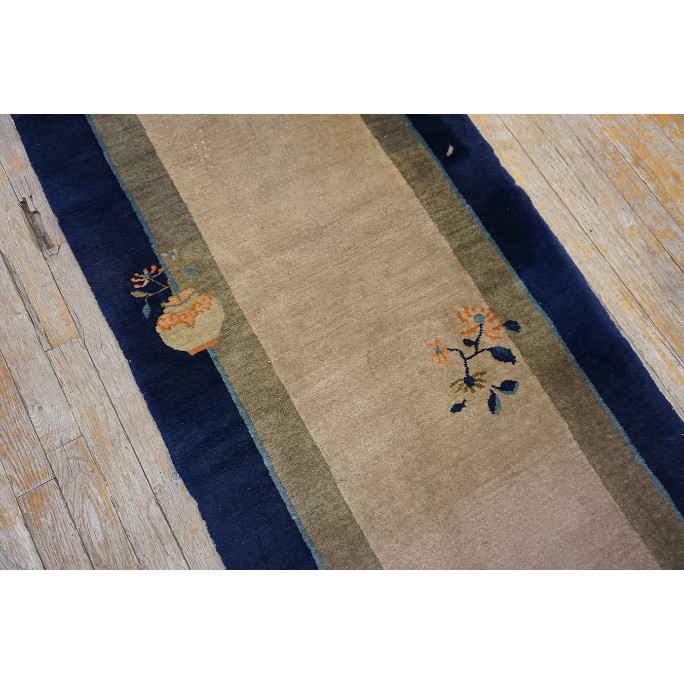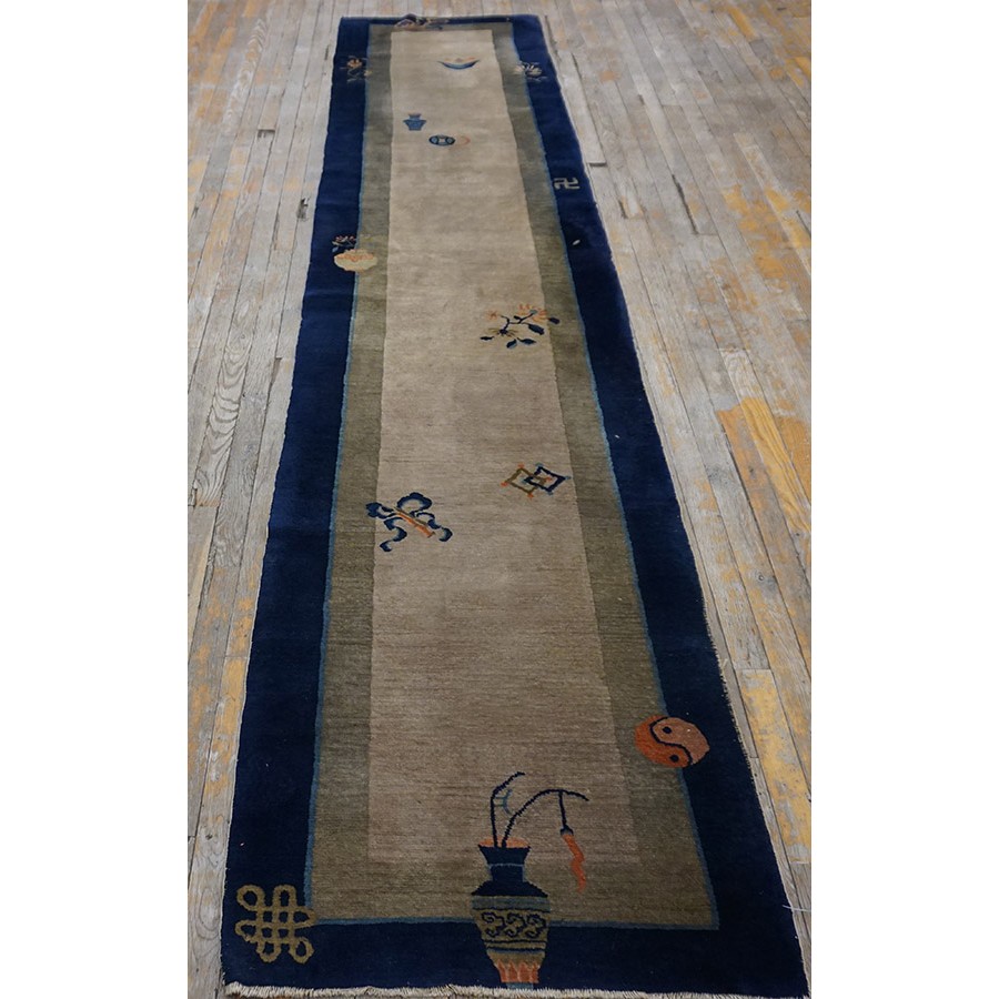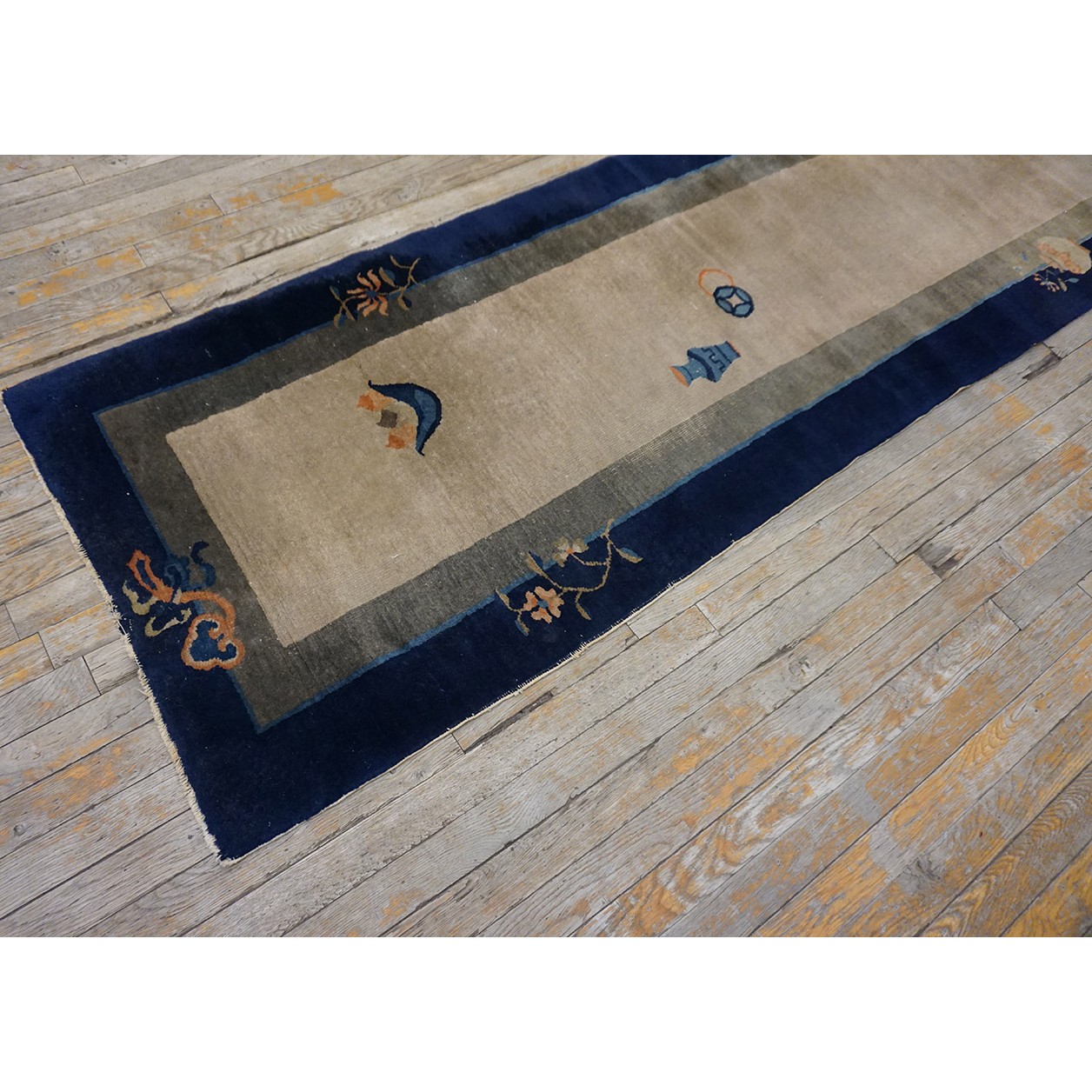 DescriptionChineseCarpets made in China proper. See entries Ningshia, Peking, Art Deco. Chinese - PekingThe commercial Peking carpet is a later 19th century development, begun by importing weaves from Ningshia (see entry) to create and export industry aimed at Western markets. The foundation is cotton and the pile is a good quality carpet wool which takes dyes particularly well. The neat medium weave is in Persian (asymmetric) knots. Designs are strictly Chinese and the whole motif repertoire of Chinese art is employed. Blue and white is the most popular color combination and red is particularly rare. Sizes tend to 9 x 12 and larger, and few small pieces appear. For a short time in the early 1920s Persian designs were woven to capitalize on the death of new Iranian goods. The industry decimated by the Communist Revolution relocated to the Pearl River area. There is a good supply of antique carpets at reasonable prices. | |