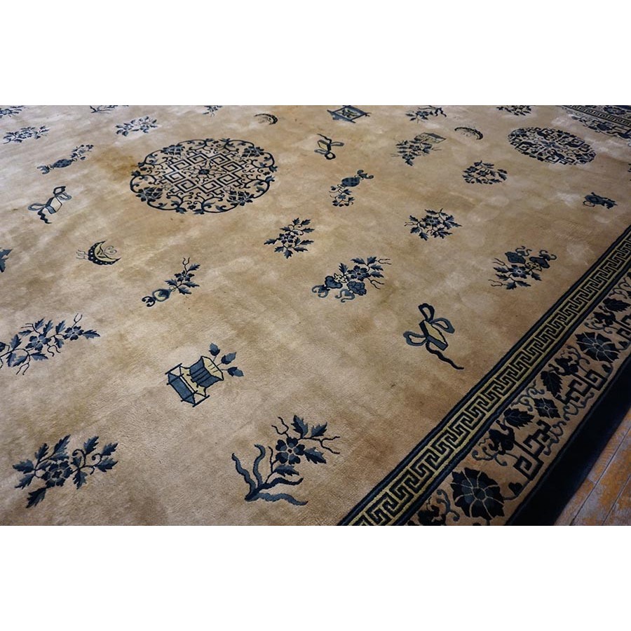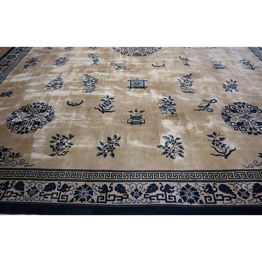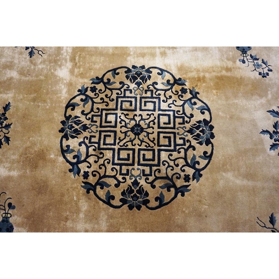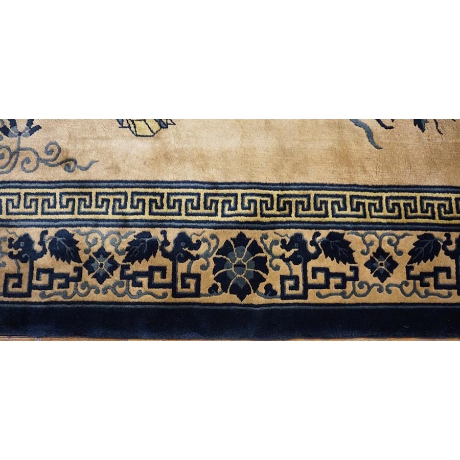 DescriptionChineseCarpets made in China proper. See entries Ningshia, Peking, Art Deco. Chinese - PekingThe commercial Peking carpet is a later 19th century development, begun by importing weaves from Ningshia (see entry) to create and export industry aimed at Western markets. The foundation is cotton and the pile is a good quality carpet wool which takes dyes particularly well. The neat medium weave is in Persian (asymmetric) knots. Designs are strictly Chinese and the whole motif repertoire of Chinese art is employed. Blue and white is the most popular color combination and red is particularly rare. Sizes tend to 9 x 12 and larger, and few small pieces appear. For a short time in the early 1920s Persian designs were woven to capitalize on the death of new Iranian goods. The industry decimated by the Communist Revolution relocated to the Pearl River area. There is a good supply of antique carpets at reasonable prices. | |
