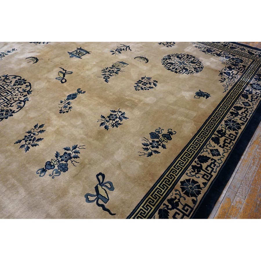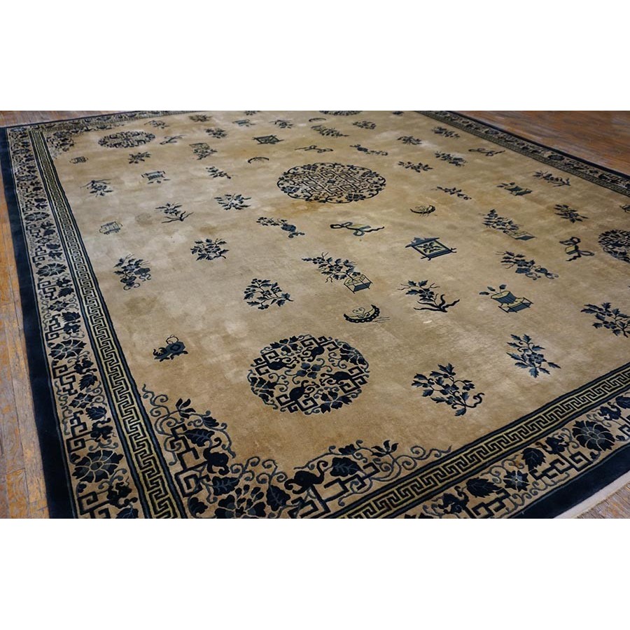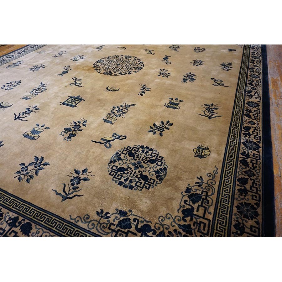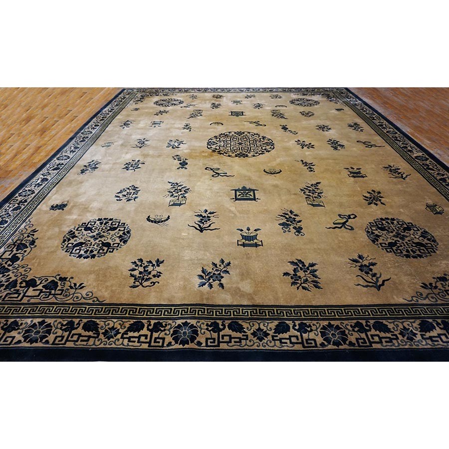 DescriptionChineseCarpets made in China proper. See entries Ningshia, Peking, Art Deco. Chinese - PekingThe commercial Peking carpet is a later 19th century development, begun by importing weaves from Ningshia (see entry) to create and export industry aimed at Western markets. The foundation is cotton and the pile is a good quality carpet wool which takes dyes particularly well. The neat medium weave is in Persian (asymmetric) knots. Designs are strictly Chinese and the whole motif repertoire of Chinese art is employed. Blue and white is the most popular color combination and red is particularly rare. Sizes tend to 9 x 12 and larger, and few small pieces appear. For a short time in the early 1920s Persian designs were woven to capitalize on the death of new Iranian goods. The industry decimated by the Communist Revolution relocated to the Pearl River area. There is a good supply of antique carpets at reasonable prices. | |