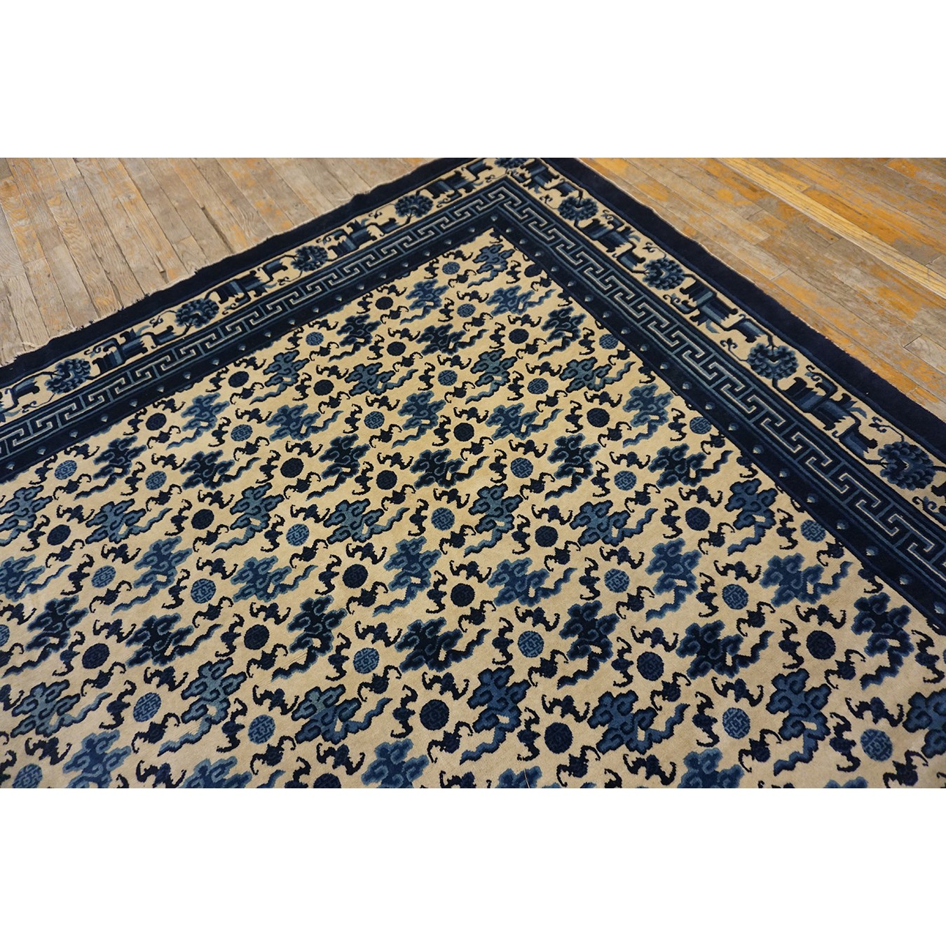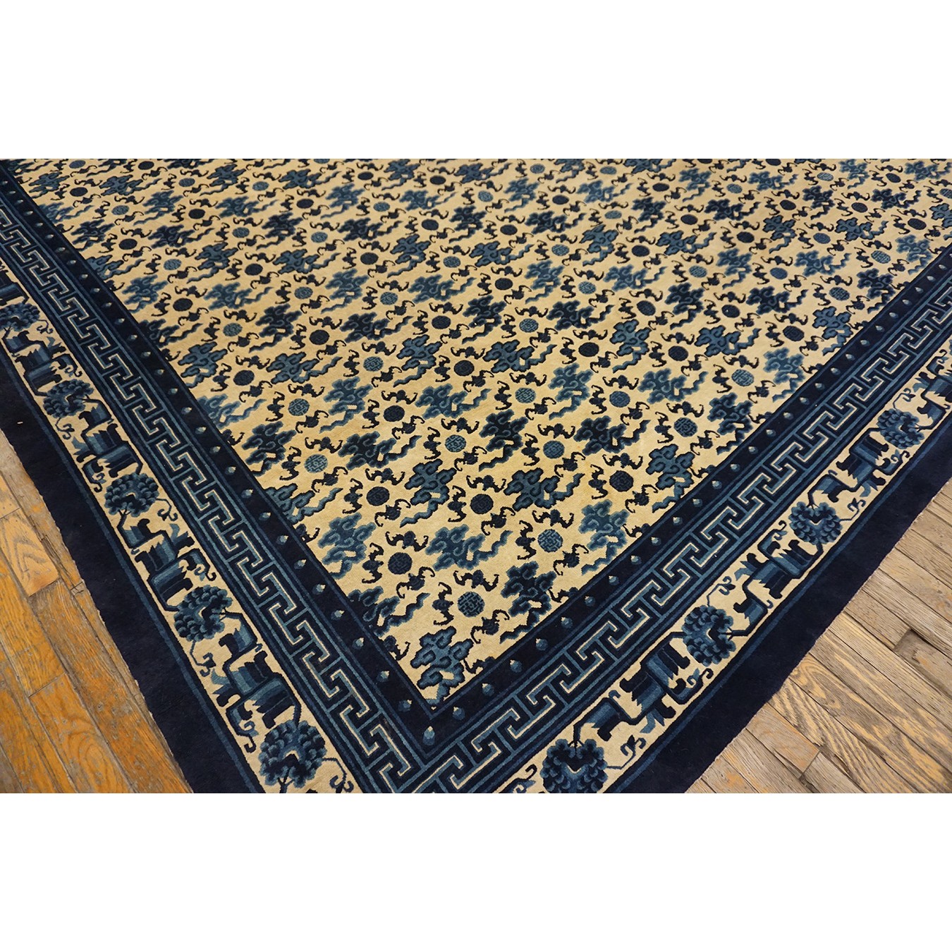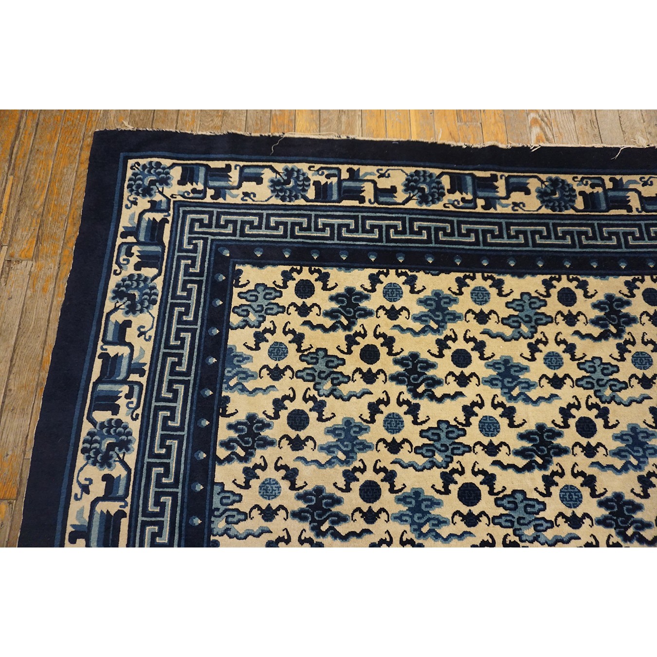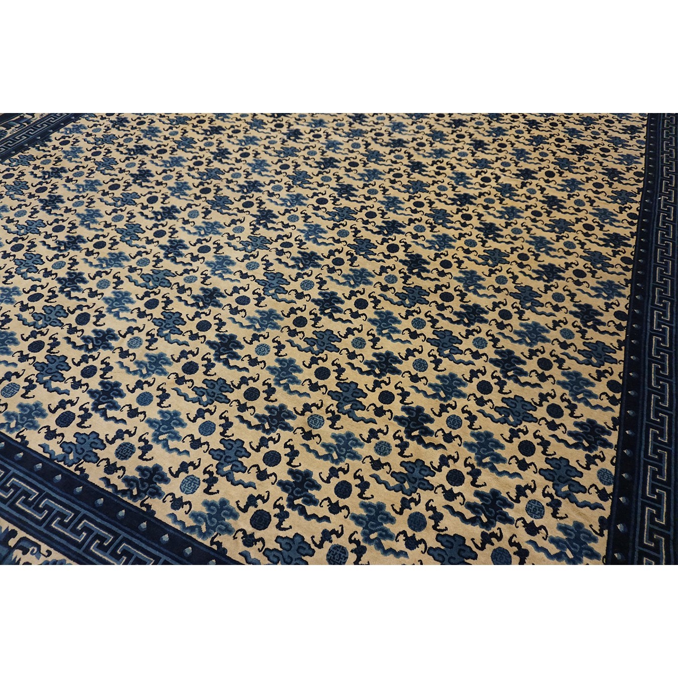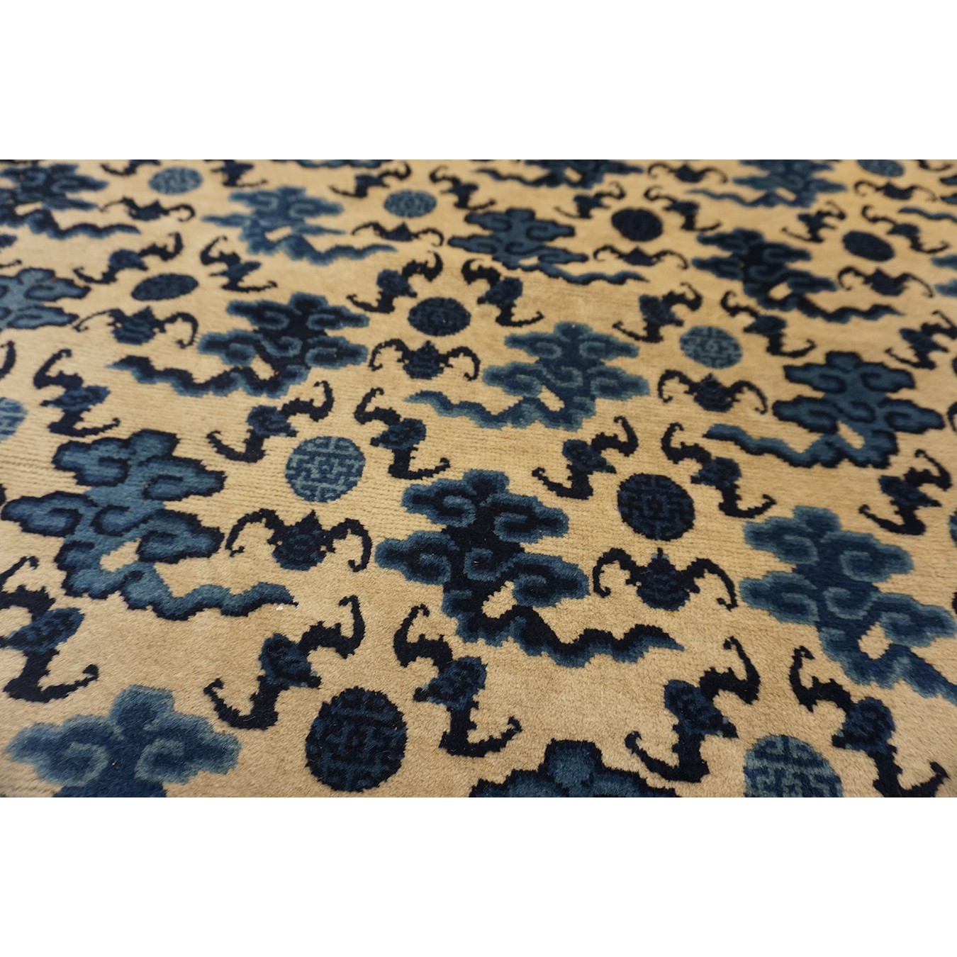 DescriptionChineseCarpets made in China proper. See entries Ningshia, Peking, Art Deco. Chinese - PekingThe commercial Peking carpet is a later 19th century development, begun by importing weaves from Ningshia (see entry) to create and export industry aimed at Western markets. The foundation is cotton and the pile is a good quality carpet wool which takes dyes particularly well. The neat medium weave is in Persian (asymmetric) knots. Designs are strictly Chinese and the whole motif repertoire of Chinese art is employed. Blue and white is the most popular color combination and red is particularly rare. Sizes tend to 9 x 12 and larger, and few small pieces appear. For a short time in the early 1920s Persian designs were woven to capitalize on the death of new Iranian goods. The industry decimated by the Communist Revolution relocated to the Pearl River area. There is a good supply of antique carpets at reasonable prices. | |