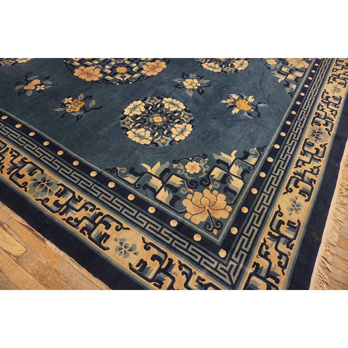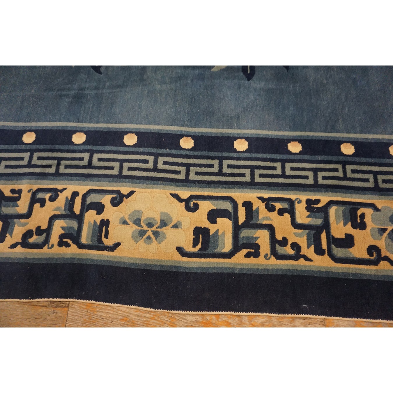 DescriptionChineseCarpets made in China proper. See entries Ningshia, Peking, Art Deco. Chinese - PekingThe commercial Peking carpet is a later 19th century development, begun by importing weaves from Ningshia (see entry) to create and export industry aimed at Western markets. The foundation is cotton and the pile is a good quality carpet wool which takes dyes particularly well. The neat medium weave is in Persian (asymmetric) knots. Designs are strictly Chinese and the whole motif repertoire of Chinese art is employed. Blue and white is the most popular color combination and red is particularly rare. Sizes tend to 9 x 12 and larger, and few small pieces appear. For a short time in the early 1920s Persian designs were woven to capitalize on the death of new Iranian goods. The industry decimated by the Communist Revolution relocated to the Pearl River area. There is a good supply of antique carpets at reasonable prices. | |