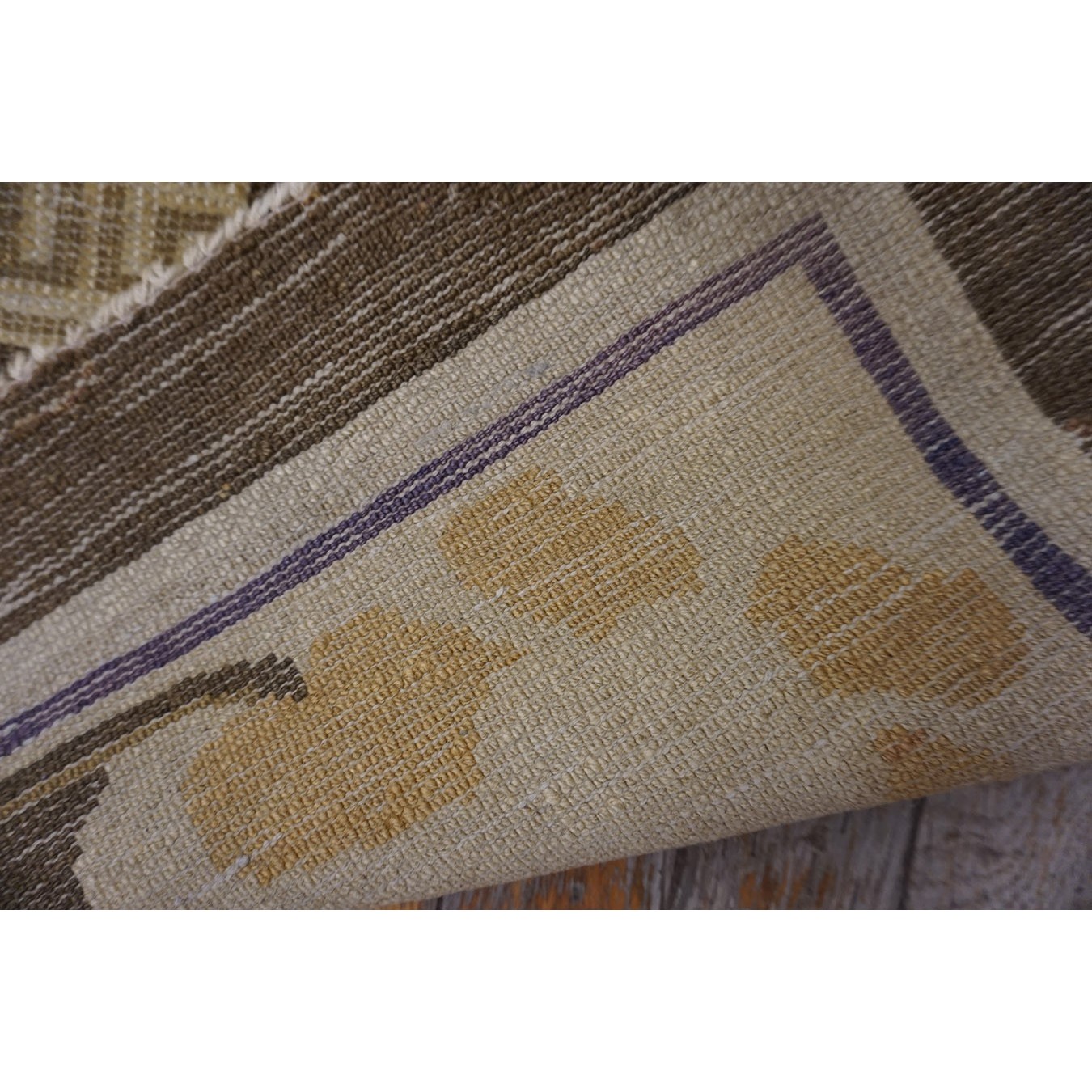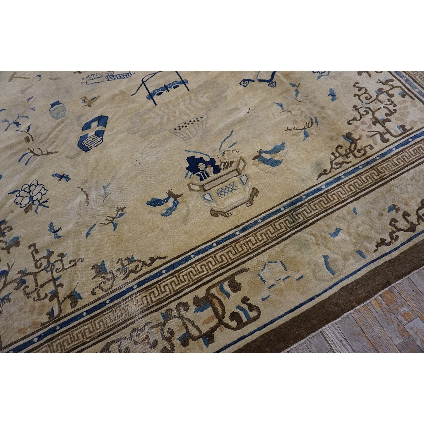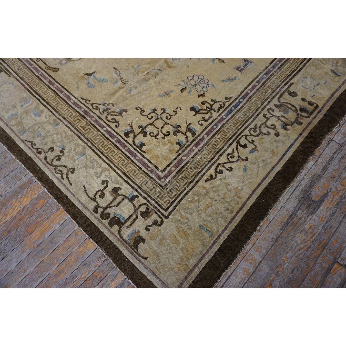 DescriptionChineseCarpets made in China proper. See entries Ningshia, Peking, Art Deco. Chinese - PekingThe commercial Peking carpet is a later 19th century development, begun by importing weaves from Ningshia (see entry) to create and export industry aimed at Western markets. The foundation is cotton and the pile is a good quality carpet wool which takes dyes particularly well. The neat medium weave is in Persian (asymmetric) knots. Designs are strictly Chinese and the whole motif repertoire of Chinese art is employed. Blue and white is the most popular color combination and red is particularly rare. Sizes tend to 9 x 12 and larger, and few small pieces appear. For a short time in the early 1920s Persian designs were woven to capitalize on the death of new Iranian goods. The industry decimated by the Communist Revolution relocated to the Pearl River area. There is a good supply of antique carpets at reasonable prices. | |