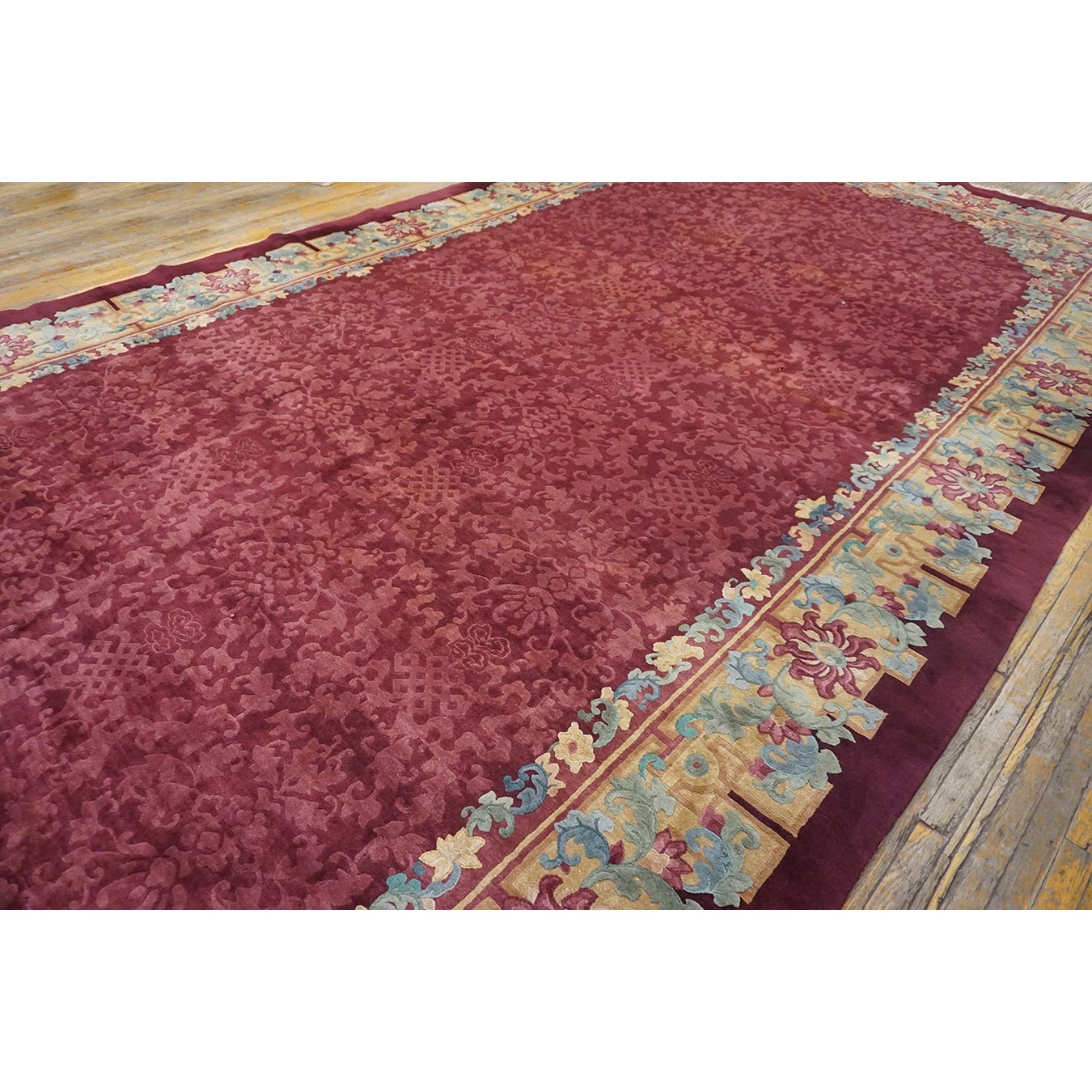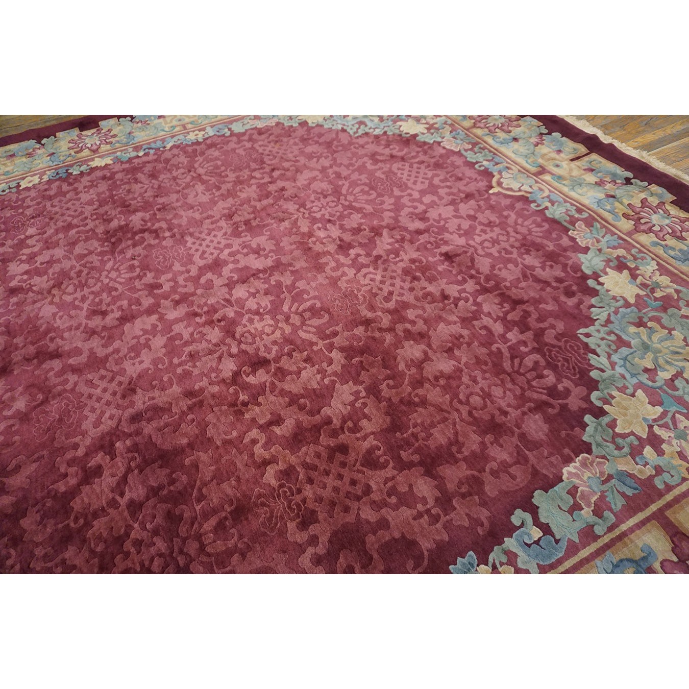 DescriptionChineseCarpets made in China proper. See entries Ningshia, Peking, Art Deco. Chinese - PekingThe commercial Peking carpet is a later 19th century development, begun by importing weaves from Ningshia (see entry) to create and export industry aimed at Western markets. The foundation is cotton and the pile is a good quality carpet wool which takes dyes particularly well. The neat medium weave is in Persian (asymmetric) knots. Designs are strictly Chinese and the whole motif repertoire of Chinese art is employed. Blue and white is the most popular color combination and red is particularly rare. Sizes tend to 9 x 12 and larger, and few small pieces appear. For a short time in the early 1920s Persian designs were woven to capitalize on the death of new Iranian goods. The industry decimated by the Communist Revolution relocated to the Pearl River area. There is a good supply of antique carpets at reasonable prices. | |