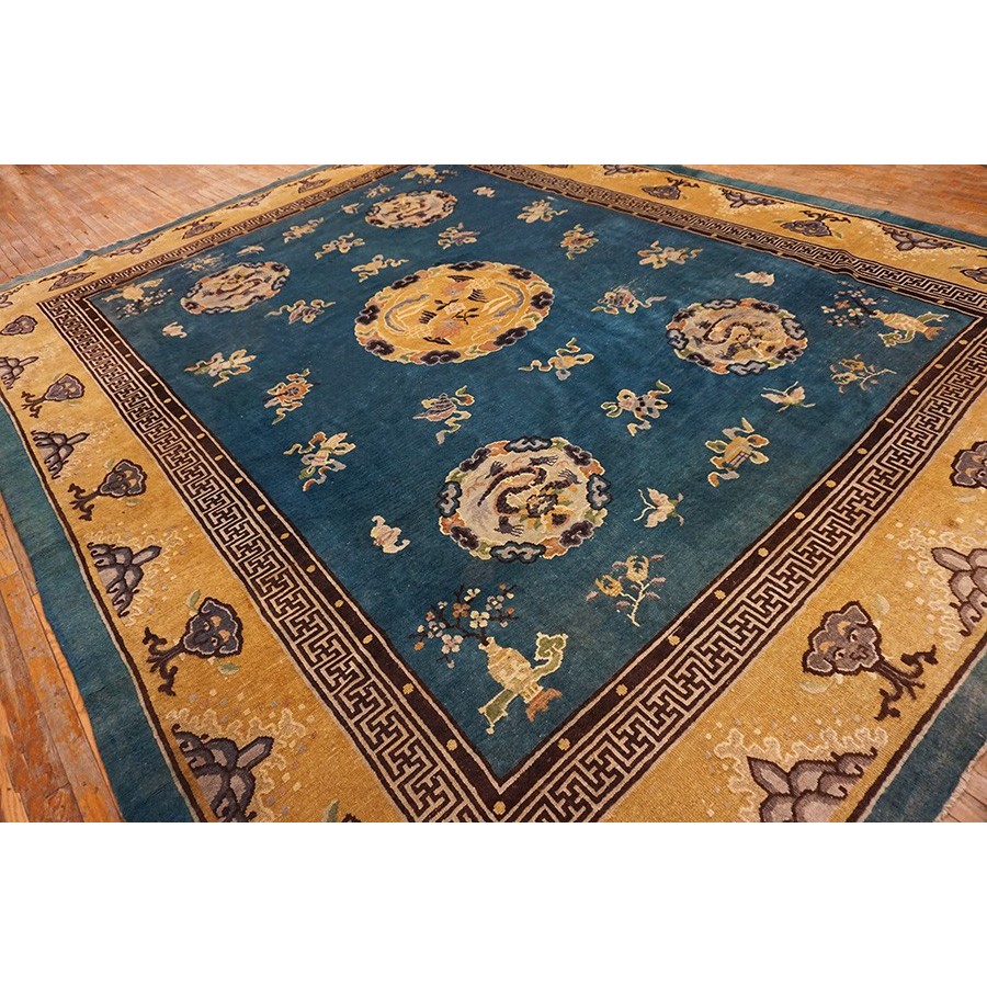 DescriptionChineseCarpets made in China proper. See entries Ningshia, Peking, Art Deco. Chinese - PekingThe commercial Peking carpet is a later 19th century development, begun by importing weaves from Ningshia (see entry) to create and export industry aimed at Western markets. The foundation is cotton and the pile is a good quality carpet wool which takes dyes particularly well. The neat medium weave is in Persian (asymmetric) knots. Designs are strictly Chinese and the whole motif repertoire of Chinese art is employed. Blue and white is the most popular color combination and red is particularly rare. Sizes tend to 9 x 12 and larger, and few small pieces appear. For a short time in the early 1920s Persian designs were woven to capitalize on the death of new Iranian goods. The industry decimated by the Communist Revolution relocated to the Pearl River area. There is a good supply of antique carpets at reasonable prices. | |