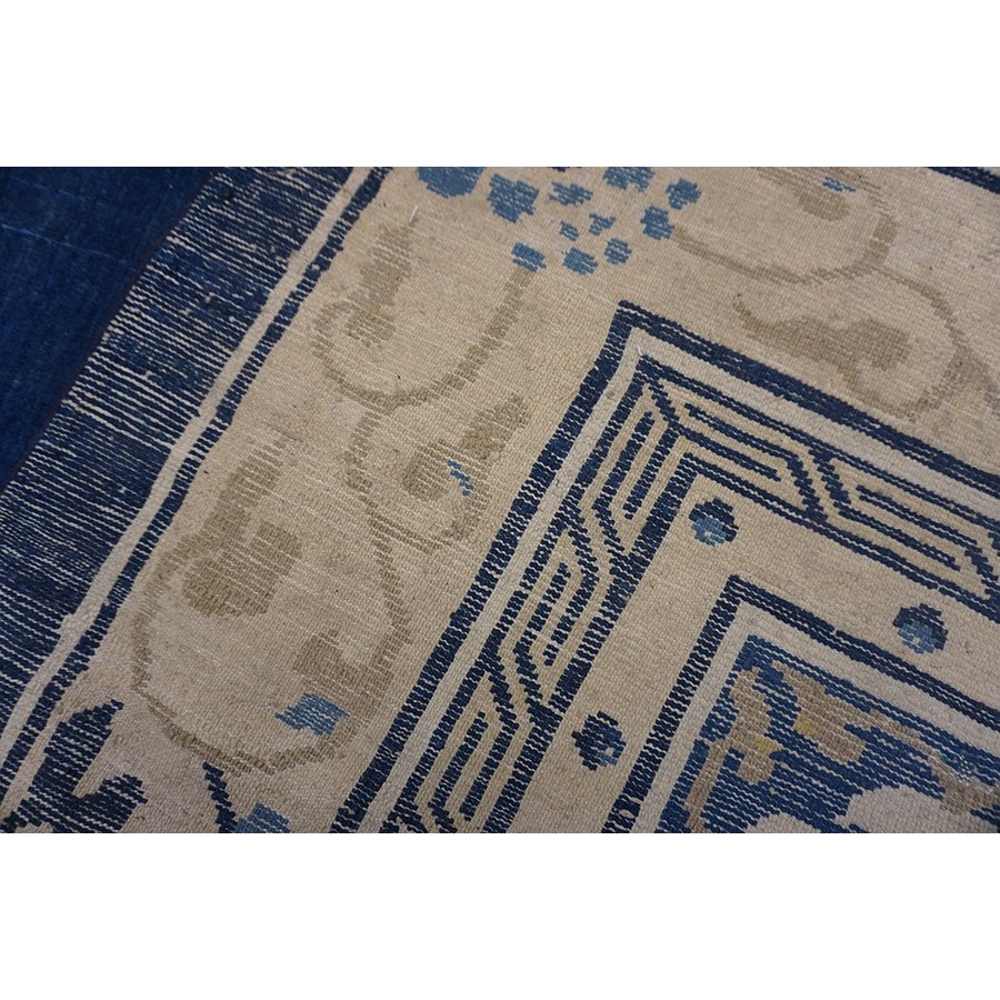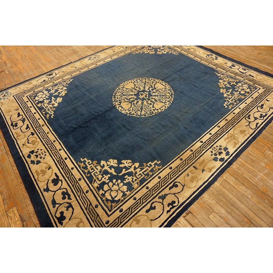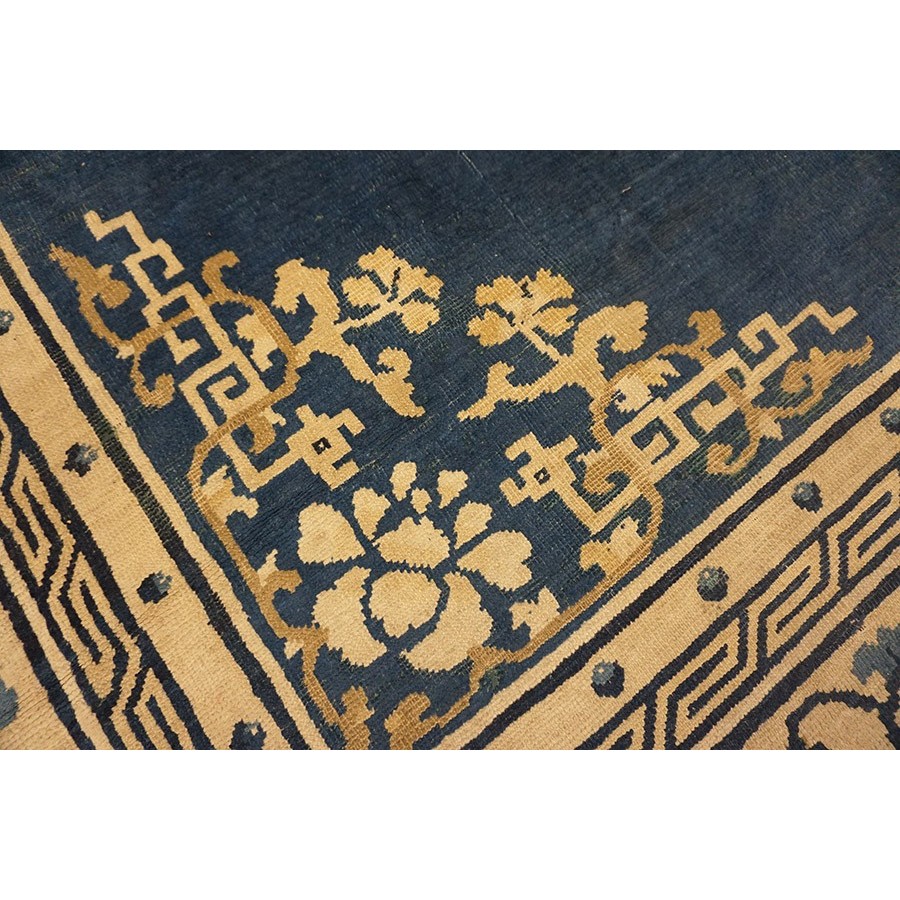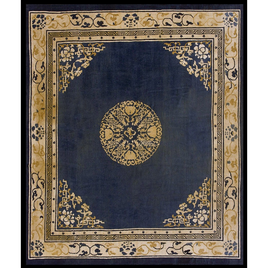 DescriptionChineseCarpets made in China proper. See entries Ningshia, Peking, Art Deco. Chinese - PekingThe commercial Peking carpet is a later 19th century development, begun by importing weaves from Ningshia (see entry) to create and export industry aimed at Western markets. The foundation is cotton and the pile is a good quality carpet wool which takes dyes particularly well. The neat medium weave is in Persian (asymmetric) knots. Designs are strictly Chinese and the whole motif repertoire of Chinese art is employed. Blue and white is the most popular color combination and red is particularly rare. Sizes tend to 9 x 12 and larger, and few small pieces appear. For a short time in the early 1920s Persian designs were woven to capitalize on the death of new Iranian goods. The industry decimated by the Communist Revolution relocated to the Pearl River area. There is a good supply of antique carpets at reasonable prices. | |