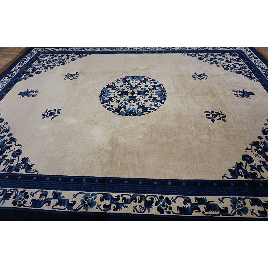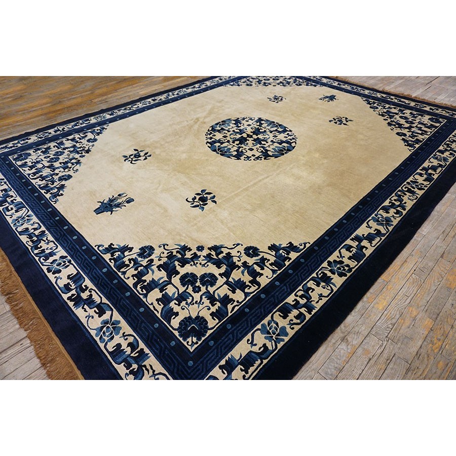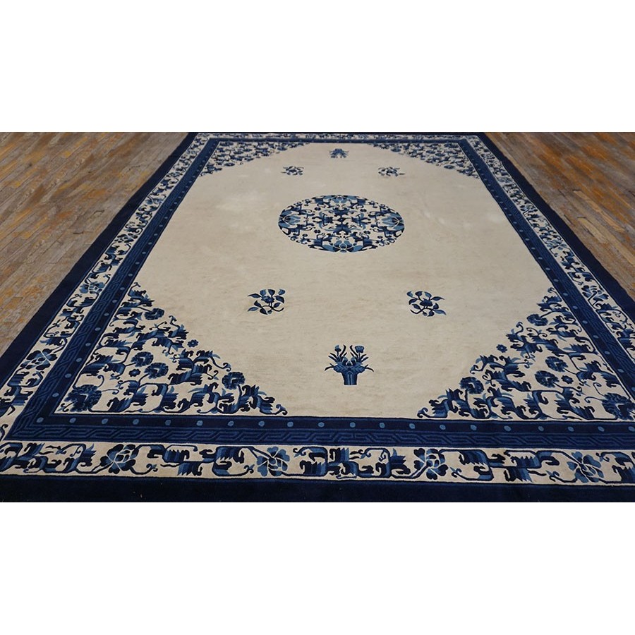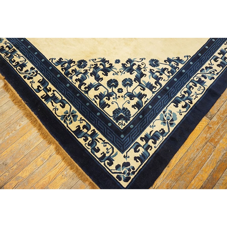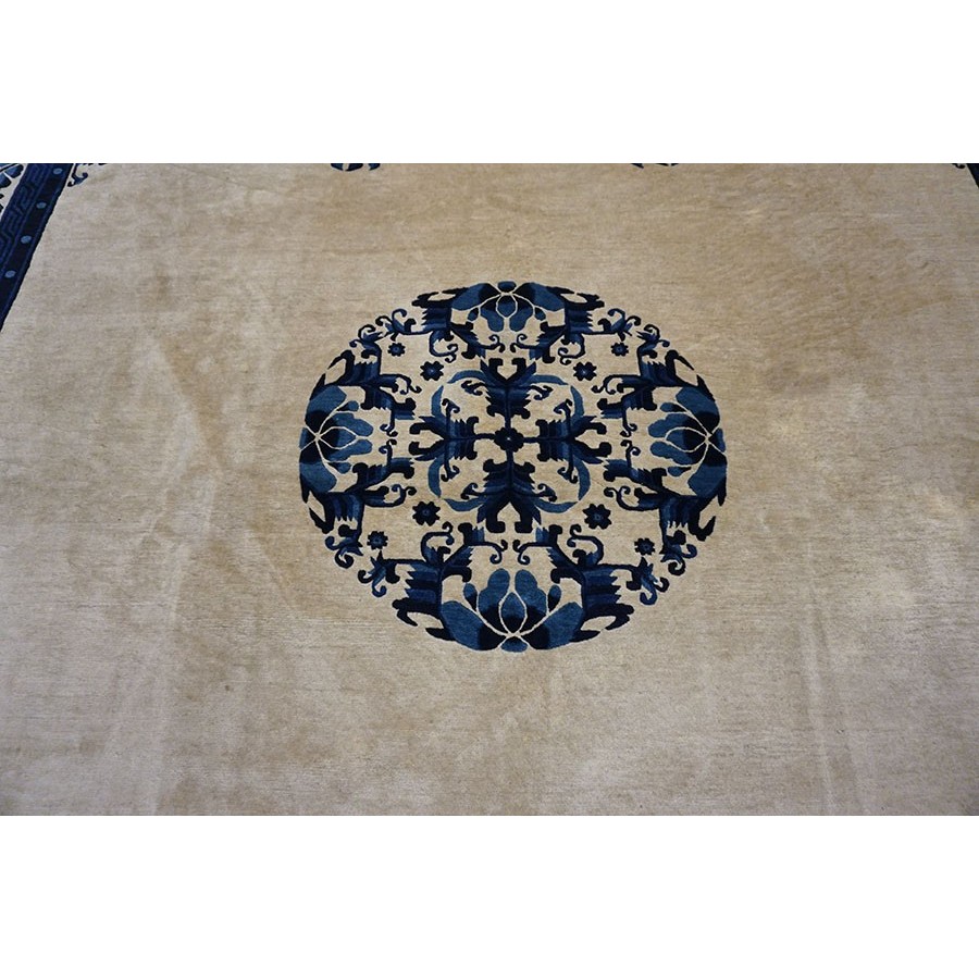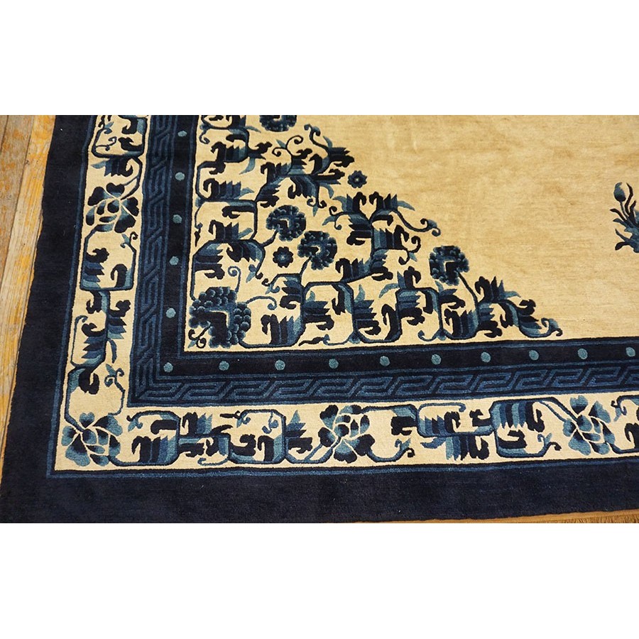DescriptionChineseCarpets made in China proper. See entries Ningshia, Peking, Art Deco. Chinese - PekingThe commercial Peking carpet is a later 19th century development, begun by importing weaves from Ningshia (see entry) to create and export industry aimed at Western markets. The foundation is cotton and the pile is a good quality carpet wool which takes dyes particularly well. The neat medium weave is in Persian (asymmetric) knots. Designs are strictly Chinese and the whole motif repertoire of Chinese art is employed. Blue and white is the most popular color combination and red is particularly rare. Sizes tend to 9 x 12 and larger, and few small pieces appear. For a short time in the early 1920s Persian designs were woven to capitalize on the death of new Iranian goods. The industry decimated by the Communist Revolution relocated to the Pearl River area. There is a good supply of antique carpets at reasonable prices. | |