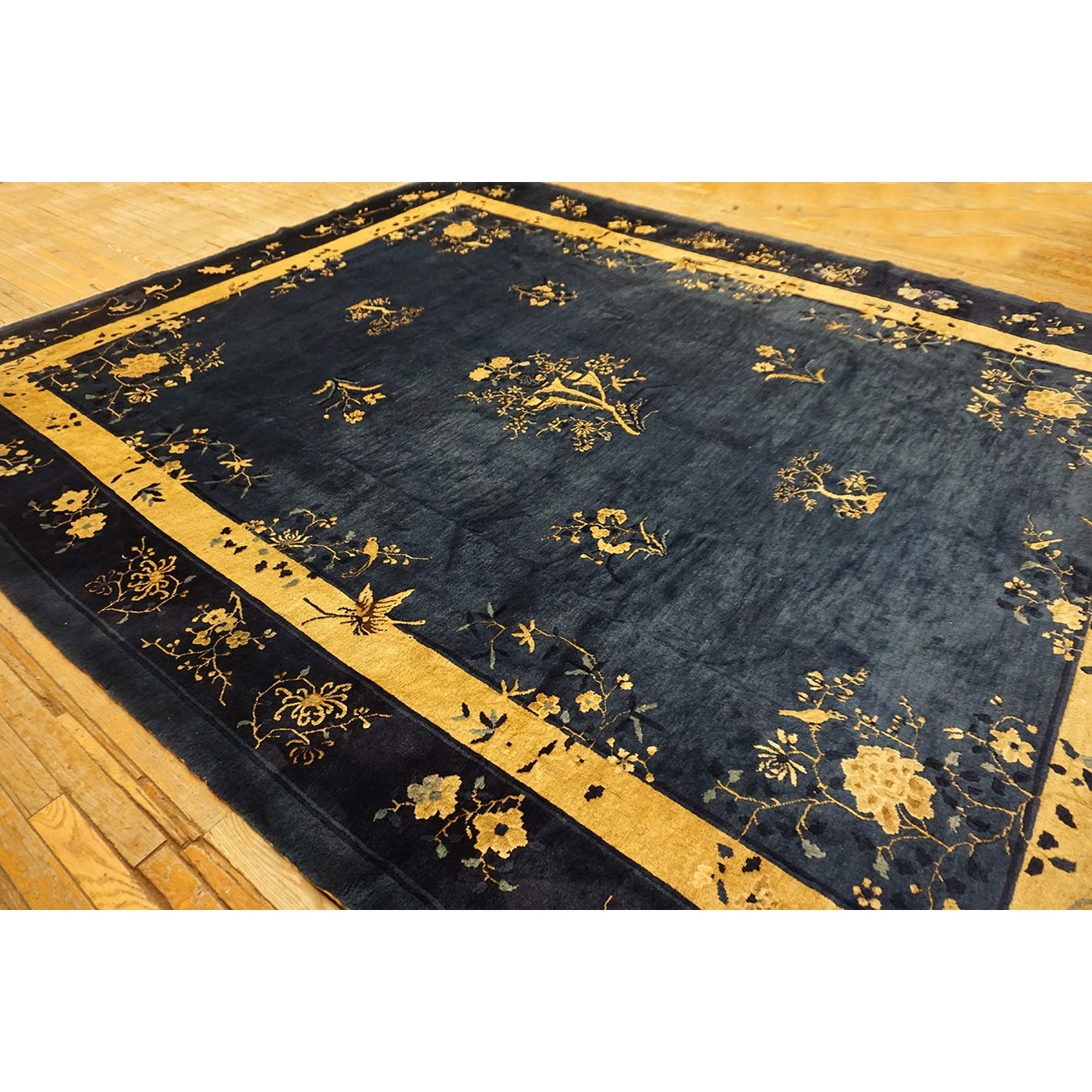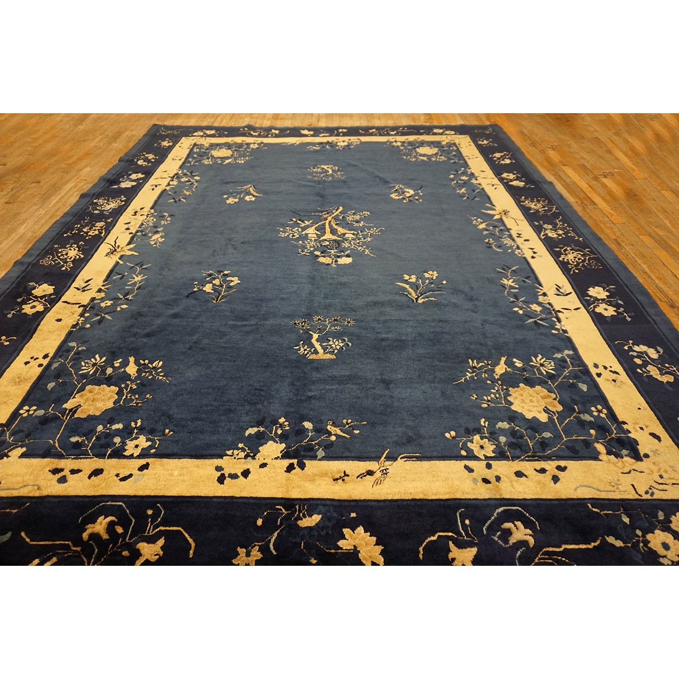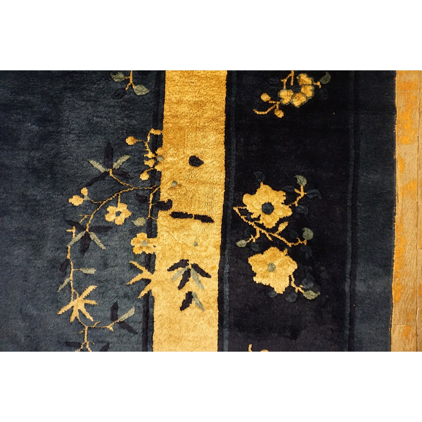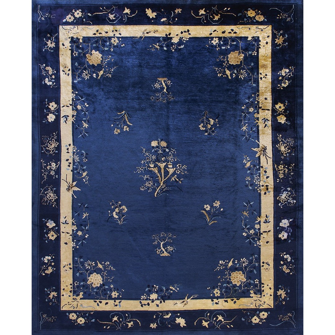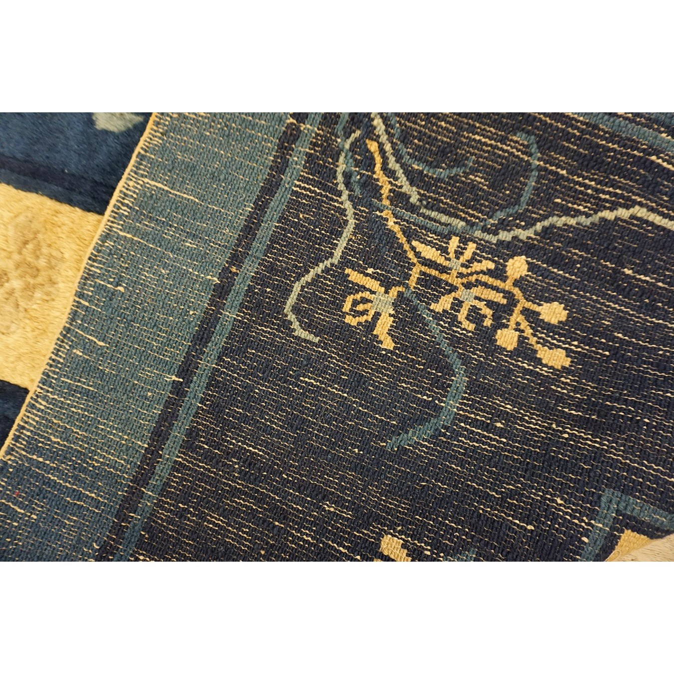 DescriptionChineseCarpets made in China proper. See entries Ningshia, Peking, Art Deco. Chinese - PekingThe commercial Peking carpet is a later 19th century development, begun by importing weaves from Ningshia (see entry) to create and export industry aimed at Western markets. The foundation is cotton and the pile is a good quality carpet wool which takes dyes particularly well. The neat medium weave is in Persian (asymmetric) knots. Designs are strictly Chinese and the whole motif repertoire of Chinese art is employed. Blue and white is the most popular color combination and red is particularly rare. Sizes tend to 9 x 12 and larger, and few small pieces appear. For a short time in the early 1920s Persian designs were woven to capitalize on the death of new Iranian goods. The industry decimated by the Communist Revolution relocated to the Pearl River area. There is a good supply of antique carpets at reasonable prices. | |