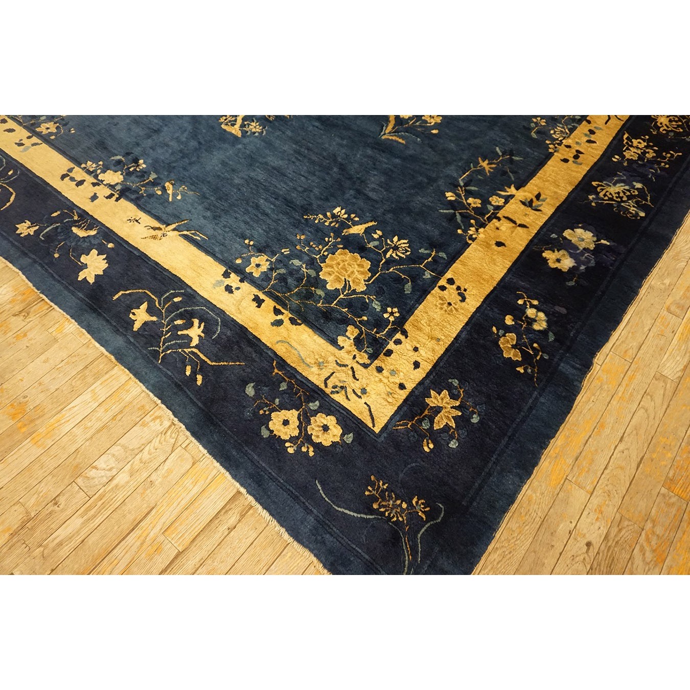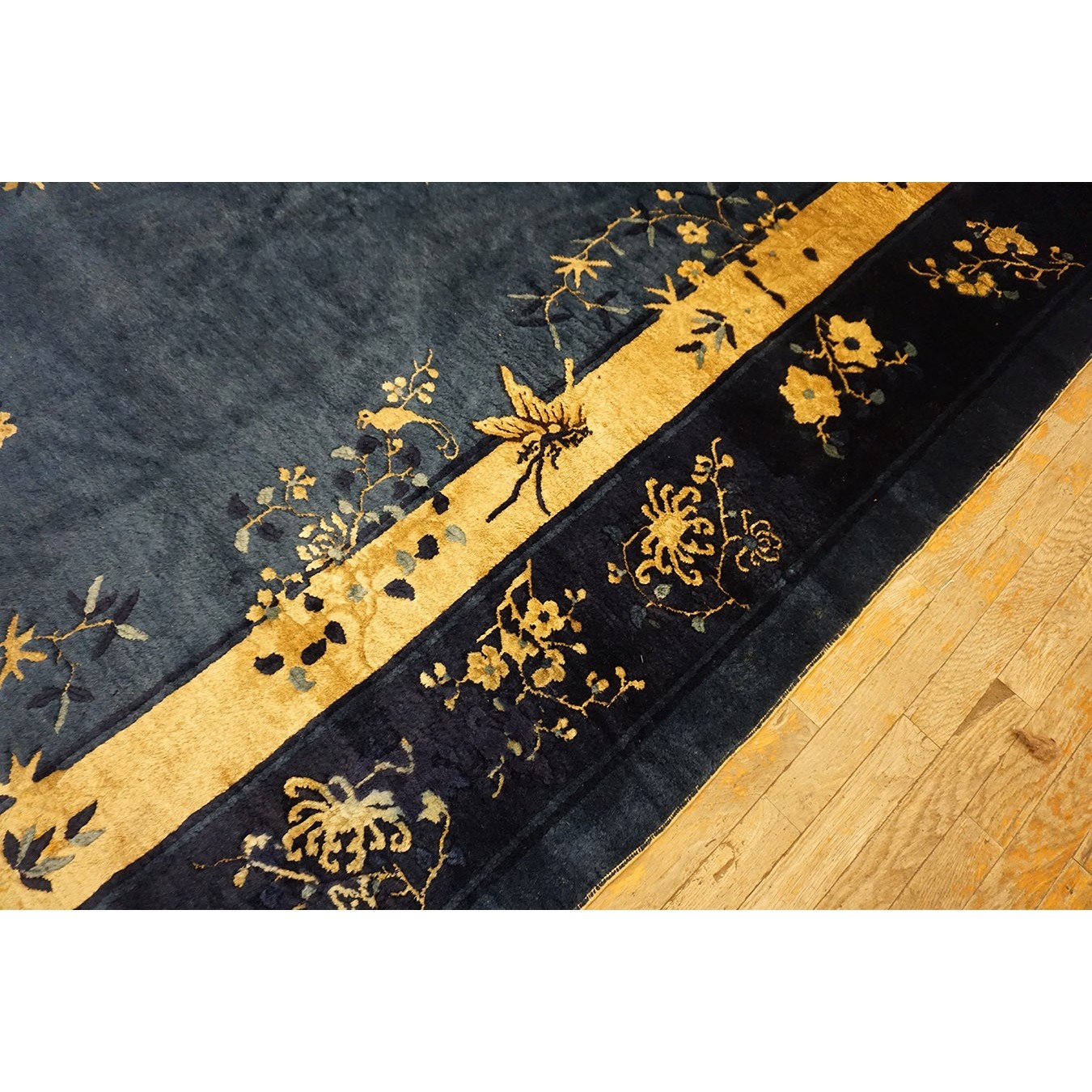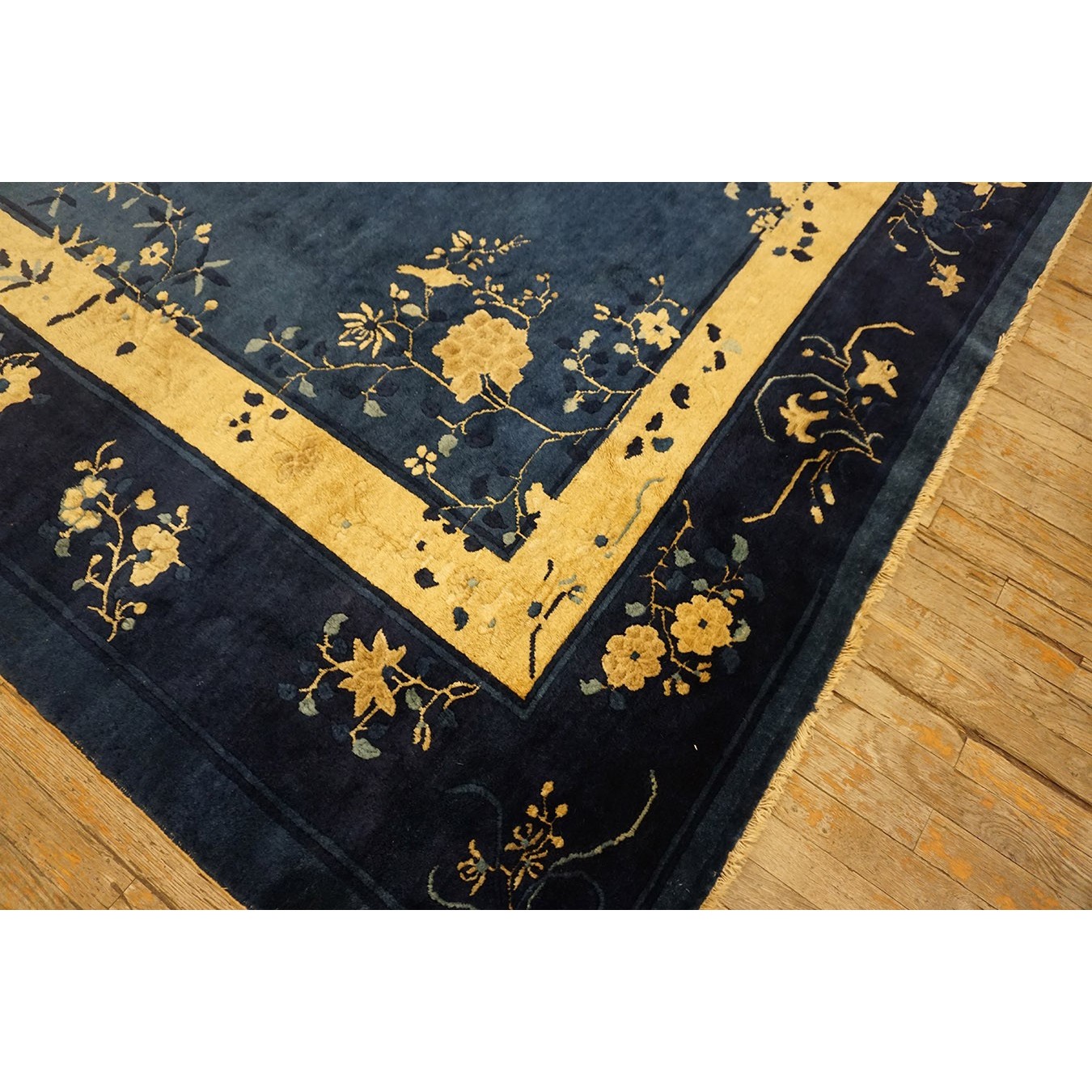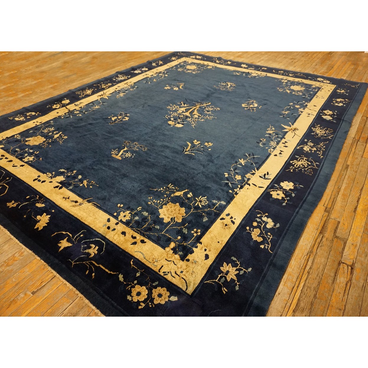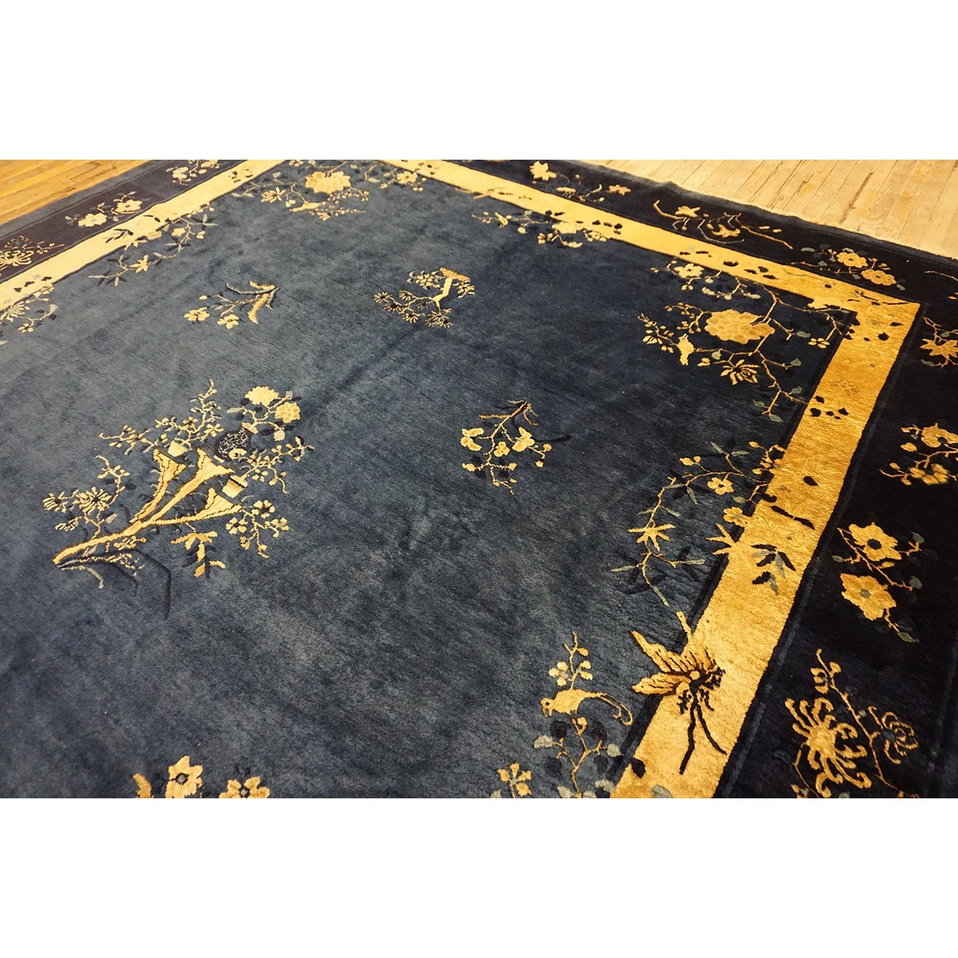 DescriptionChineseCarpets made in China proper. See entries Ningshia, Peking, Art Deco. Chinese - PekingThe commercial Peking carpet is a later 19th century development, begun by importing weaves from Ningshia (see entry) to create and export industry aimed at Western markets. The foundation is cotton and the pile is a good quality carpet wool which takes dyes particularly well. The neat medium weave is in Persian (asymmetric) knots. Designs are strictly Chinese and the whole motif repertoire of Chinese art is employed. Blue and white is the most popular color combination and red is particularly rare. Sizes tend to 9 x 12 and larger, and few small pieces appear. For a short time in the early 1920s Persian designs were woven to capitalize on the death of new Iranian goods. The industry decimated by the Communist Revolution relocated to the Pearl River area. There is a good supply of antique carpets at reasonable prices. | |