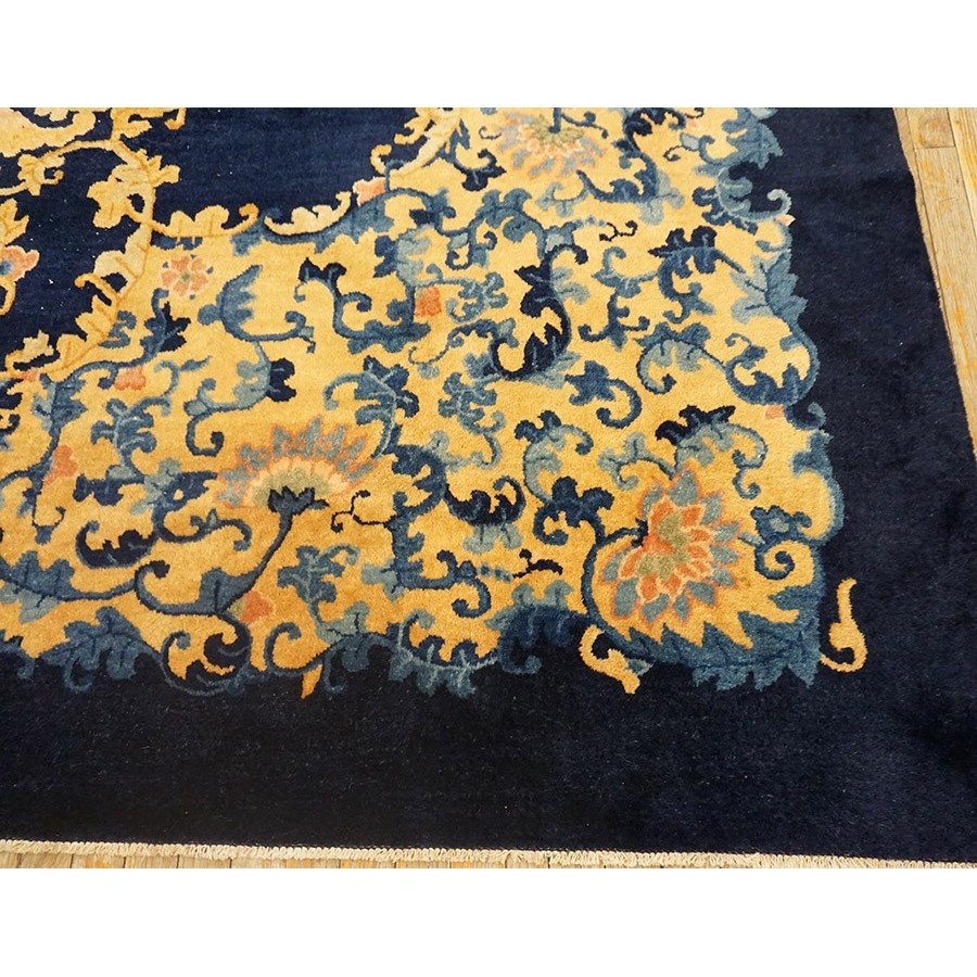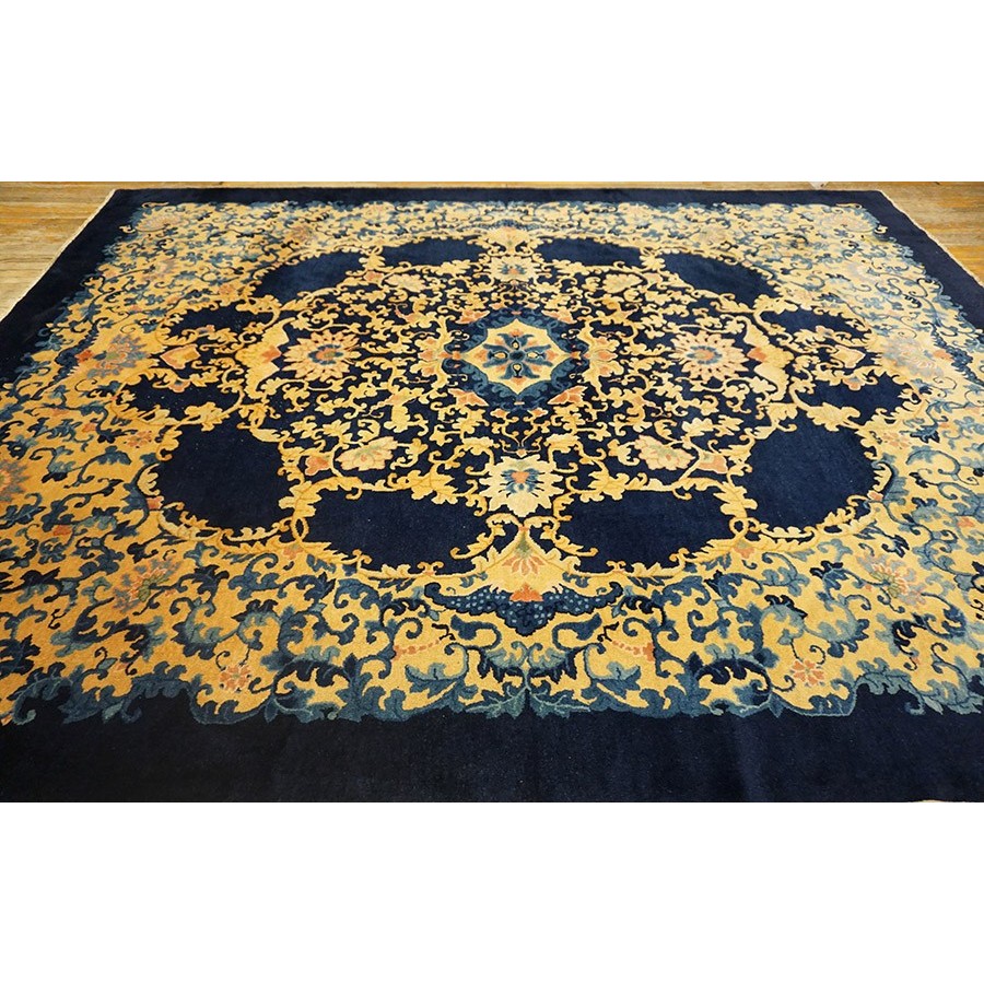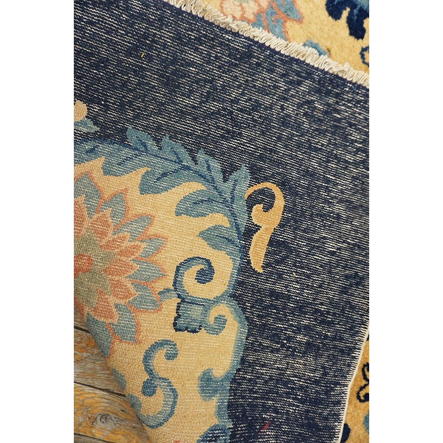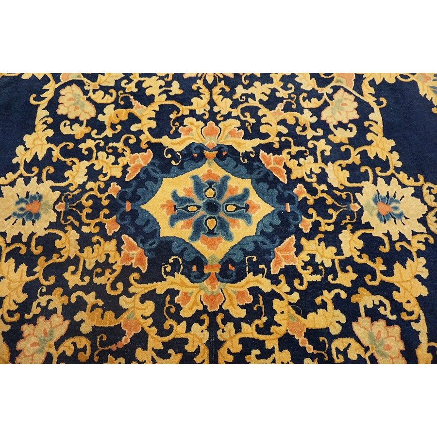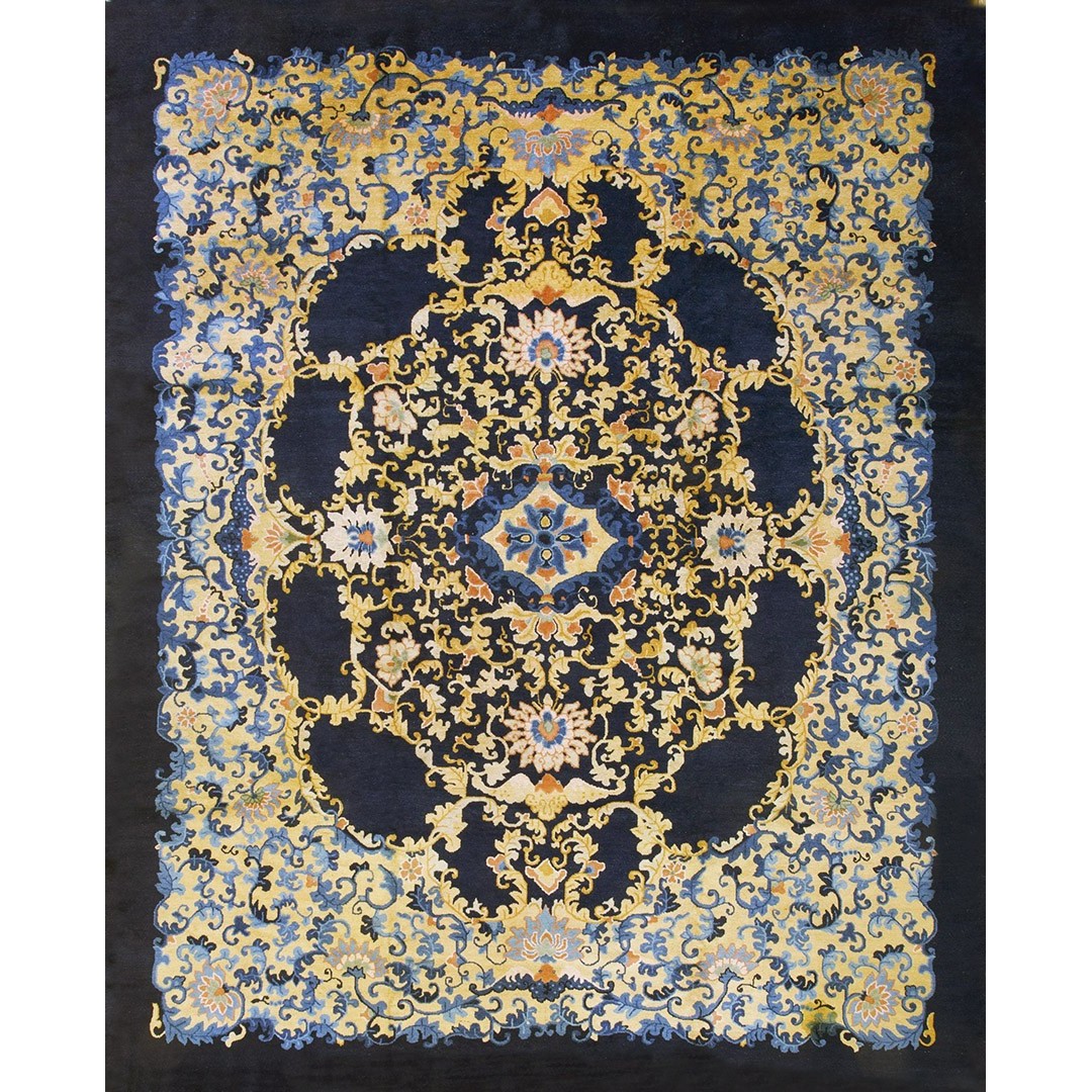 DescriptionChineseCarpets made in China proper. See entries Ningshia, Peking, Art Deco. Chinese - PekingThe commercial Peking carpet is a later 19th century development, begun by importing weaves from Ningshia (see entry) to create and export industry aimed at Western markets. The foundation is cotton and the pile is a good quality carpet wool which takes dyes particularly well. The neat medium weave is in Persian (asymmetric) knots. Designs are strictly Chinese and the whole motif repertoire of Chinese art is employed. Blue and white is the most popular color combination and red is particularly rare. Sizes tend to 9 x 12 and larger, and few small pieces appear. For a short time in the early 1920s Persian designs were woven to capitalize on the death of new Iranian goods. The industry decimated by the Communist Revolution relocated to the Pearl River area. There is a good supply of antique carpets at reasonable prices. | |