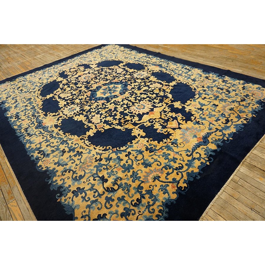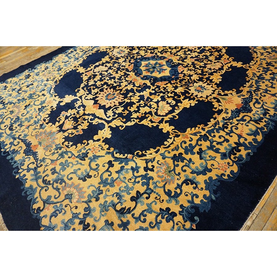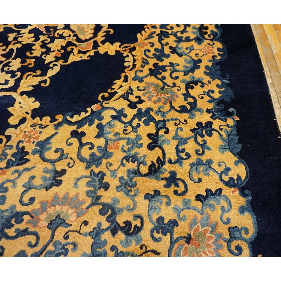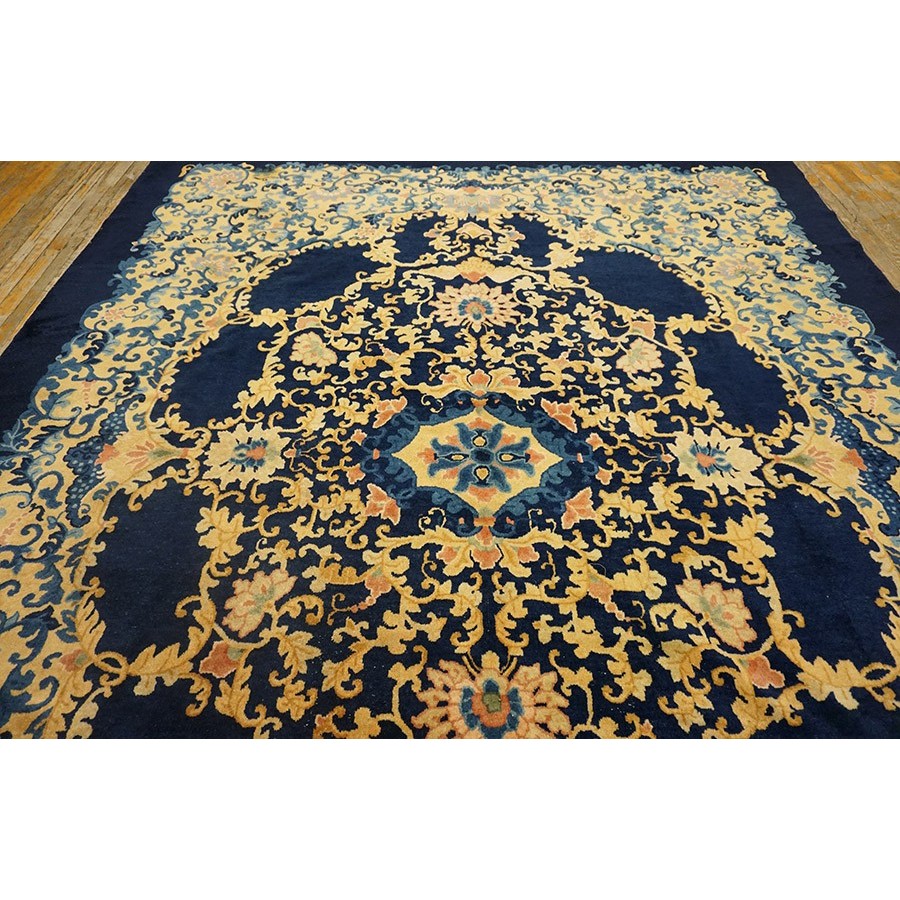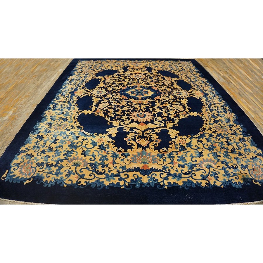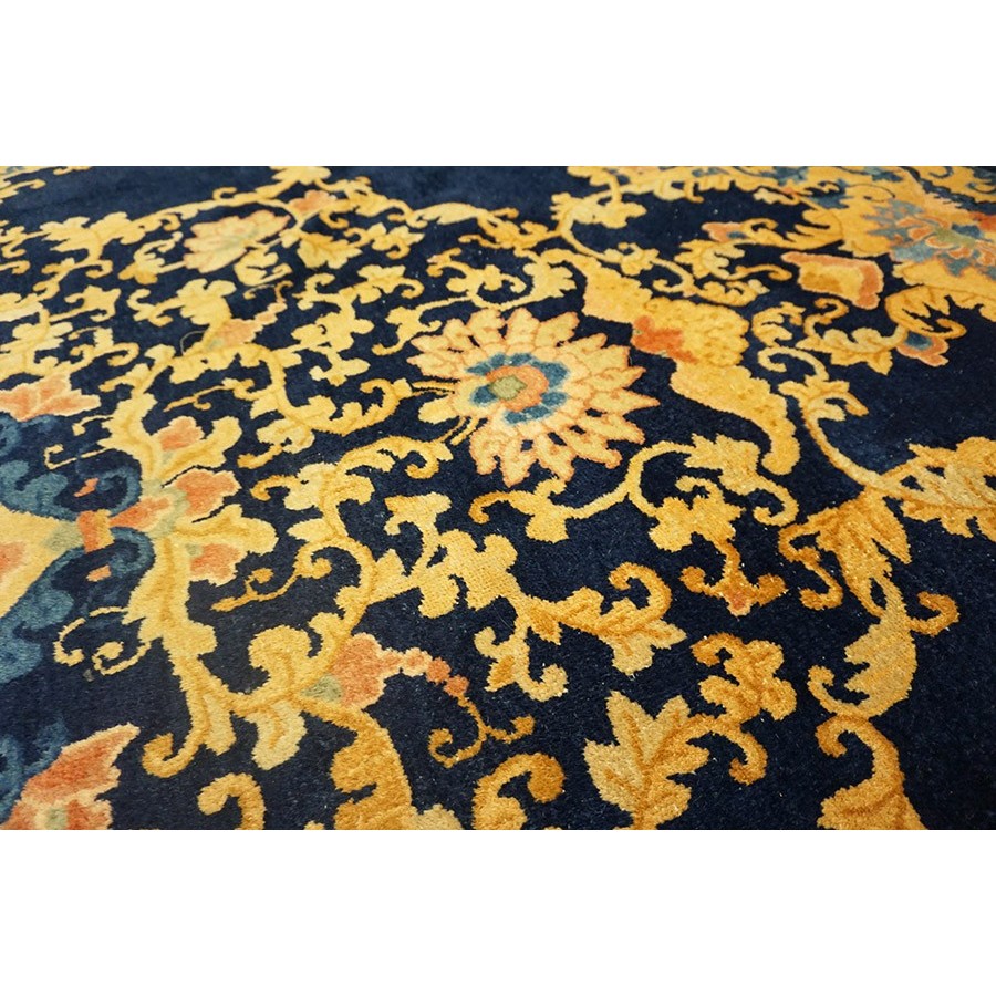 DescriptionChineseCarpets made in China proper. See entries Ningshia, Peking, Art Deco. Chinese - PekingThe commercial Peking carpet is a later 19th century development, begun by importing weaves from Ningshia (see entry) to create and export industry aimed at Western markets. The foundation is cotton and the pile is a good quality carpet wool which takes dyes particularly well. The neat medium weave is in Persian (asymmetric) knots. Designs are strictly Chinese and the whole motif repertoire of Chinese art is employed. Blue and white is the most popular color combination and red is particularly rare. Sizes tend to 9 x 12 and larger, and few small pieces appear. For a short time in the early 1920s Persian designs were woven to capitalize on the death of new Iranian goods. The industry decimated by the Communist Revolution relocated to the Pearl River area. There is a good supply of antique carpets at reasonable prices. | |