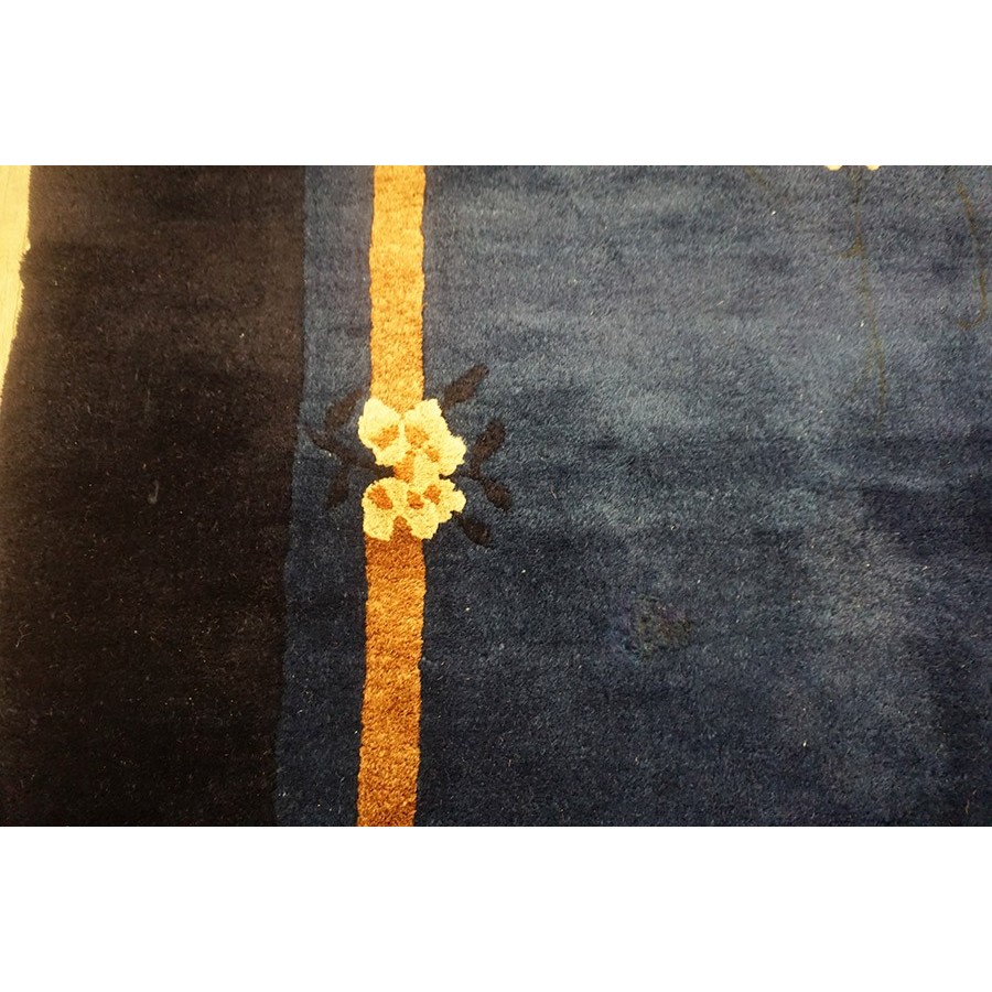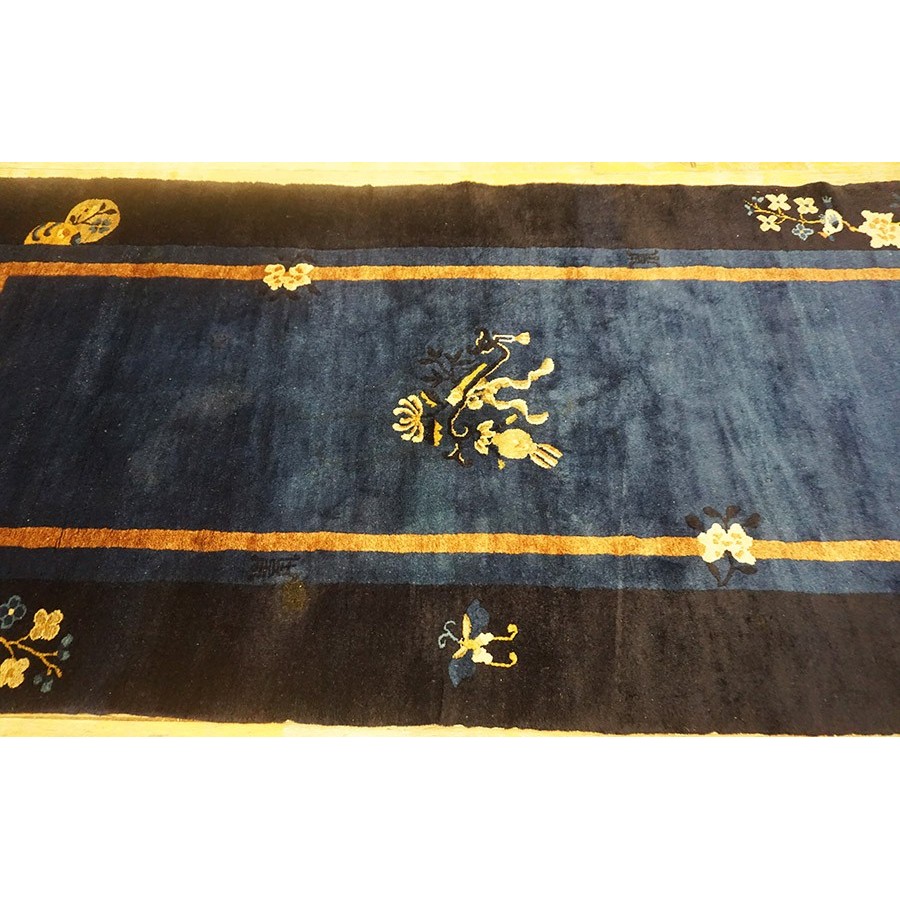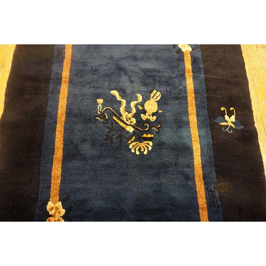 DescriptionChineseCarpets made in China proper. See entries Ningshia, Peking, Art Deco. Chinese - PekingThe commercial Peking carpet is a later 19th century development, begun by importing weaves from Ningshia (see entry) to create and export industry aimed at Western markets. The foundation is cotton and the pile is a good quality carpet wool which takes dyes particularly well. The neat medium weave is in Persian (asymmetric) knots. Designs are strictly Chinese and the whole motif repertoire of Chinese art is employed. Blue and white is the most popular color combination and red is particularly rare. Sizes tend to 9 x 12 and larger, and few small pieces appear. For a short time in the early 1920s Persian designs were woven to capitalize on the death of new Iranian goods. The industry decimated by the Communist Revolution relocated to the Pearl River area. There is a good supply of antique carpets at reasonable prices. | |