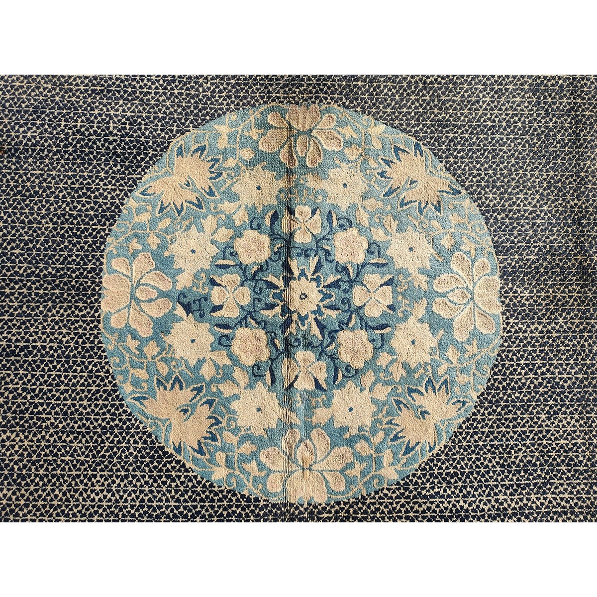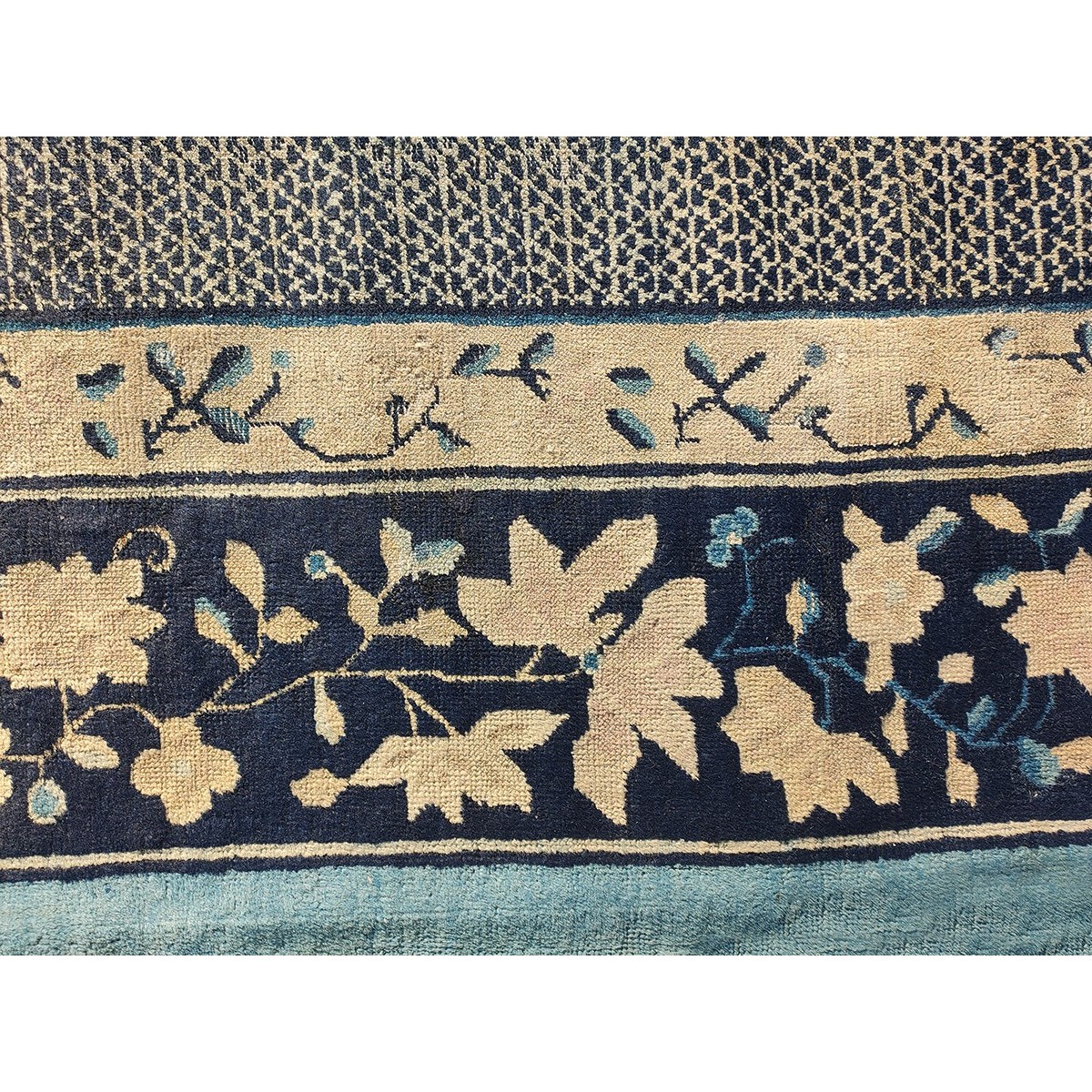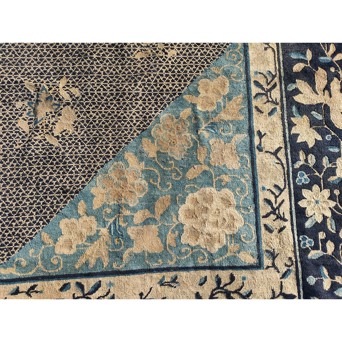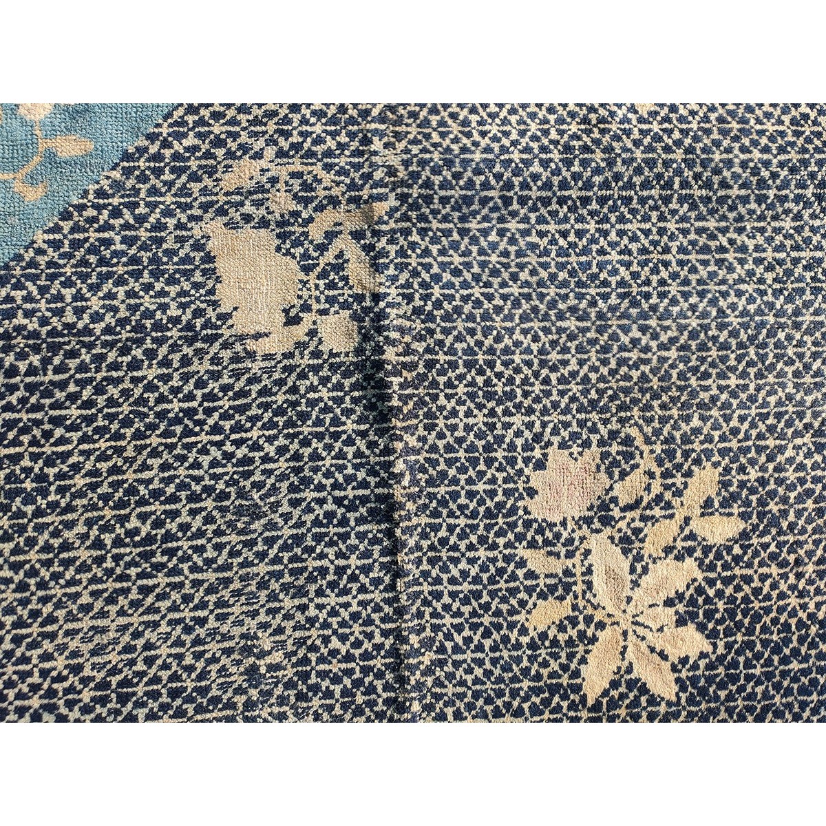 DescriptionChineseCarpets made in China proper. See entries Ningshia, Peking, Art Deco. Chinese - PekingThe commercial Peking carpet is a later 19th century development, begun by importing weaves from Ningshia (see entry) to create and export industry aimed at Western markets. The foundation is cotton and the pile is a good quality carpet wool which takes dyes particularly well. The neat medium weave is in Persian (asymmetric) knots. Designs are strictly Chinese and the whole motif repertoire of Chinese art is employed. Blue and white is the most popular color combination and red is particularly rare. Sizes tend to 9 x 12 and larger, and few small pieces appear. For a short time in the early 1920s Persian designs were woven to capitalize on the death of new Iranian goods. The industry decimated by the Communist Revolution relocated to the Pearl River area. There is a good supply of antique carpets at reasonable prices. | |