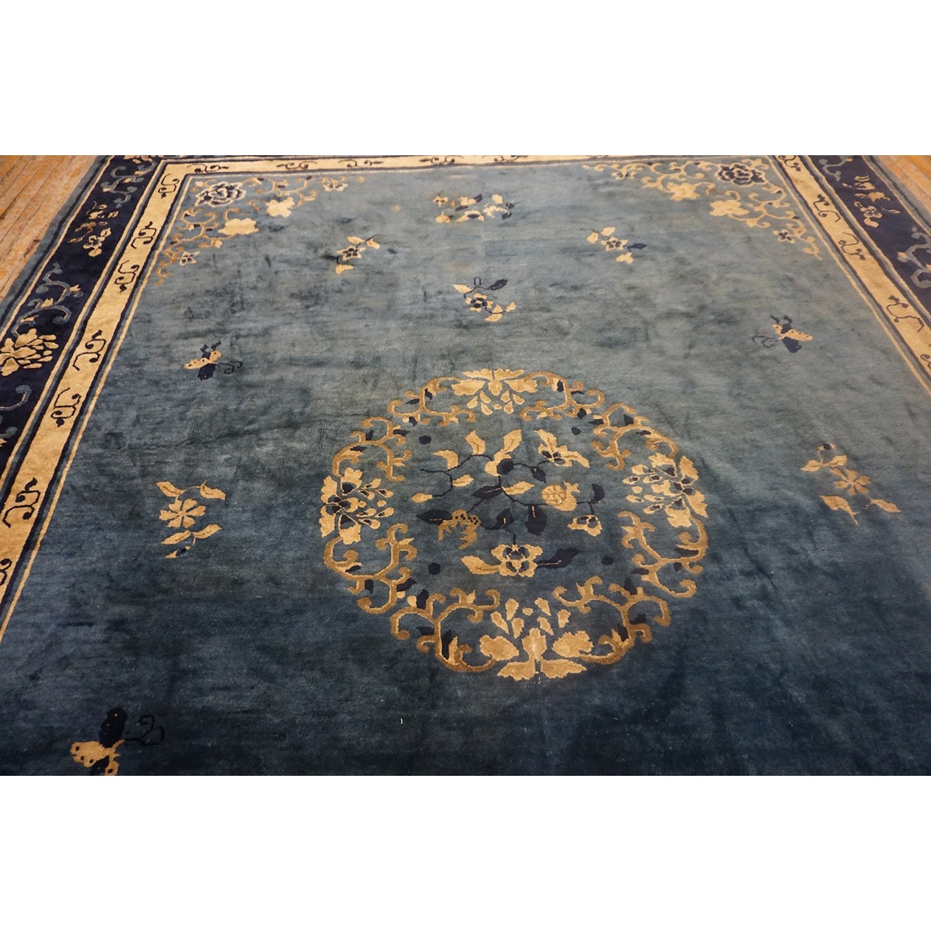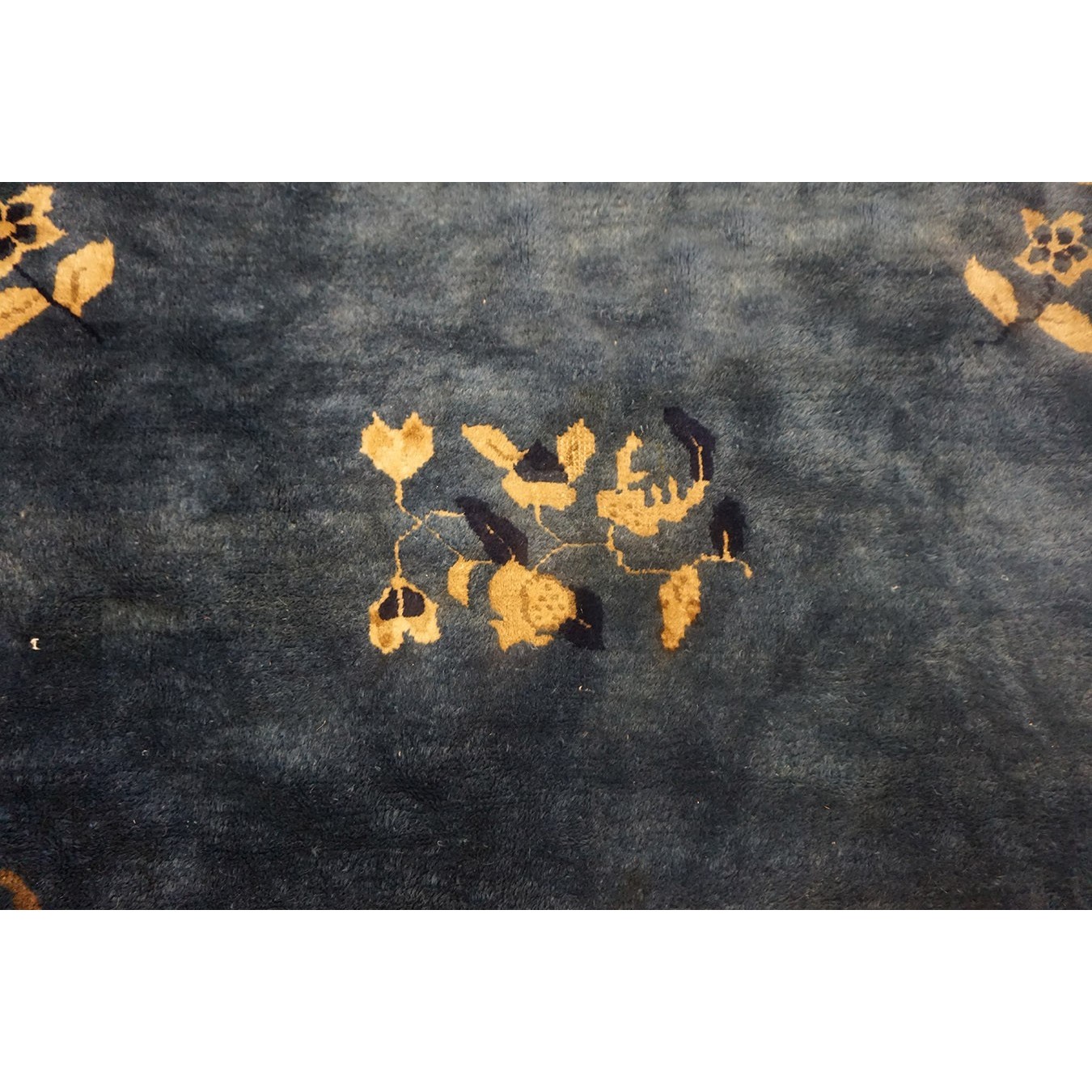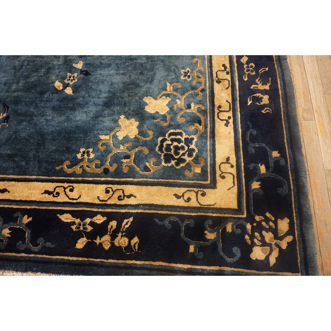 DescriptionChineseCarpets made in China proper. See entries Ningshia, Peking, Art Deco. Chinese - PekingThe commercial Peking carpet is a later 19th century development, begun by importing weaves from Ningshia (see entry) to create and export industry aimed at Western markets. The foundation is cotton and the pile is a good quality carpet wool which takes dyes particularly well. The neat medium weave is in Persian (asymmetric) knots. Designs are strictly Chinese and the whole motif repertoire of Chinese art is employed. Blue and white is the most popular color combination and red is particularly rare. Sizes tend to 9 x 12 and larger, and few small pieces appear. For a short time in the early 1920s Persian designs were woven to capitalize on the death of new Iranian goods. The industry decimated by the Communist Revolution relocated to the Pearl River area. There is a good supply of antique carpets at reasonable prices. | |