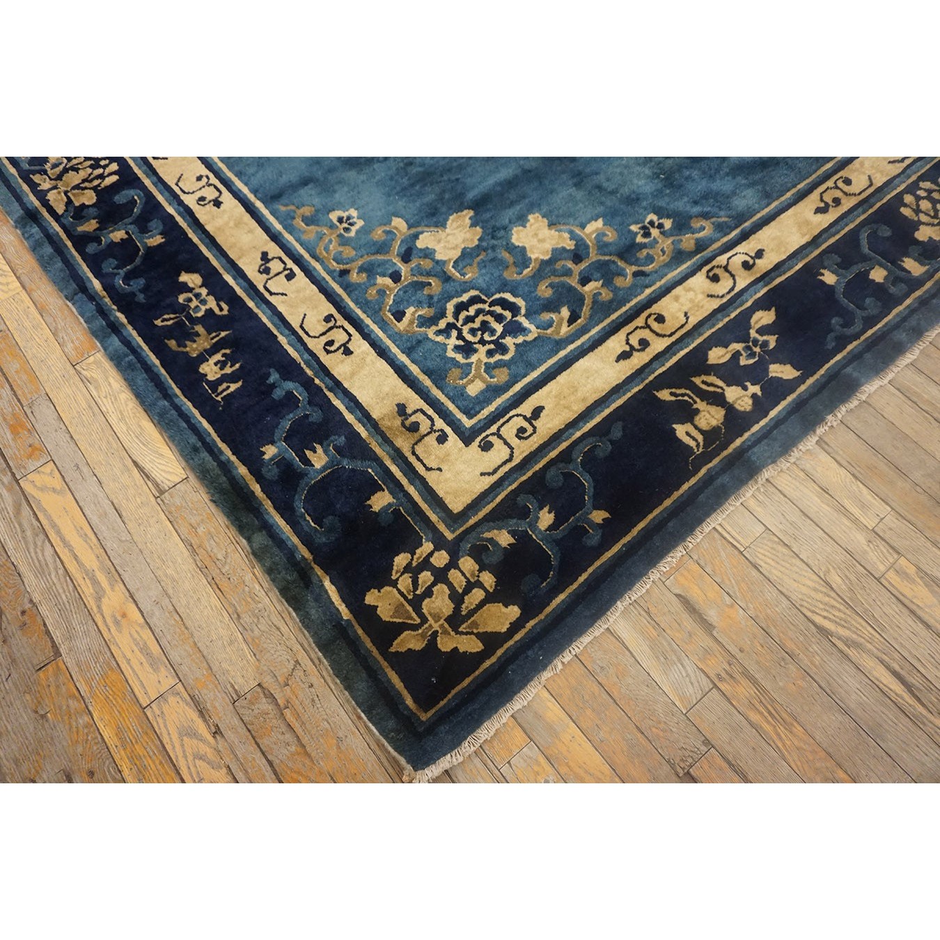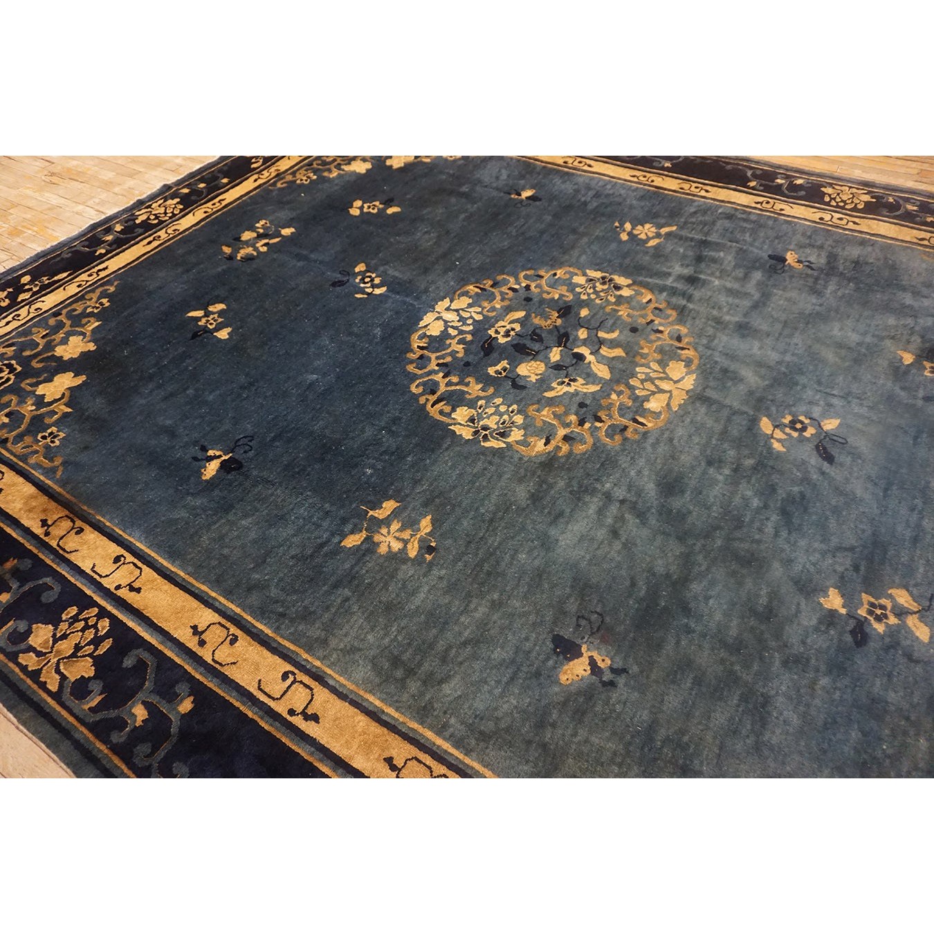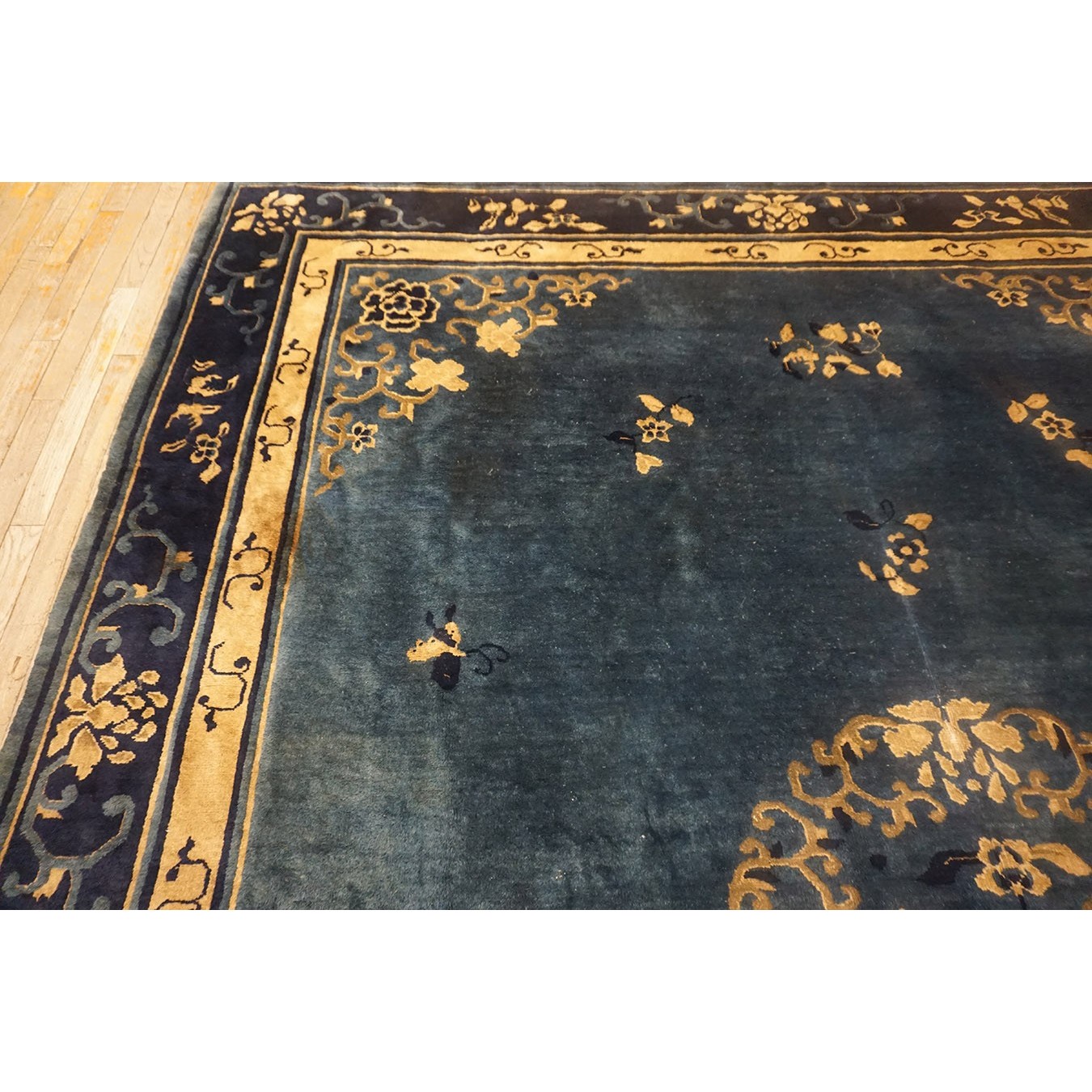 DescriptionChineseCarpets made in China proper. See entries Ningshia, Peking, Art Deco. Chinese - PekingThe commercial Peking carpet is a later 19th century development, begun by importing weaves from Ningshia (see entry) to create and export industry aimed at Western markets. The foundation is cotton and the pile is a good quality carpet wool which takes dyes particularly well. The neat medium weave is in Persian (asymmetric) knots. Designs are strictly Chinese and the whole motif repertoire of Chinese art is employed. Blue and white is the most popular color combination and red is particularly rare. Sizes tend to 9 x 12 and larger, and few small pieces appear. For a short time in the early 1920s Persian designs were woven to capitalize on the death of new Iranian goods. The industry decimated by the Communist Revolution relocated to the Pearl River area. There is a good supply of antique carpets at reasonable prices. | |