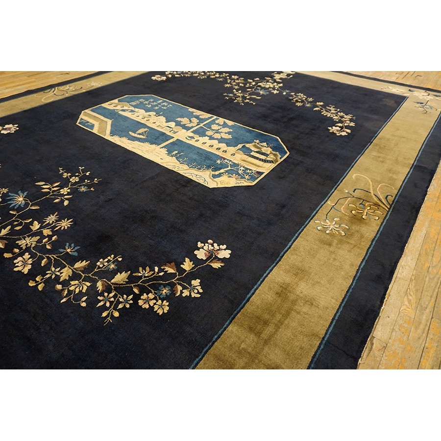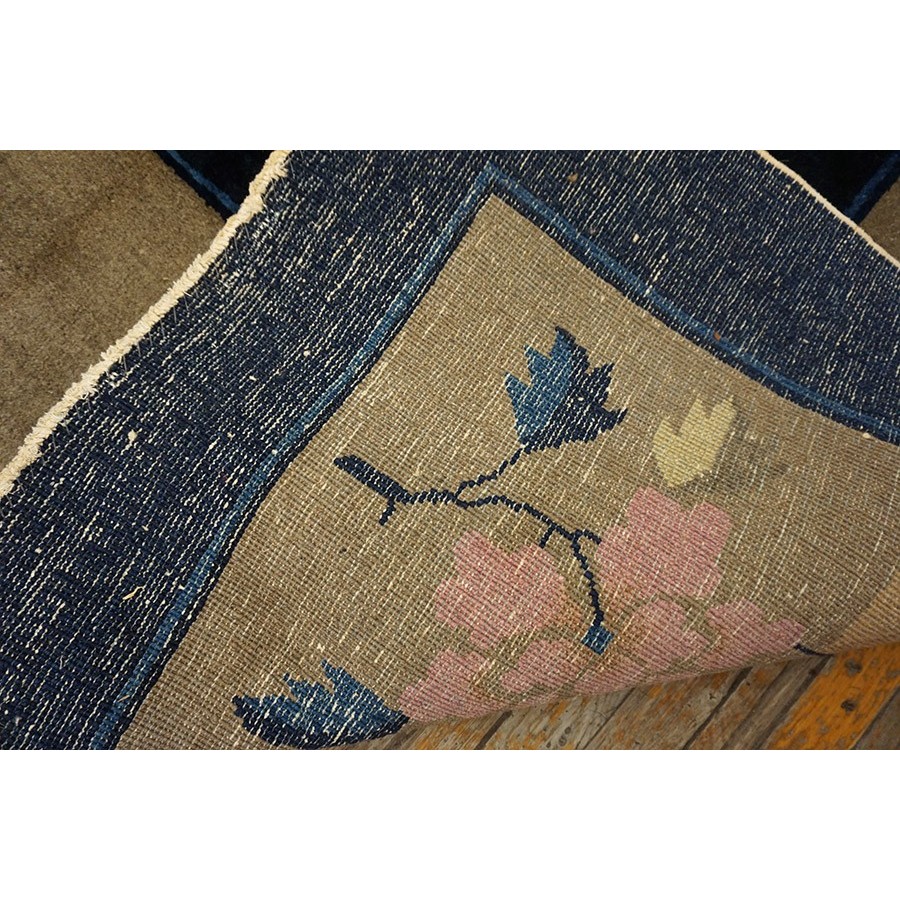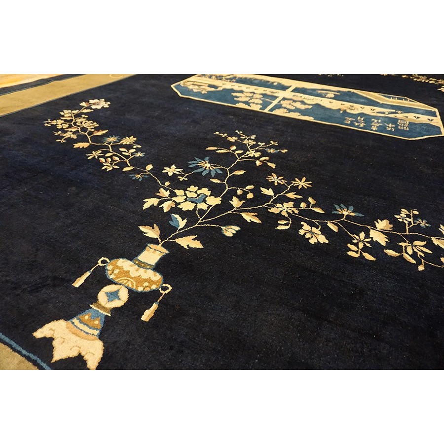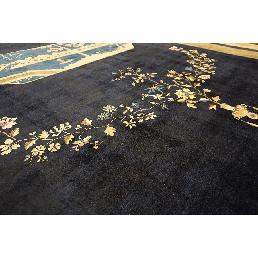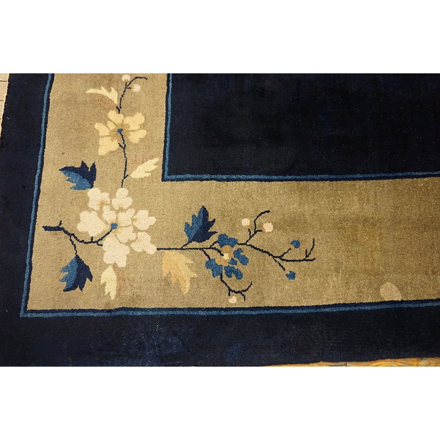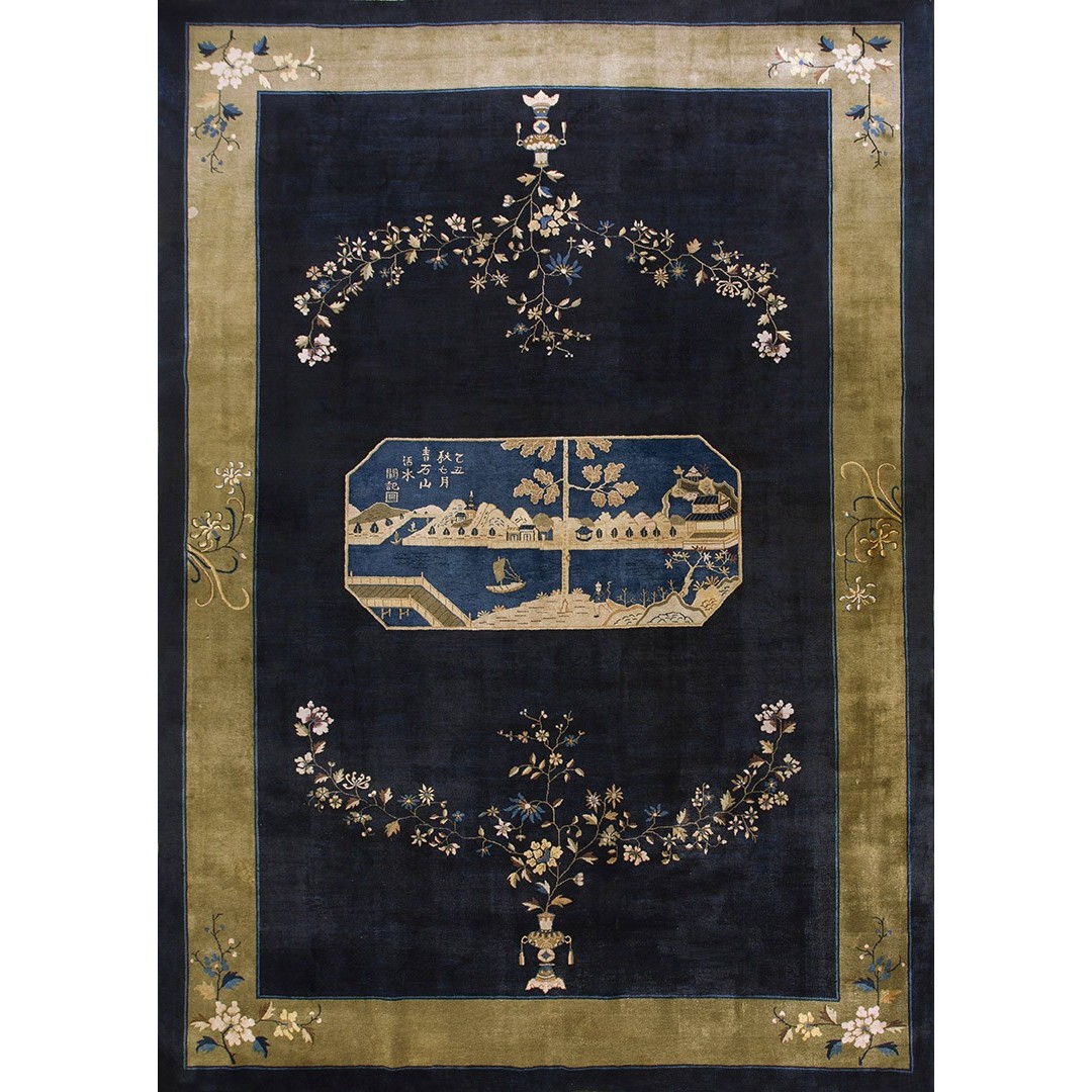 DescriptionChineseCarpets made in China proper. See entries Ningshia, Peking, Art Deco. Chinese - PekingThe commercial Peking carpet is a later 19th century development, begun by importing weaves from Ningshia (see entry) to create and export industry aimed at Western markets. The foundation is cotton and the pile is a good quality carpet wool which takes dyes particularly well. The neat medium weave is in Persian (asymmetric) knots. Designs are strictly Chinese and the whole motif repertoire of Chinese art is employed. Blue and white is the most popular color combination and red is particularly rare. Sizes tend to 9 x 12 and larger, and few small pieces appear. For a short time in the early 1920s Persian designs were woven to capitalize on the death of new Iranian goods. The industry decimated by the Communist Revolution relocated to the Pearl River area. There is a good supply of antique carpets at reasonable prices. | |